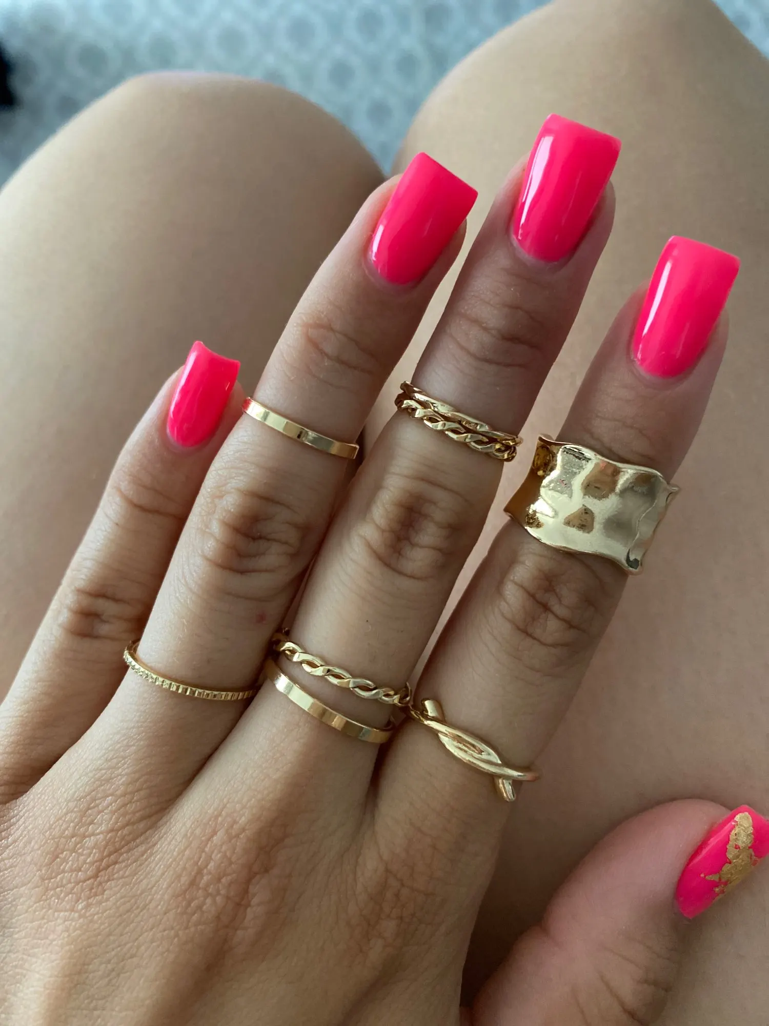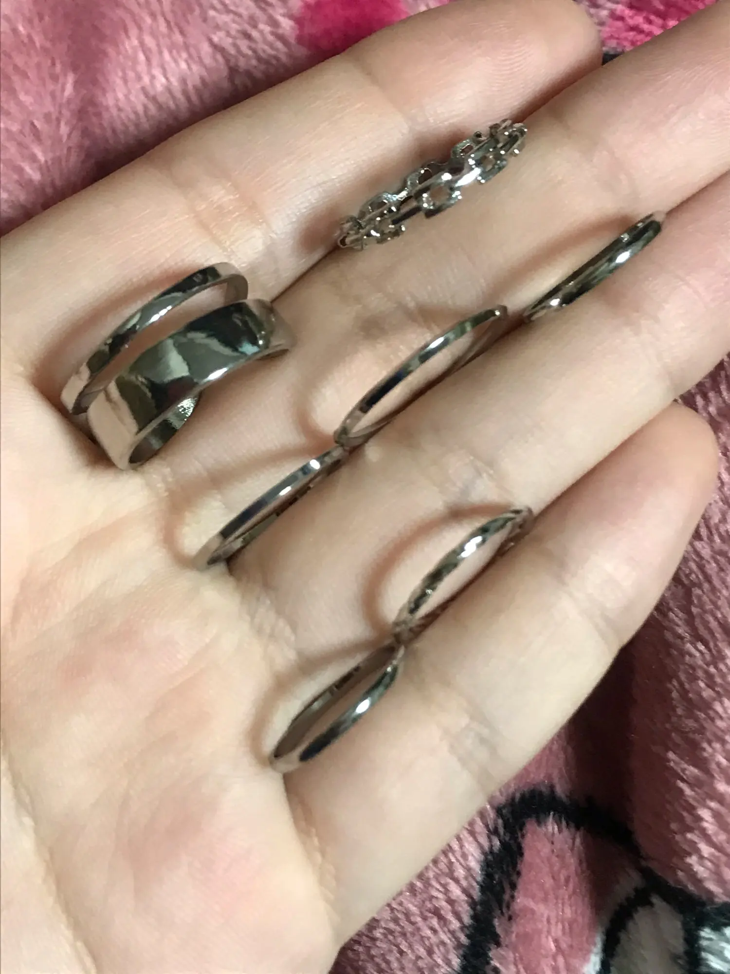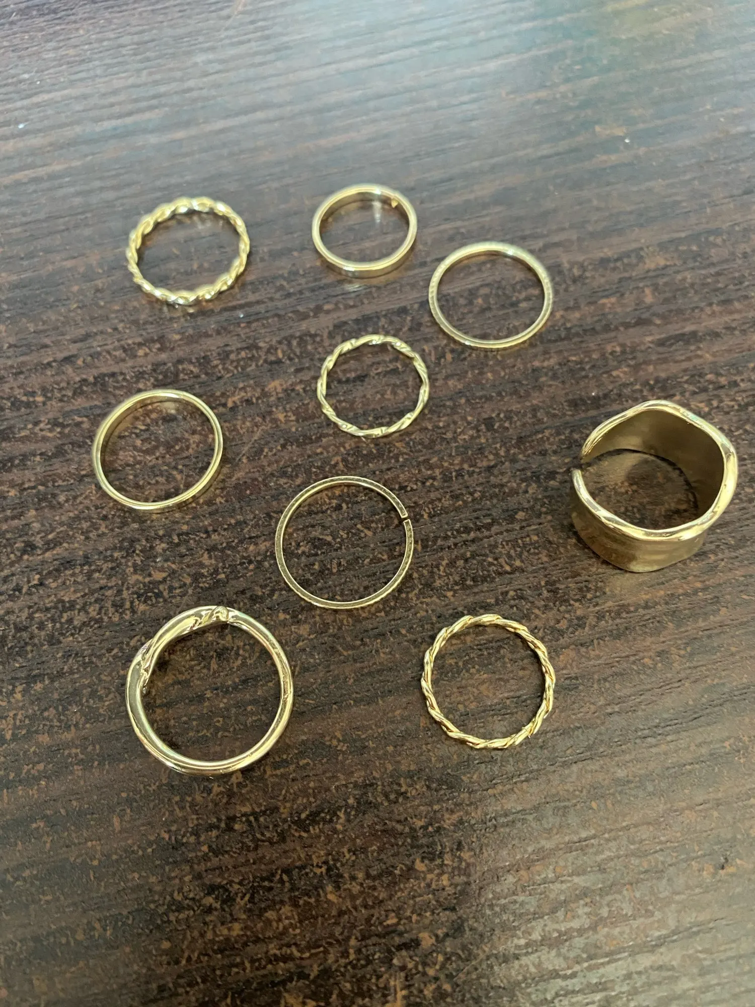 Кольца выглядят очаровательно, убедитесь, что вы отложили Базовый лак для ногтей, чтобы сохранить золото дольше. Хотя кольца красивые, только два-три из них проходят весь путь вниз, а остальные нет, Я думаю, что это моя единственная жалоба, что они маленькие, хотя я все еще Планирую носить их