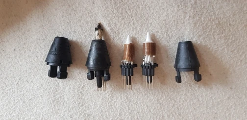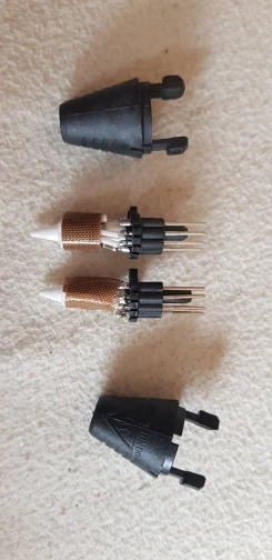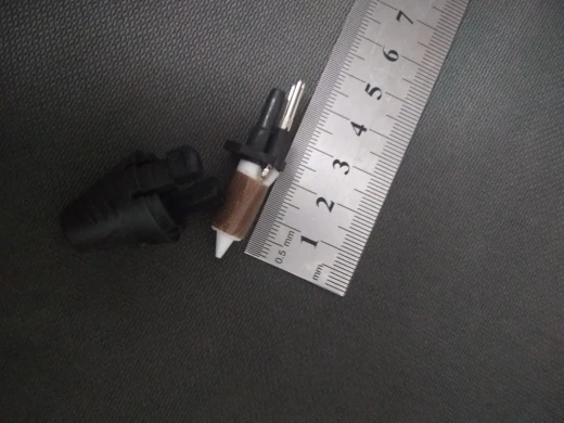 Пришло через 3 недели после заказа в 23 регион, доставка почтой РФ, параллельно заказал ещё один у другого продавца. Пришли оба в 1 посылке. Носик пришёл в разобранном виде в пвх пакете, один контакт был загнут, поправил тонкогубцами. Сам носик похож на оригинал, но контакты чуть короче, но к нашей 3д ручке подошёл (1 и 4 фото). Проверили, работает, но вот греется по-моему чуть дольше, чем предыдущий. На 2 и 3 фото сравнение с носиками от другого продавца и сломанным оригинальным.