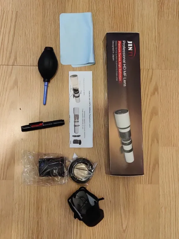 Телеобъектив JINTU 500 мм x 12x конвертер объектива x 1Т-образный адаптер x 1Передняя и задняя крышка объектива x 1JINTU 5 лет гарантии,Чехол для объектива JINTU x 167 мм УФ-фильтр x 1Беспроводной ИК-инфракрасный пульт дистанционного управления x 13 в 1 Набор для очистки-ручка для объектива, воздуходувка, щетка для пыли x 1
