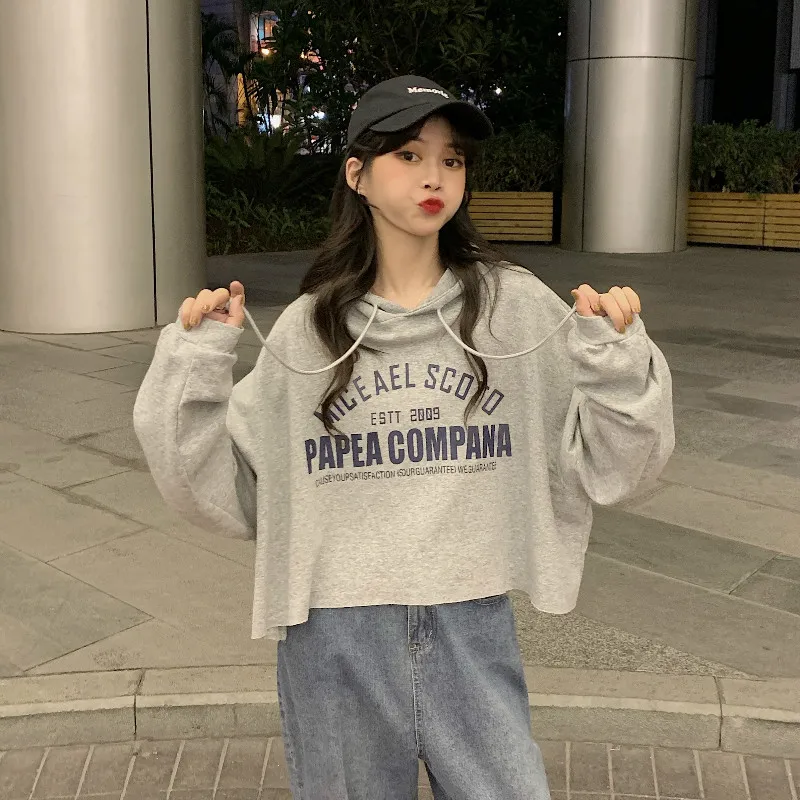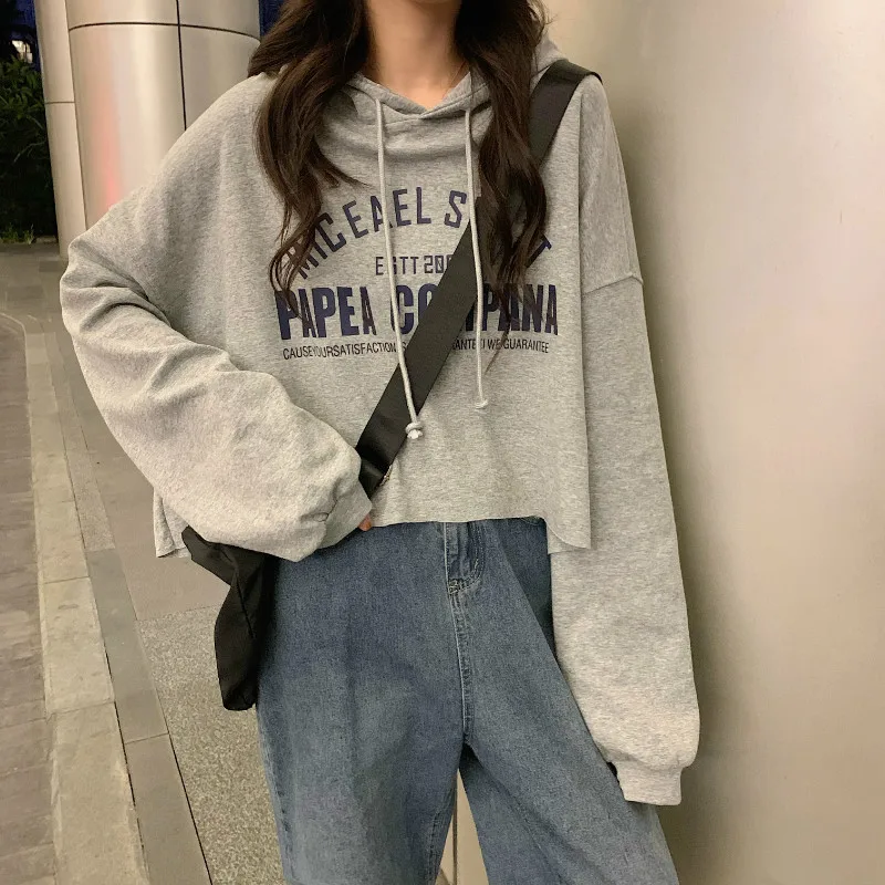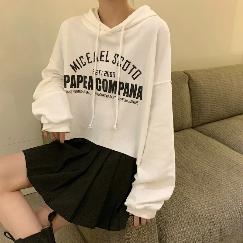 Hoodies Women Letter-printed Hooded Cropped Tunic Long Sleeves Student Unisex Kpop Ulzzang Autumn Clothes Loose Cute Fashion Ins