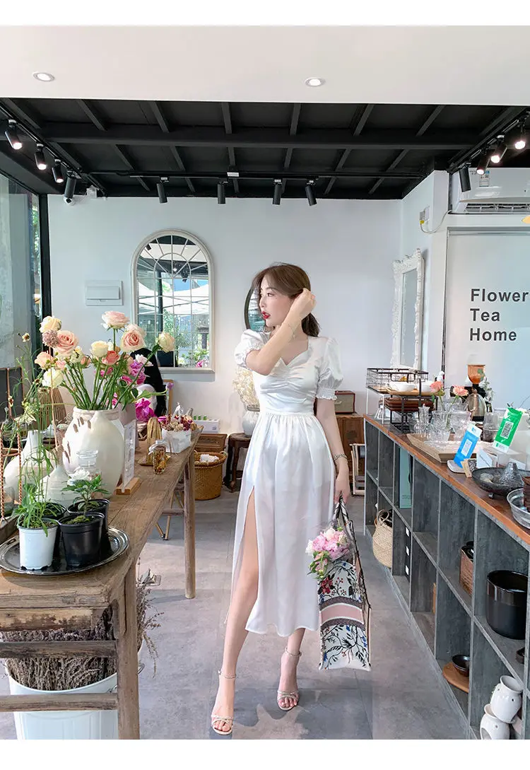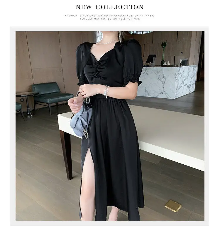Женское шифоновое платье, элегантное офисное платье с разрезом и рукавами-фонариками, в Корейском стиле, для лета