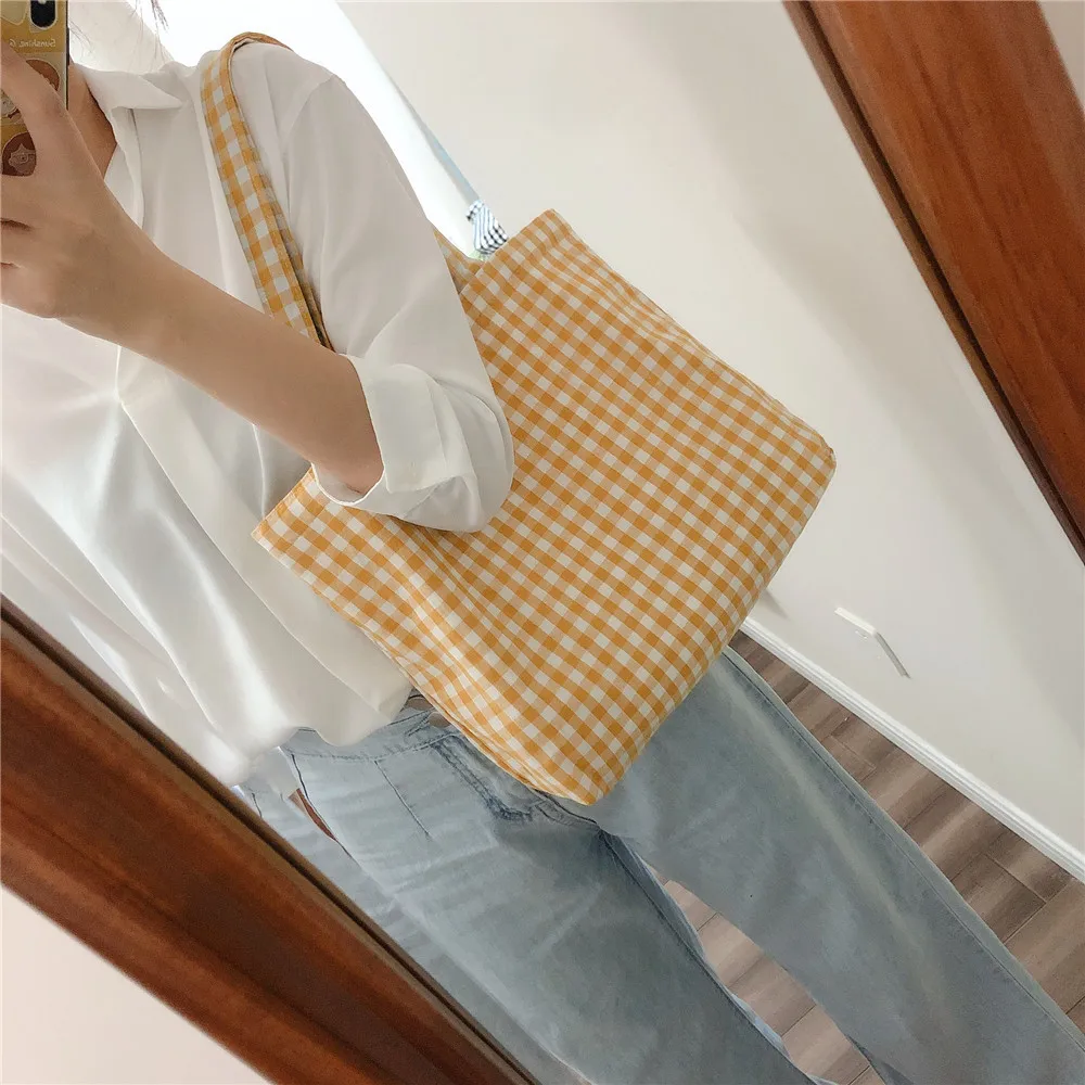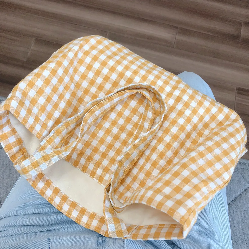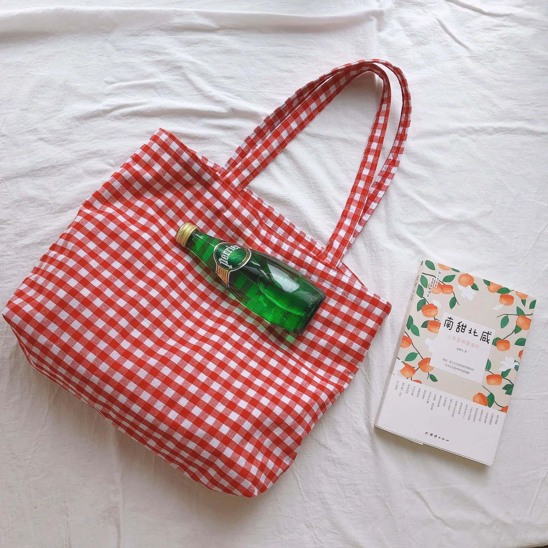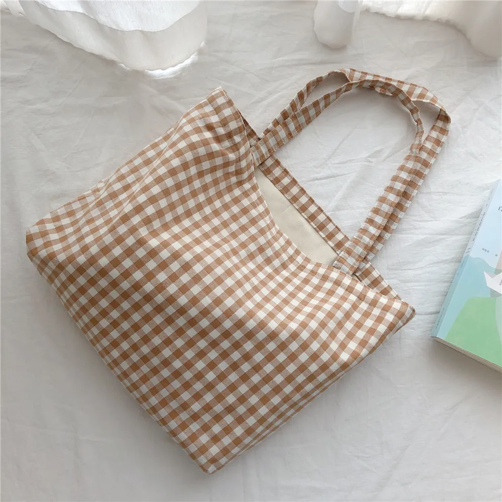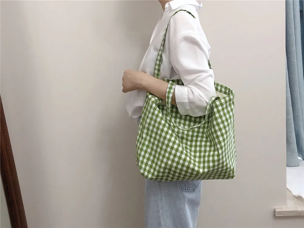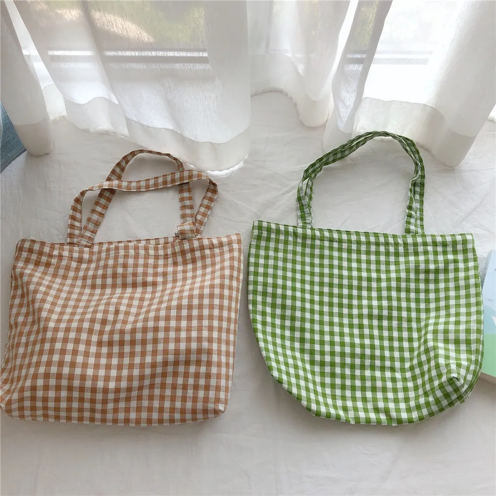 Модная Повседневная хлопковая клетчатая сумка на плечо, экологически прочная тканевая многоразовая сумка для покупок с короткими ручками для женщин, дорожная сумка