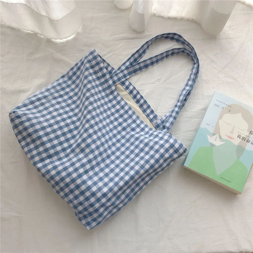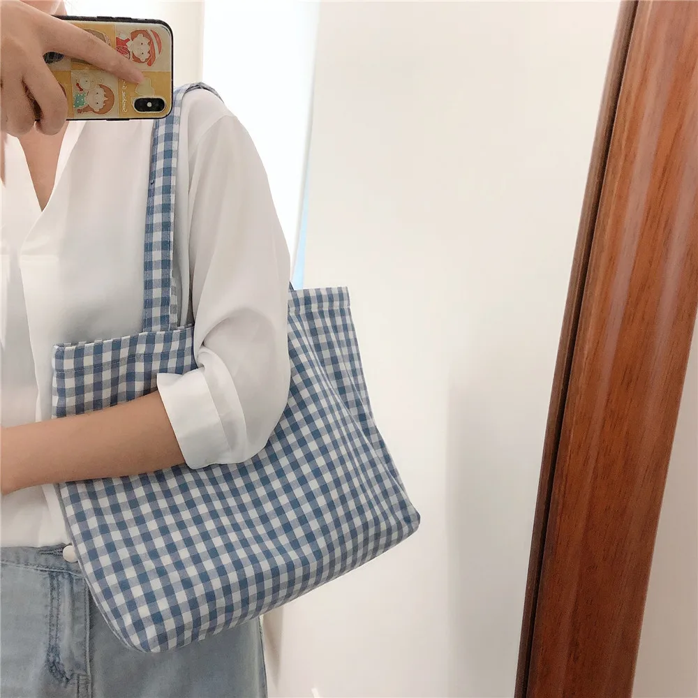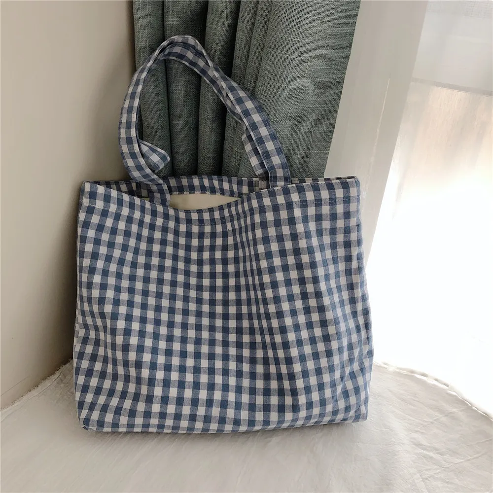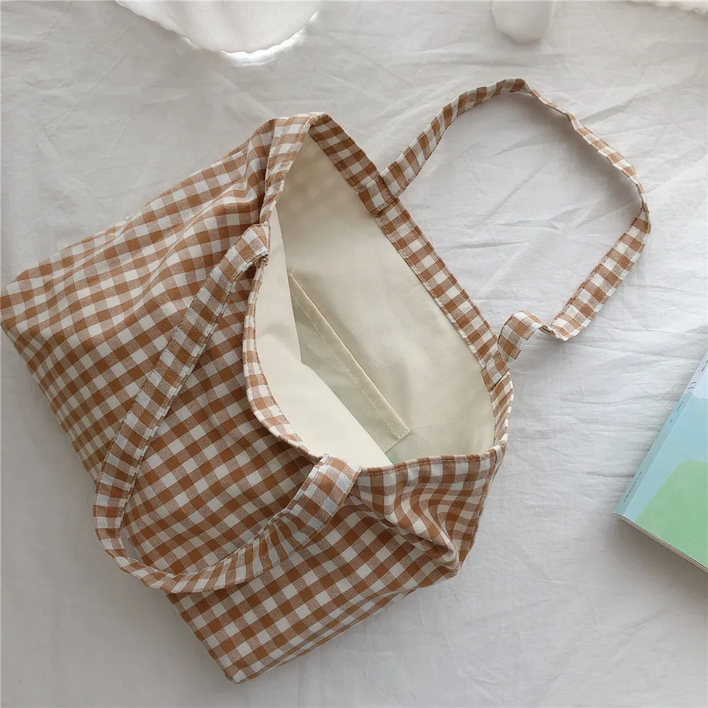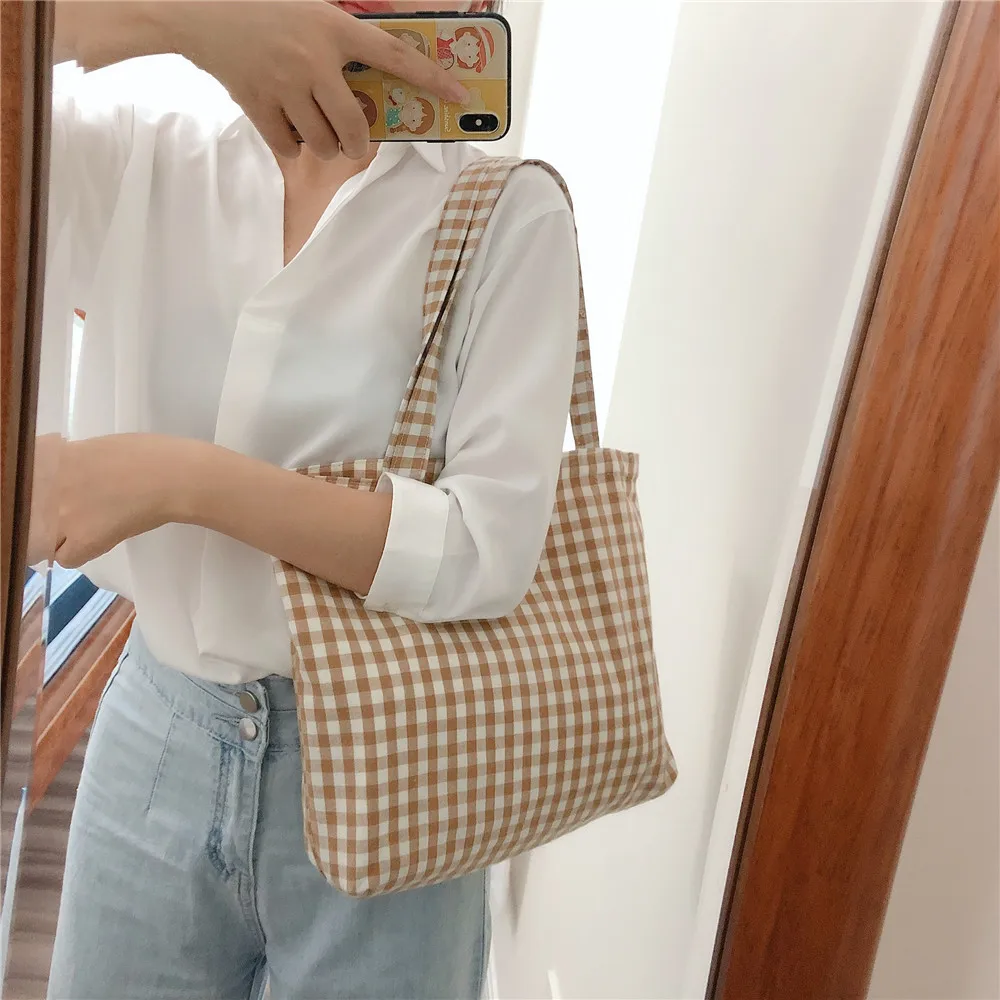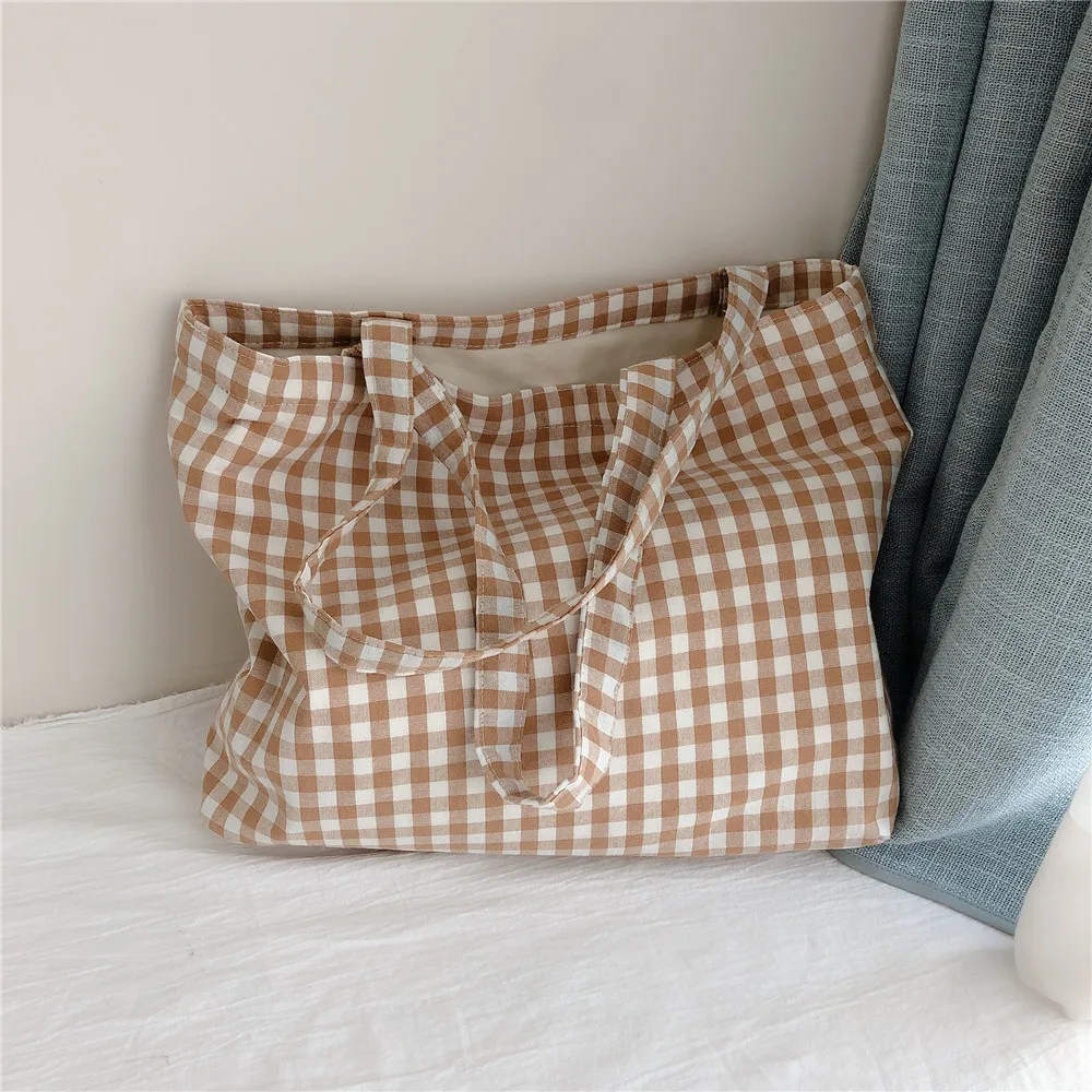 Модная Повседневная хлопковая клетчатая сумка на плечо, экологически прочная тканевая многоразовая сумка для покупок с короткими ручками для женщин, дорожная сумка
