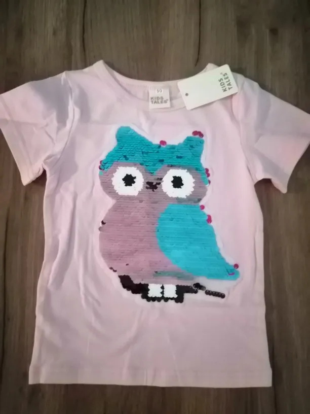 Симпатичная футболочка, двусторонний рисунок, только очень плотный и по краям видна сильно марля, на которую приклеены паетки. Стирку в машинке наизнанку прошла без потерь