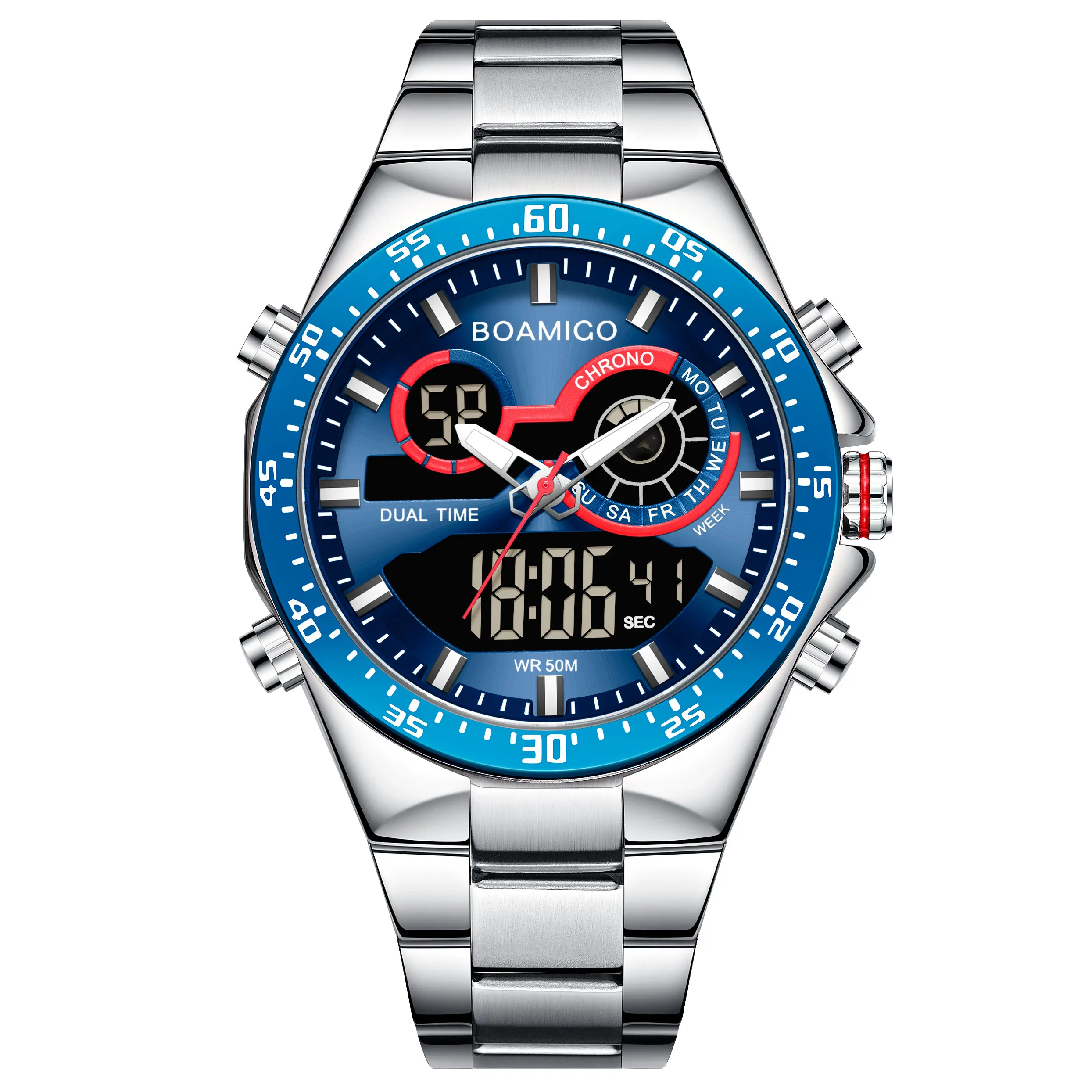 Мужские наручные часы BOAMIGO, синие Цифровые кварцевые часы из нержавеющей стали, водонепроницаемые спортивные часы с хронографом, 2020