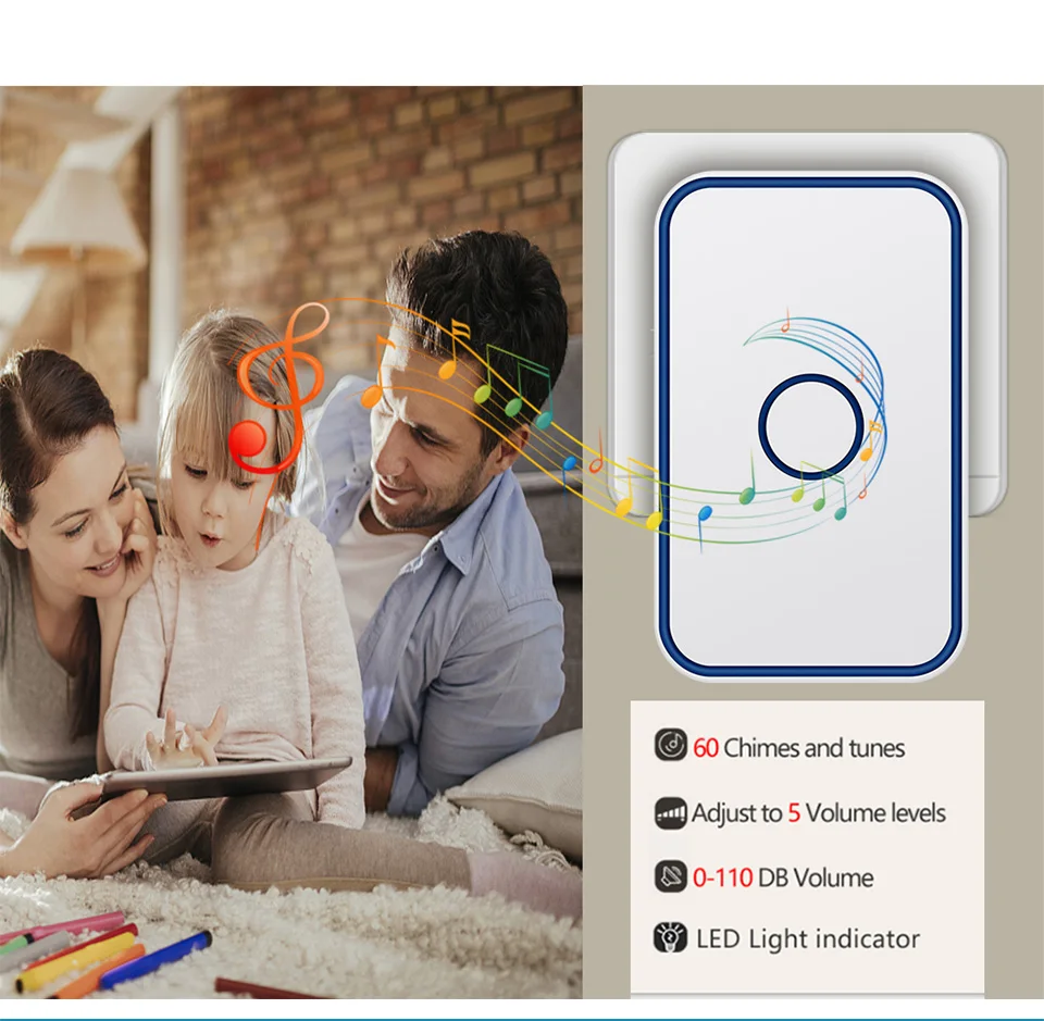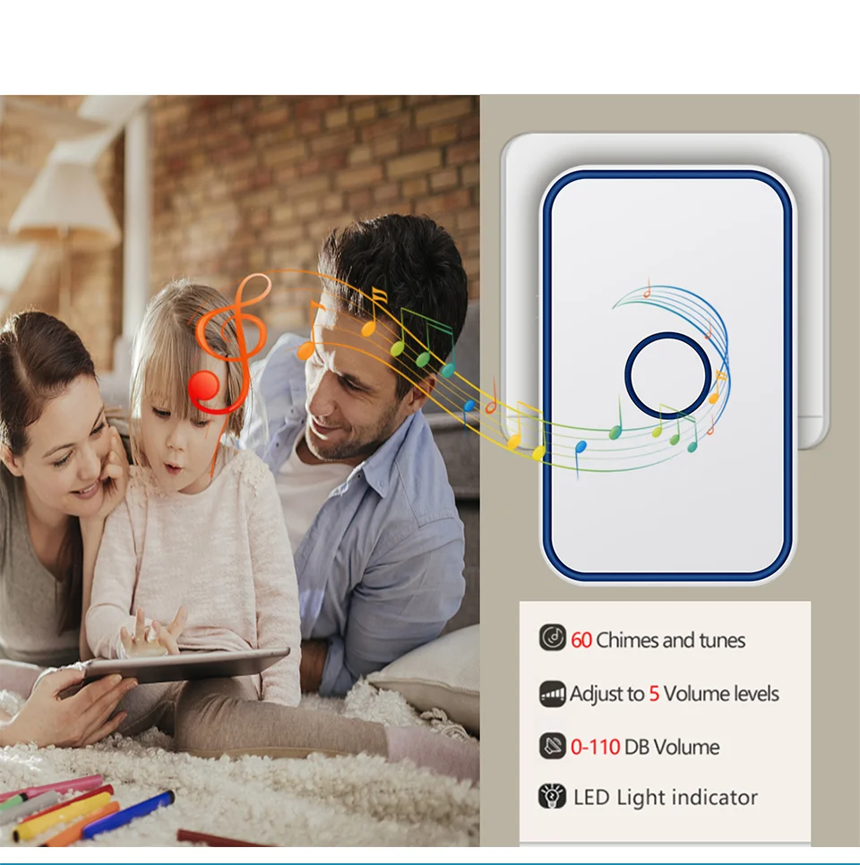 Подключите розетку питания, нажмите кнопку музыки, чтобы настроить любимый Мелодия звонка, нажмите и удерживайте кнопку громкости, пока не загорится свет, дважды нажмите на передатчик, и музыка успешно заблокирована.
