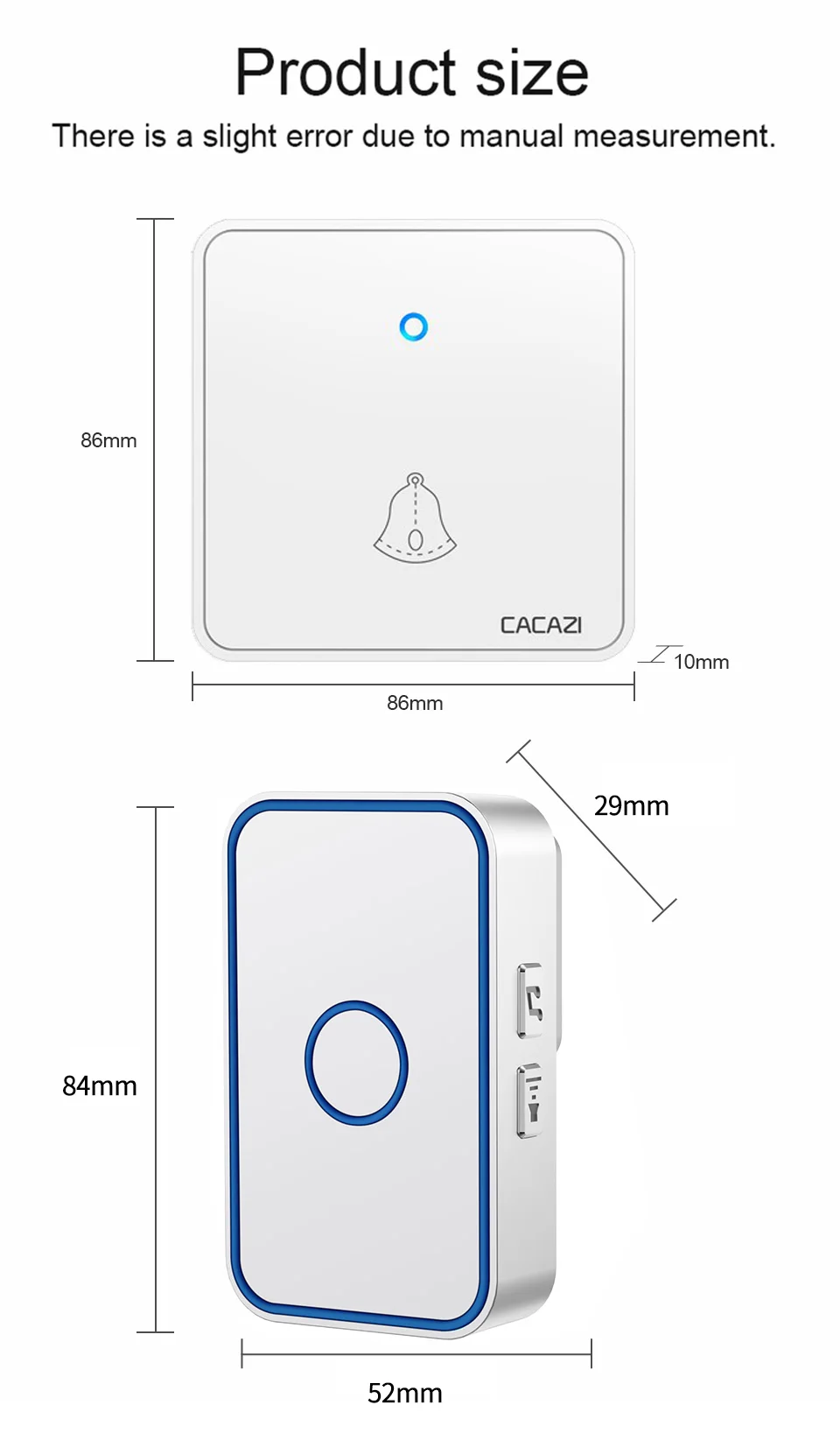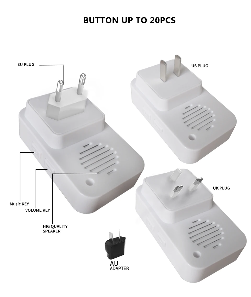 1. Кнопка поддерживает до 8 шт., а приемник-до 100 шт. 2. Если несколько кнопок сопряжены с одним или несколькими приемниками в одной системе, каждая кнопка может быть настроена на другой рингтон. 3. Функция памяти при отключении питания: Включите питание снова после выключения, нет необходимости повторно настраивать и блокировать рингтон. 4. Передатчик не имеет резьбового патрона, он может быть водонепроницаемым и пыленепроницаемым без резиновых колец. 5. В передатчике используется щелочная батарея CR2032 (батарея в комплект не входит). 6. Напряжение приемника: 110-240 В. 7. Приемник доступен в различных вариантах вилок, вилок US/EU/UK и адаптеров AU, подходящих для большинства стран. 8. Дальность Приема: 300 метров на открытой местности. 9. На беспроводной сигнал будут влиять препятствия. Чем больше препятствий, тем серьезнее потеря сигнала. 10. Приемник имеет 5 уровней (можно отключить звук) 0-110 дБ, 60 музыки на выбор. 11. Размер: передатчик 86x86x10 мм, приемник 84x52x29 мм. Примечание: Кнопку нельзя установить на железную дверь, так как она будет мешать сигналу.