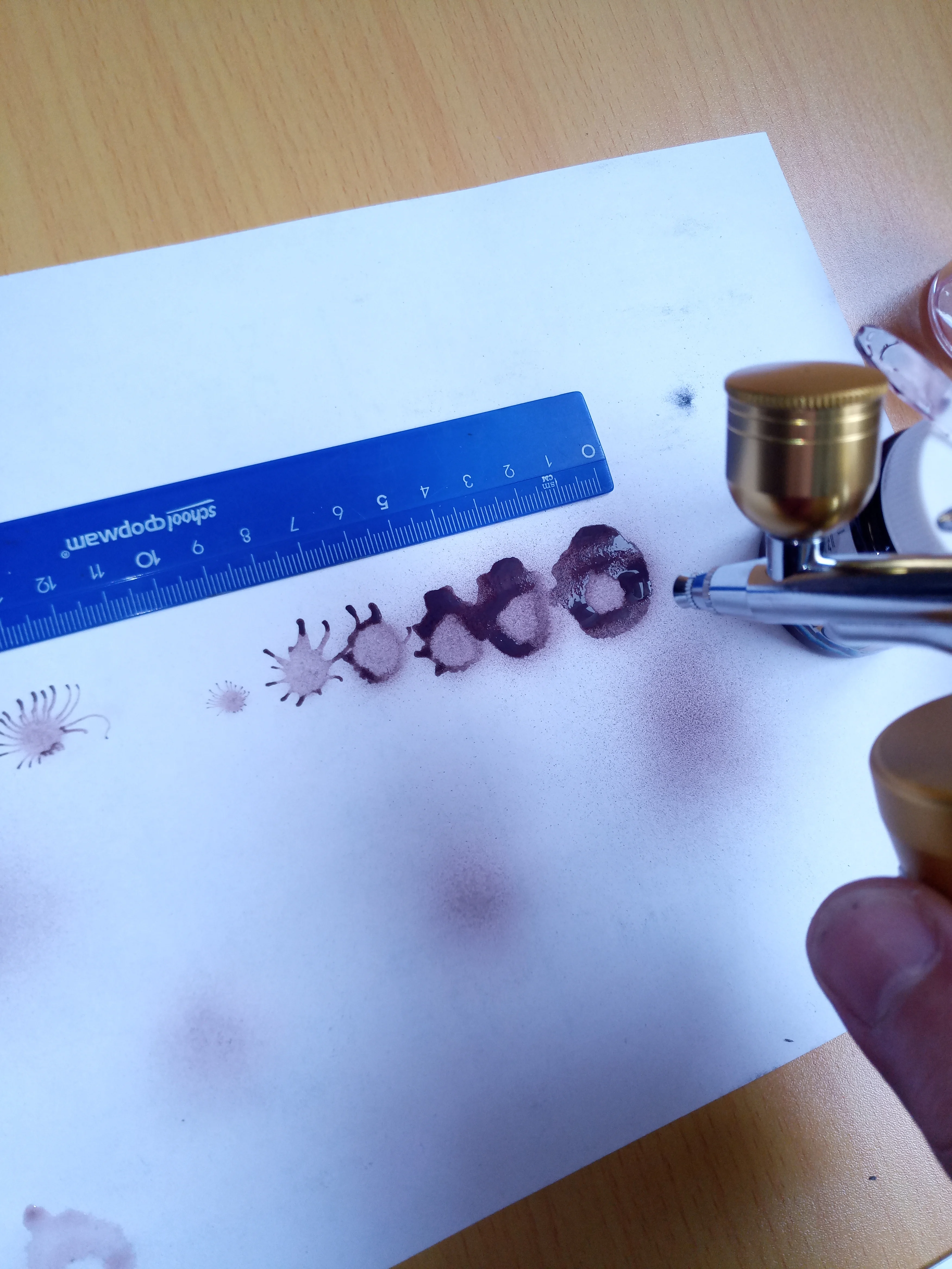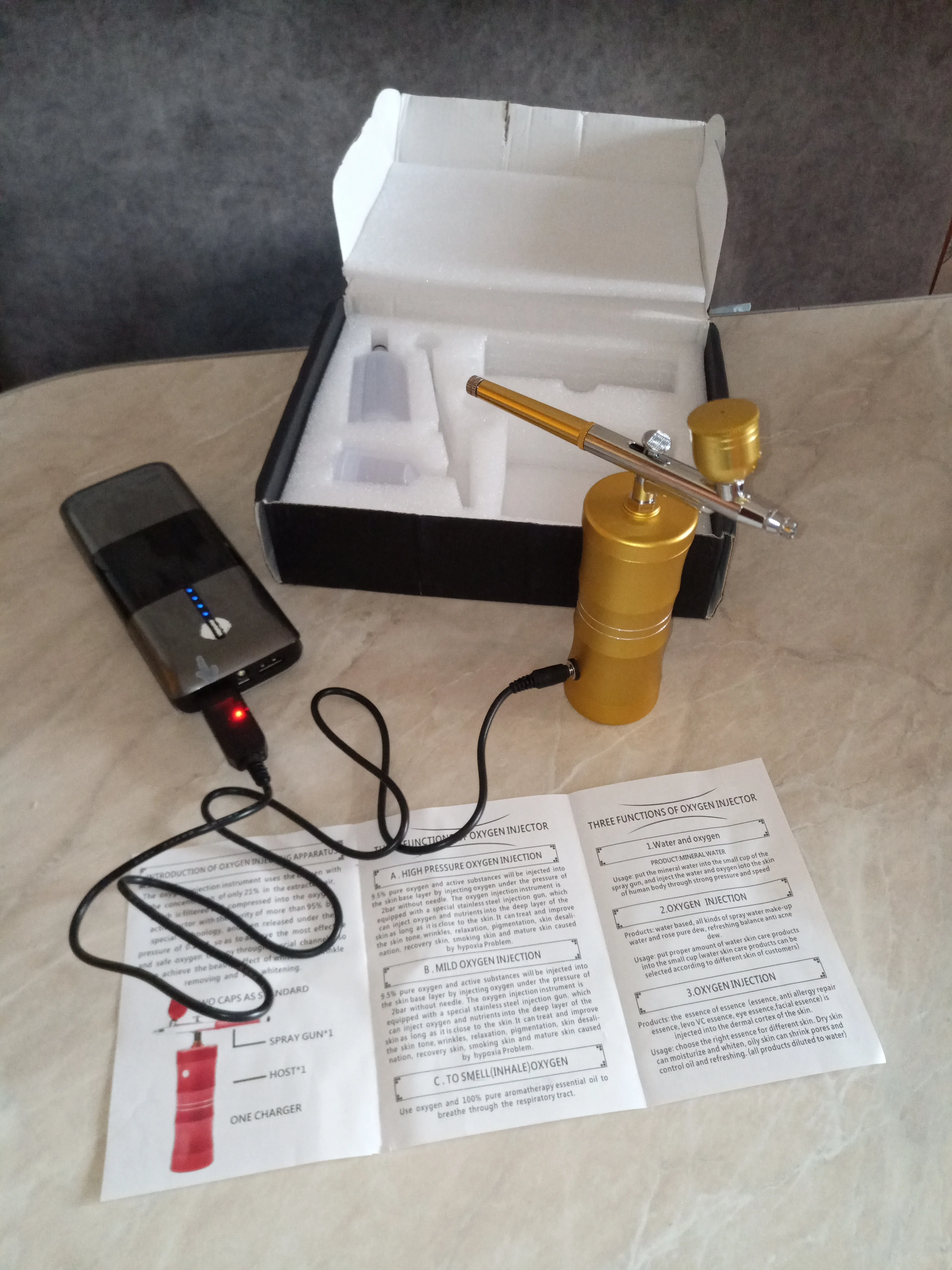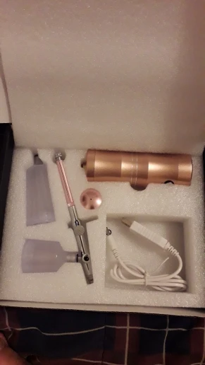 Доставка в Брест, Беларусь - 20 дней. Упаковка заводская плюс в почтовый конверт с пузырчаткой. Зарядился встроенный аккумулятор за 15 минут и цвет светодиода поменялся с красного на зеленый (смотри фото). При нажатии кнопки включился внутренний насос, из сопла начал выходить воздух, а при сдвиге кнопки управления в поток воздуха поступает содержимое сменного контейнера (краска или жидкий крем). Слой очень тонкий, иначе расползается. Диаметр пятна регулируется ручкой, от 5 до 25 мм на расстоянии 5 см. Для рисования тонких линий не годится. Примерно за 15 минут работы в течение часа аккумулятор выключился, пришлось снова поставить заряжаться. Для домашнего редкого пользования этот аэрограф использовать можно, а в салоне красоты или гараже к нему нужен помощнее компрессор, например колесный на 12В или сетевой маленький.