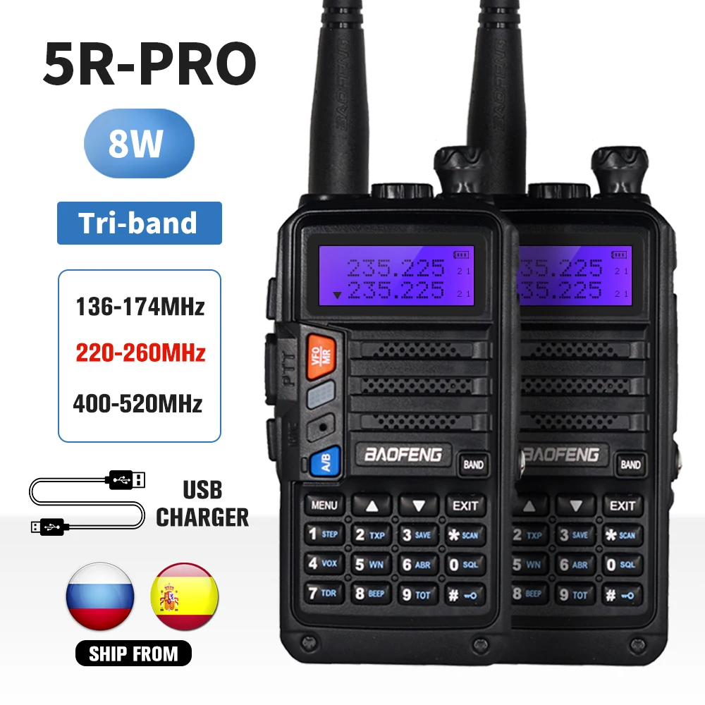 UV-5R Pro is tri-band ,136-174 МГц, 200-260 МГц (специальная антенна),400-530 МГц1.Baofeng UV-5R Pro трехдиапазонный 136-174 МГц/220-260 МГц/400-520 МГц, с 2 х антенной (одна специально для 220-260 МГц)2.Baofeng UV-5R Pro Tri-Band-это мощная рация мощностью 8 Вт. С дополнительными способами зарядки аккумулятора. Но стандарт не включает usb-кабель и автомобильное зарядное устройство. Если вы хотите купить Сопутствующие аксессуары, вы можете купить его по приведенной выше информации. И вы можете связаться с нами.