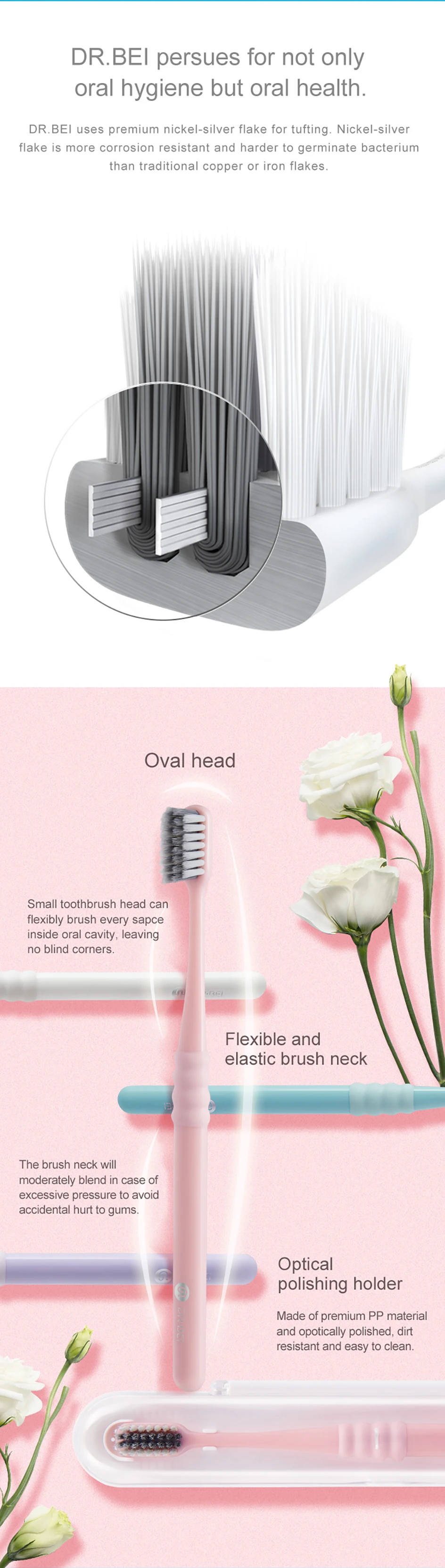 DR.BEI использует премиум никель-серебро чешуйки для tufting. Никелево-серебристые чешуйки более устойчивы к коррозии и прочнее проращивают бактерии, чем традиционные медные или железные хлопья.Овальная головкаМаленькая головка зубной щетки может гибко чистить каждую насадку внутри полости рта, не оставляя слепых угловГибкая и эластичная кисть для шеиЧехол с круглым вырезом в умеренном размереЧрезмерное давление, чтобы избежать случайного повреждения десен.ОптическийПолировальный держательИзготовлен из высококачественного полипропиленового материала и оптически полирован, устойчив к загрязнениям и легко моется.