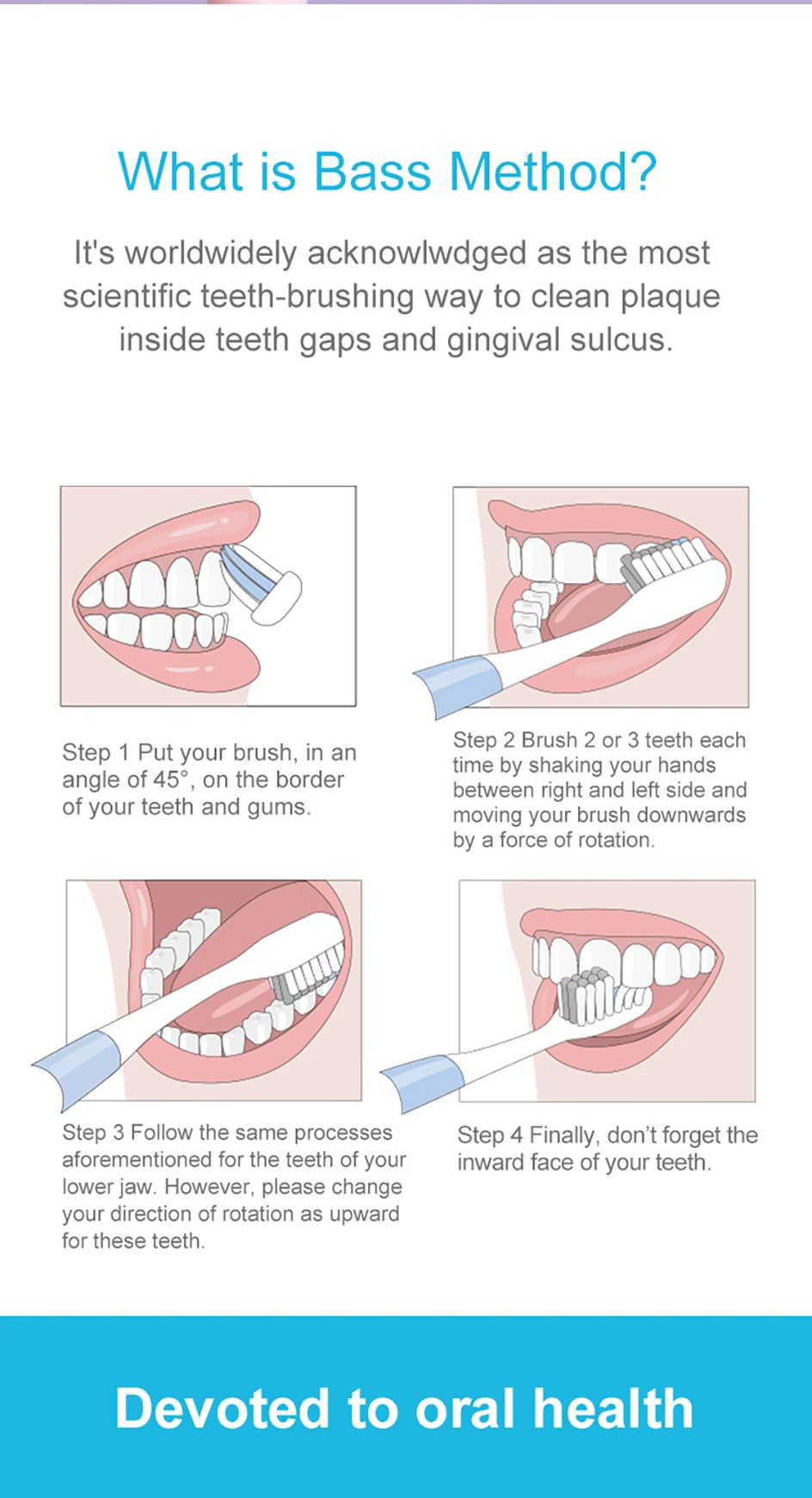 Он широко распространен в мире, как самый научный способ чистки зубов, чтобы очистить зубные щели внутри зубов и десневые сулькулы.Шаг 1 Положите кисть под углом 45 на грань зубов и десен.Шаг 2 кисть 2 или 3 зубца каждый раз, встряхивая руки между правой и левой стороной и перемещая кисть вниз силой вращения.Шаг 3 выполните те же процессы, что и выше, для зубов вашей нижней челюсти. Однако, пожалуйста, измените направление вращения в качестве upwaro для этих зубов.Шаг 4, наконец, не забудьте о внутренней стороне ваших зубов.