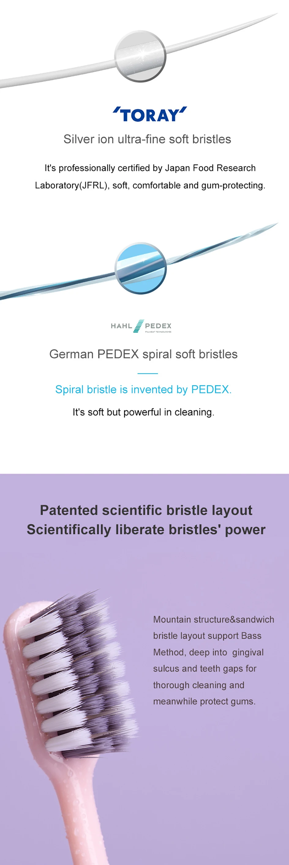 Горные структуры и сэндвич-щетиной макет поддержки басовМетод, глубоко в десневые сулькулы и зазоры зубов для тщательной очистки и тем временем защиты десен.TTORAYСеребристые ультратонкие мягкие щетинкиПрофессионально сертифицировано японскими исследованиями пищевых продуктовЛаборатория (JFRL), мягкая, удобная и клейкая защита.Немецкие PEDEX спиральные мягкие щетинкиСпиральная щетина изобретена PEDEX.Он мягкий, но мощный в чистке.