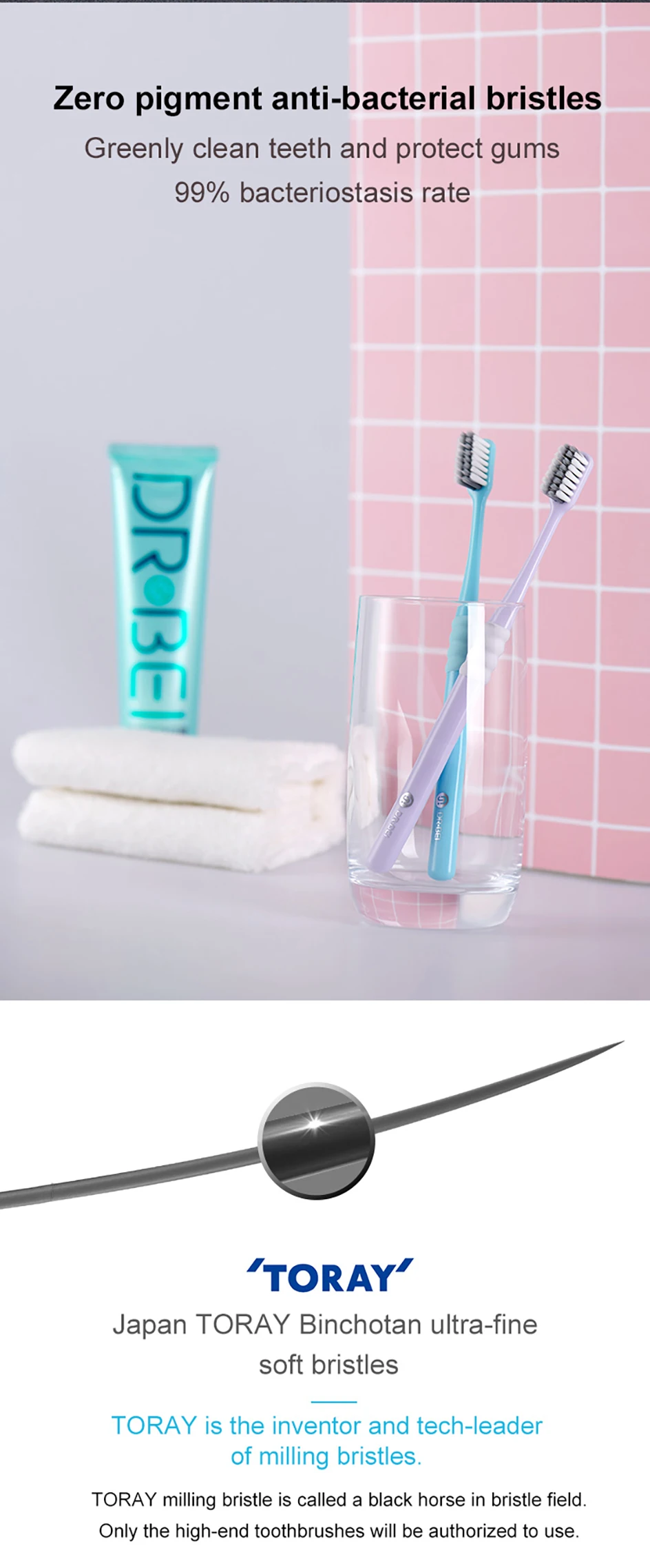 Экологически чистые зубы и защита десен99% уровень бактериостазаTORAYЯпония TORAY Binchotan ультратонкие мягкие щетинкиTORAY является изобретателем и технологическим лидером фрезерных щетинок.TORAY фрезерная щетина называется черной лошадкой в области щетиныТолько высококачественные зубные щетки будут разрешены к использованию.