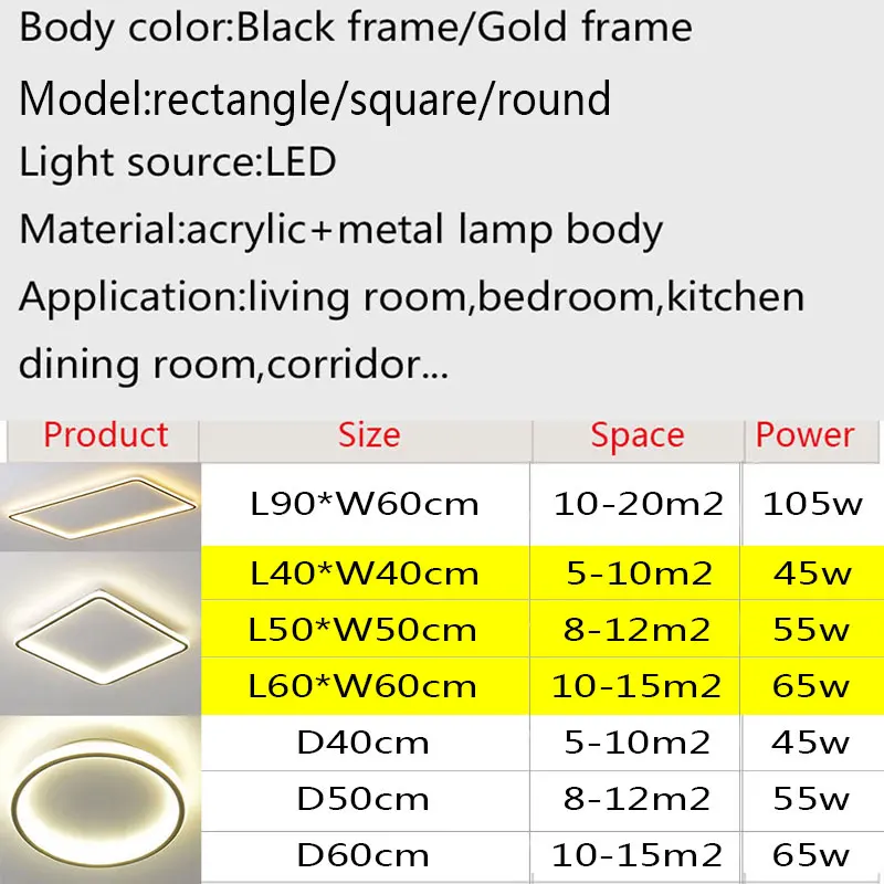 Размер лампы:ПрямоугольникL90 * W60 * H4.5cm 10-20m2 105wКвадратныйL40 * W40 * H4.5cm 5-10m2 45wL50 * W50 * H4.5cm 8-12m2 55wL60 * W60 * H4.5cm 10-15m2 65wКруглыйD40cm 5-10m2 45wD50cm 8-12m2 55wD60cm 10-15m2 65wВход: AC110v 220vЦвет корпуса: Золотая оправа/белая оправа/черная оправаЦветовая температура: холодный белый/теплый белый/Диммируемый СветильникМатериал: акриловый металлический корпус лампыПрименение: гостиная, столовая, кухня, спальня, кабинет, коридор...Доставка из: КитайГарантия: один год