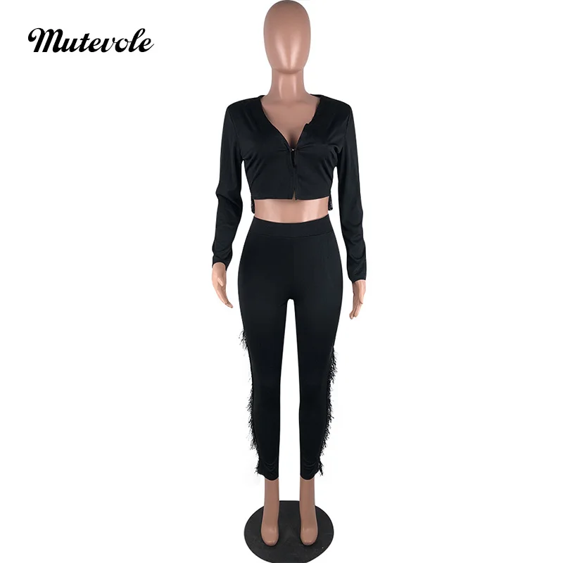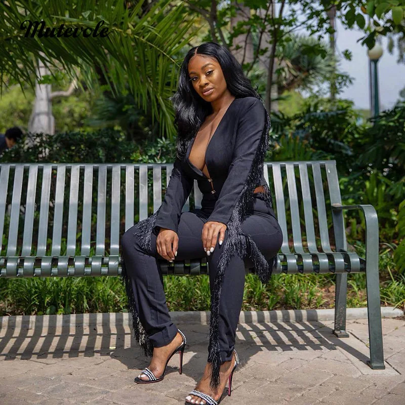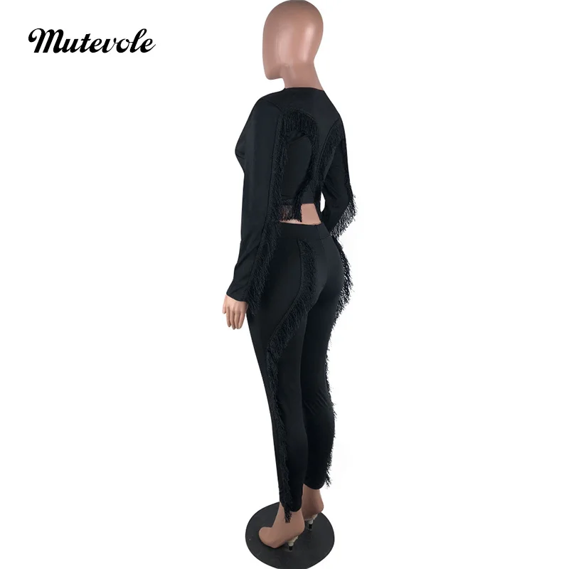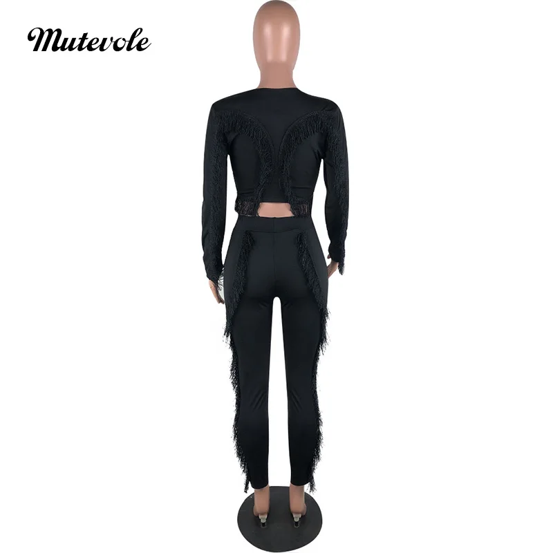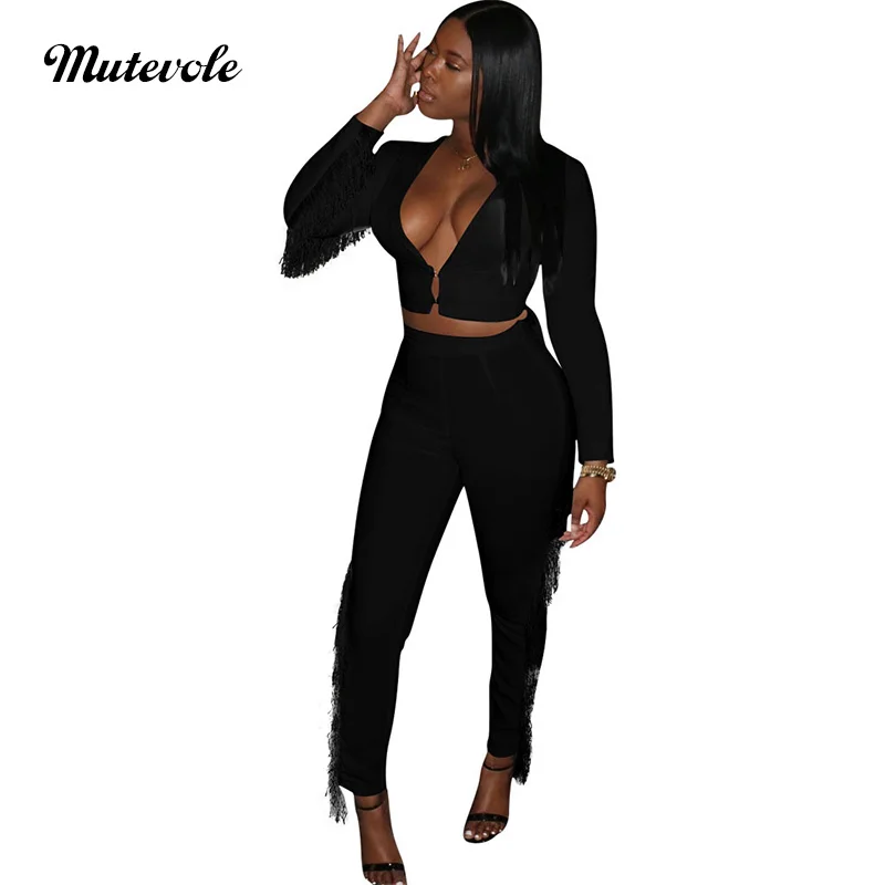 Mutevole Женский комплект из двух предметов с длинным рукавом и кисточками, сексуальный укороченный топ с глубоким v-образным вырезом и брюки, однотонный черный облегающий клубный костюм из 2 предметов