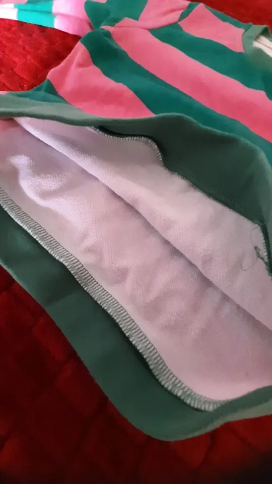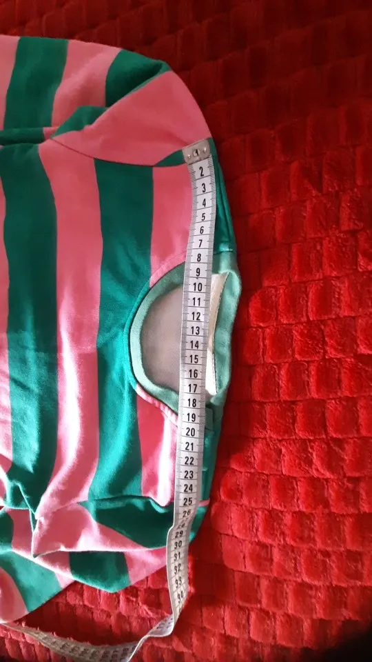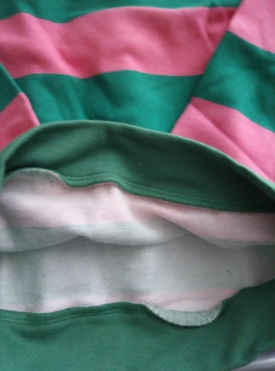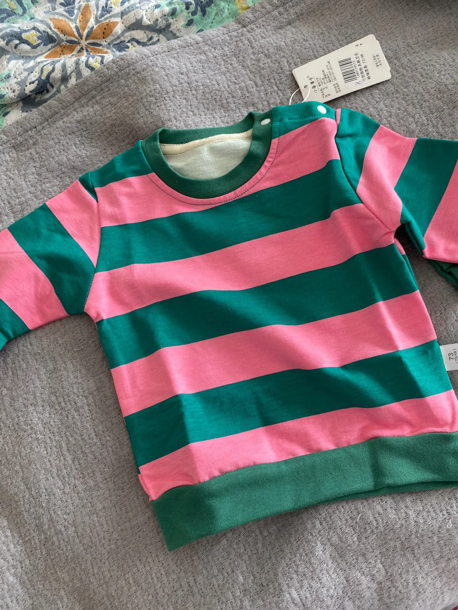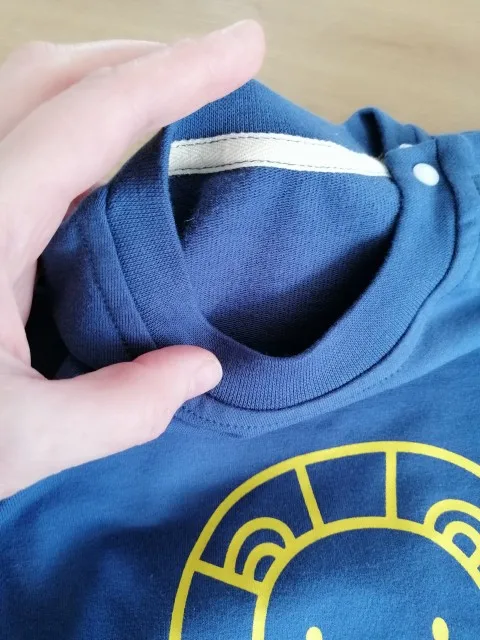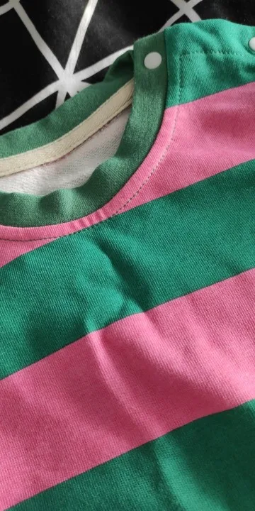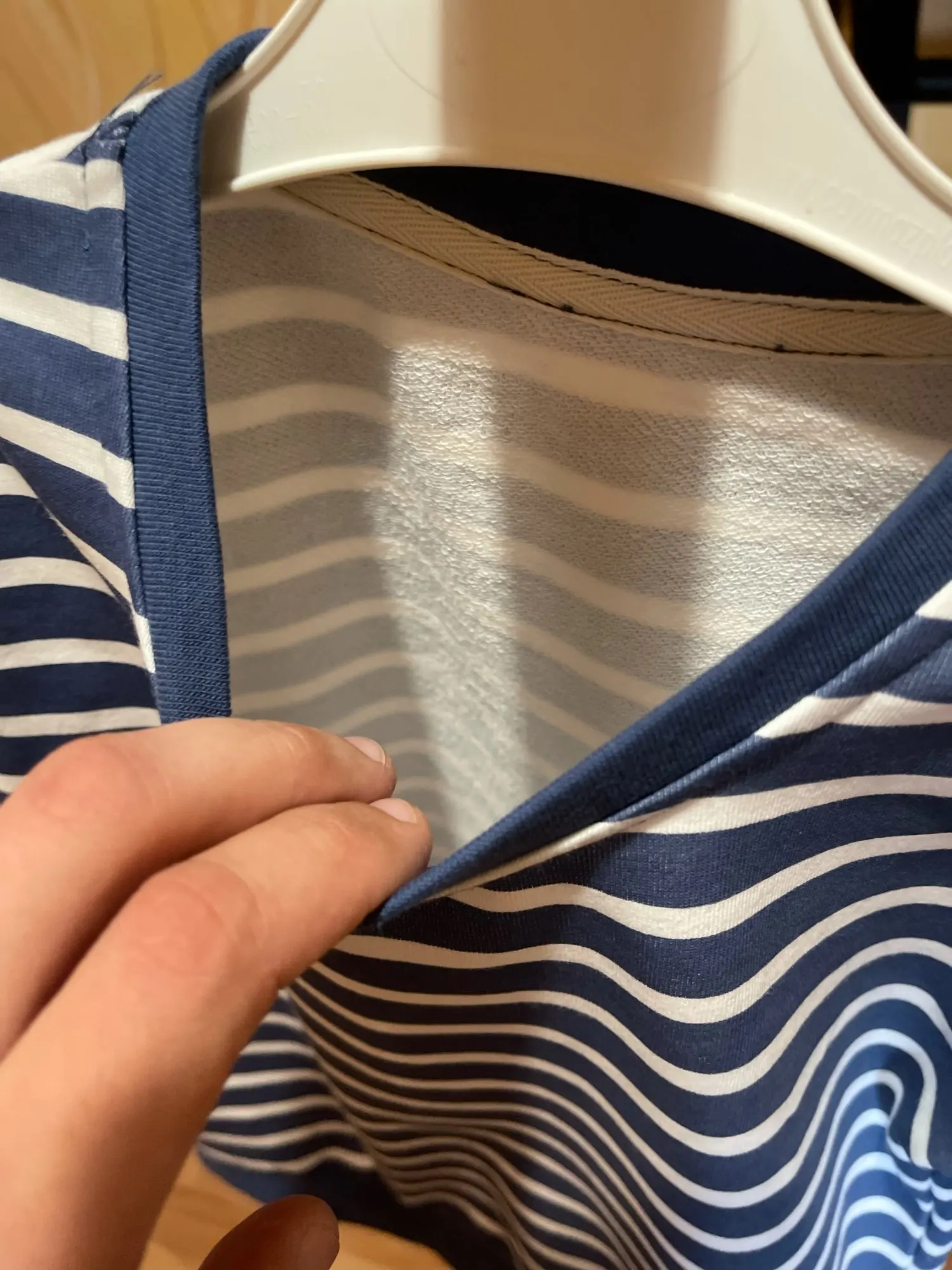 Mooie trui alleen de kleur groen van de boorden is anders dan die van de strepen van de trui. Het waslabel zit aan de buitenkant (?)