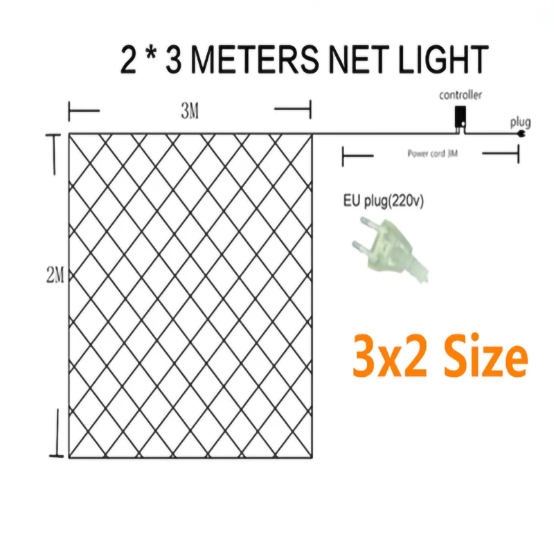 Цвет СВЕТОДИОДА: синий/белый/цвет/теплый белый Название: светодиодная сетка Размер: 3 м * 2 м Напряжение: 220v Стандарт Вилки: ЕС Вес изделия: 400 г Класс водонепроницаемости: IP44 (контроллер не является водонепроницаемым)
