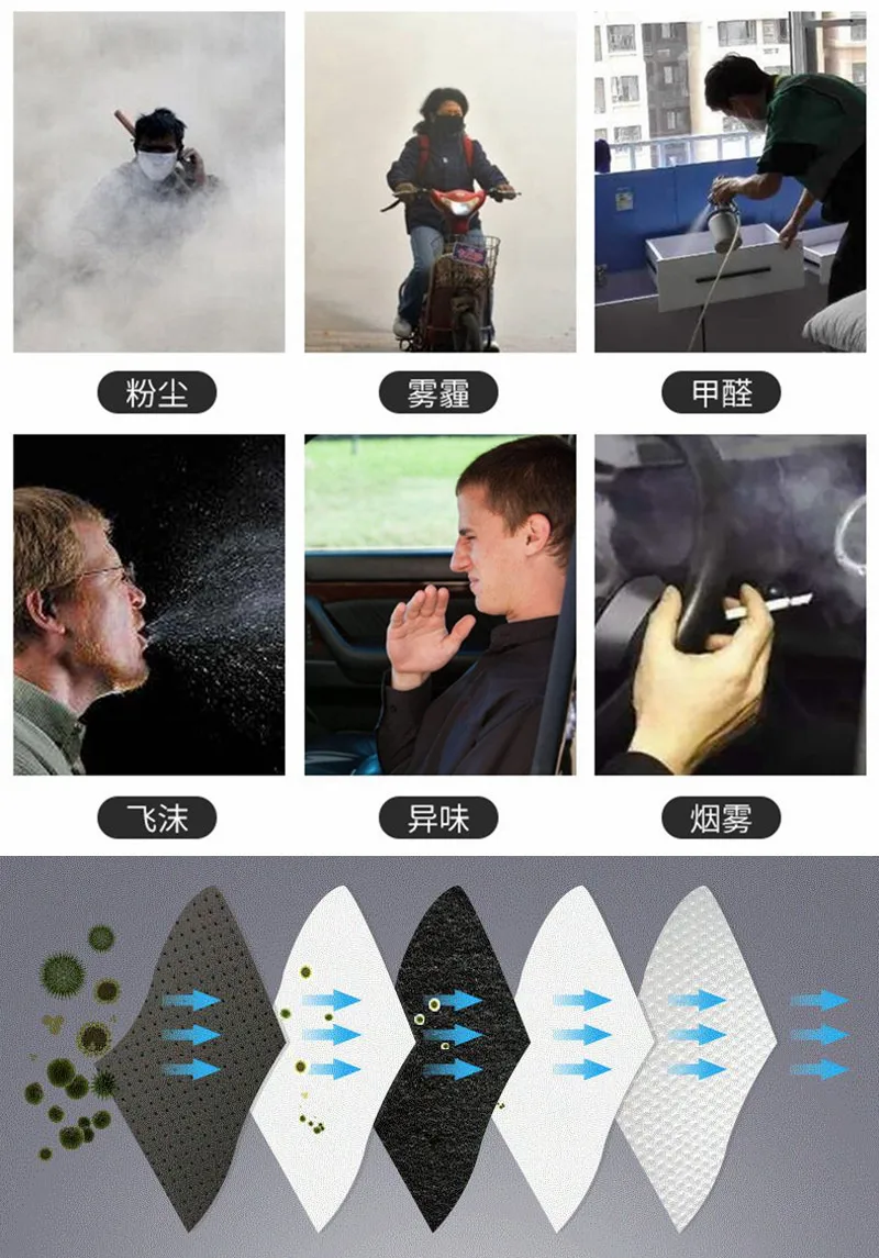 Технология фильтрации: изготовлено из активированного угля и нетканой ткани для фильтра с выдувом расплава, пятислойная система фильтров эффективно удерживает от PM 2,5 и ряда загрязняющих веществ, переносимых в воздухе;