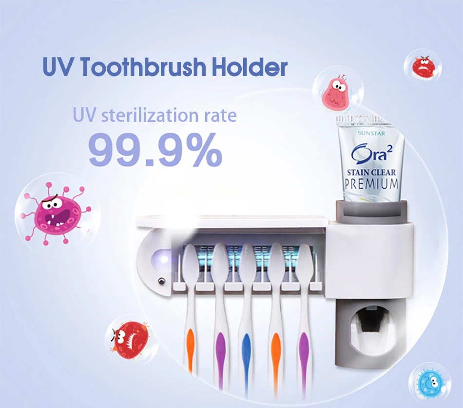1. Семейный дизайн может хранить до 5 зубных щеток.2. Держатель зубной пасты и настенное крепление для экономии места.3. Совместим с любым видом зубной пасты.4. УФ-светильник автоматически отключается через 4-5 минут.