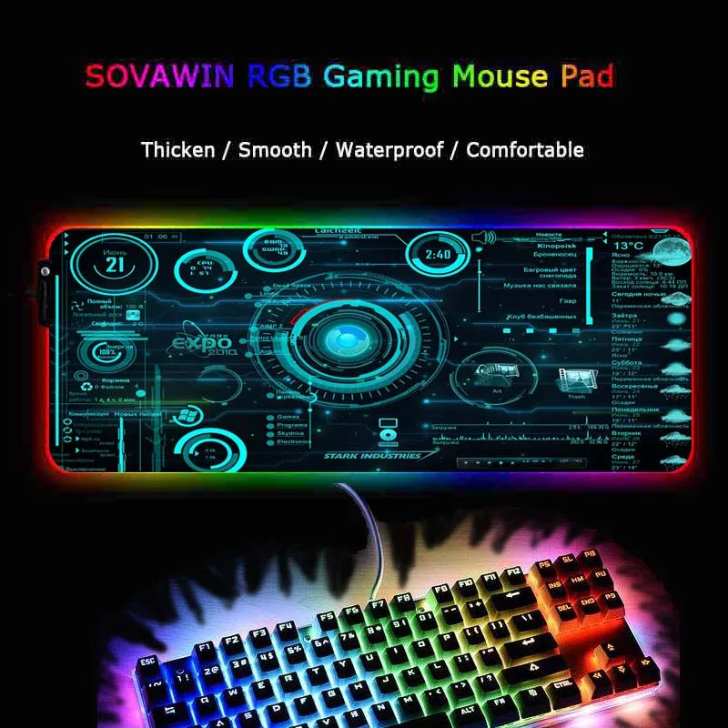 Получил его довольно быстро. Соответствует описанию-светло-бирюзовый принт на черном поддоне с русским текстом. Тонкая Светодиодная лента пришивается вокруг коврика и при подключении к usb-порту хорошо светится и цвет меняется красиво.