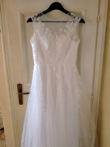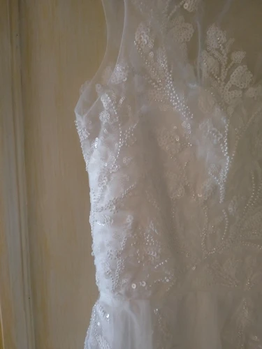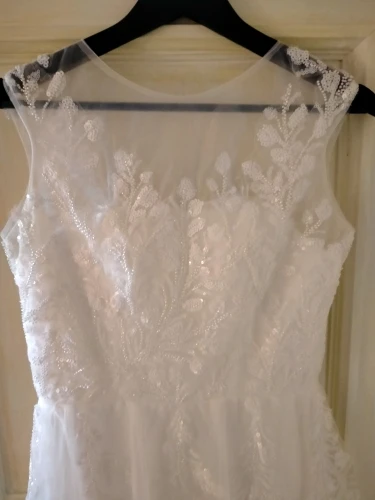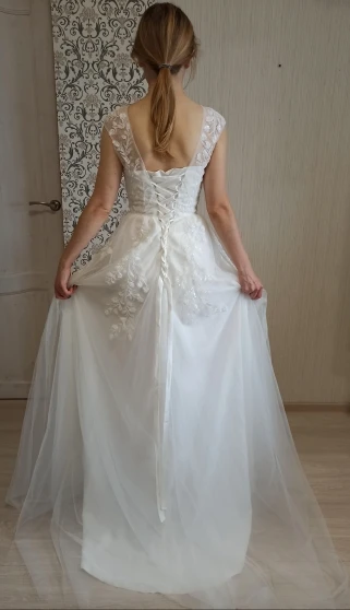 Очень красивое платье. Выглядит дороже, чем стоит. Вышито бисером, сзади завязывается на ленту, пышное и воздушное.