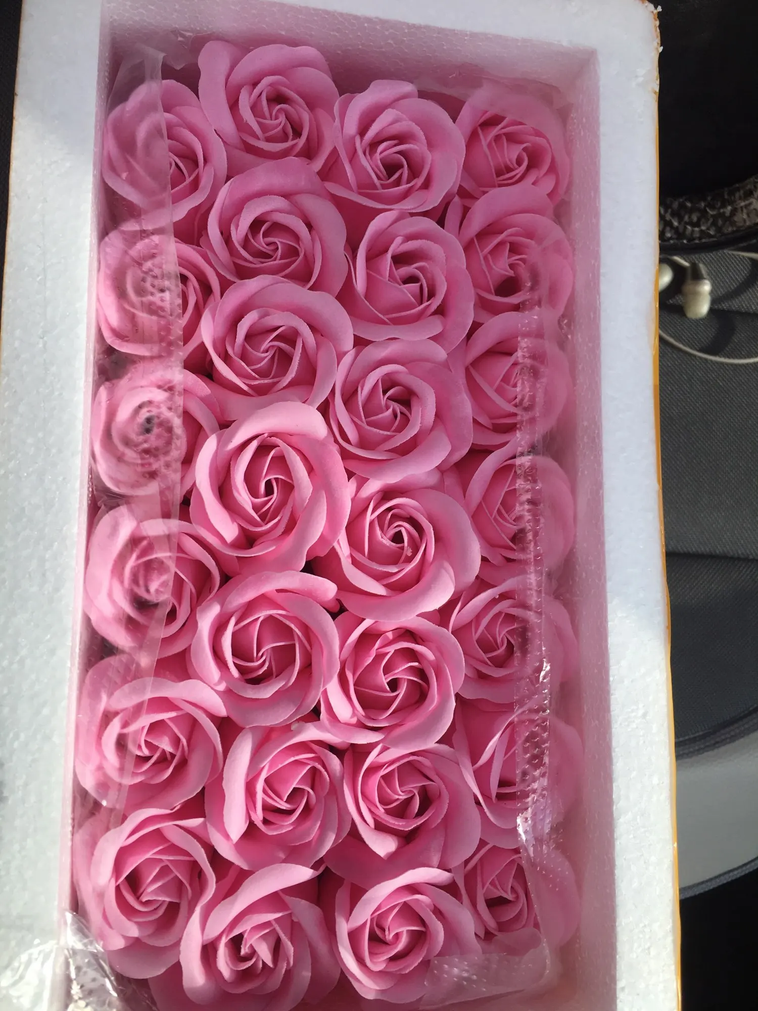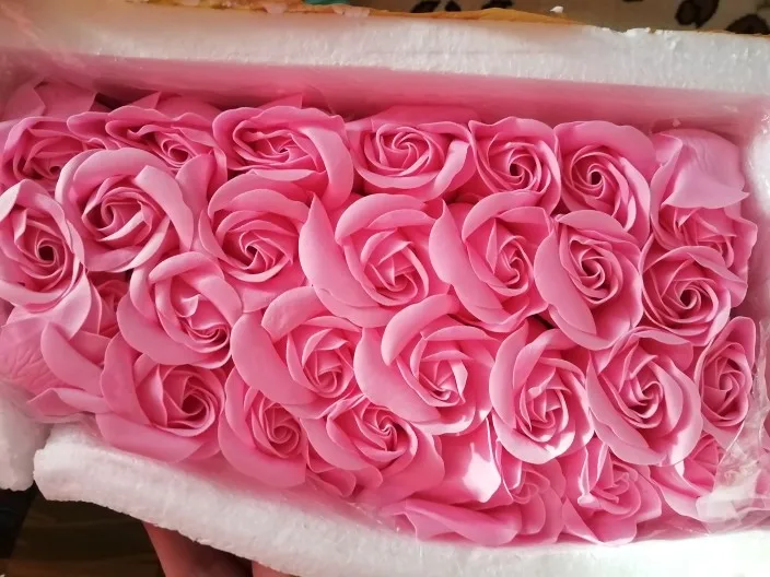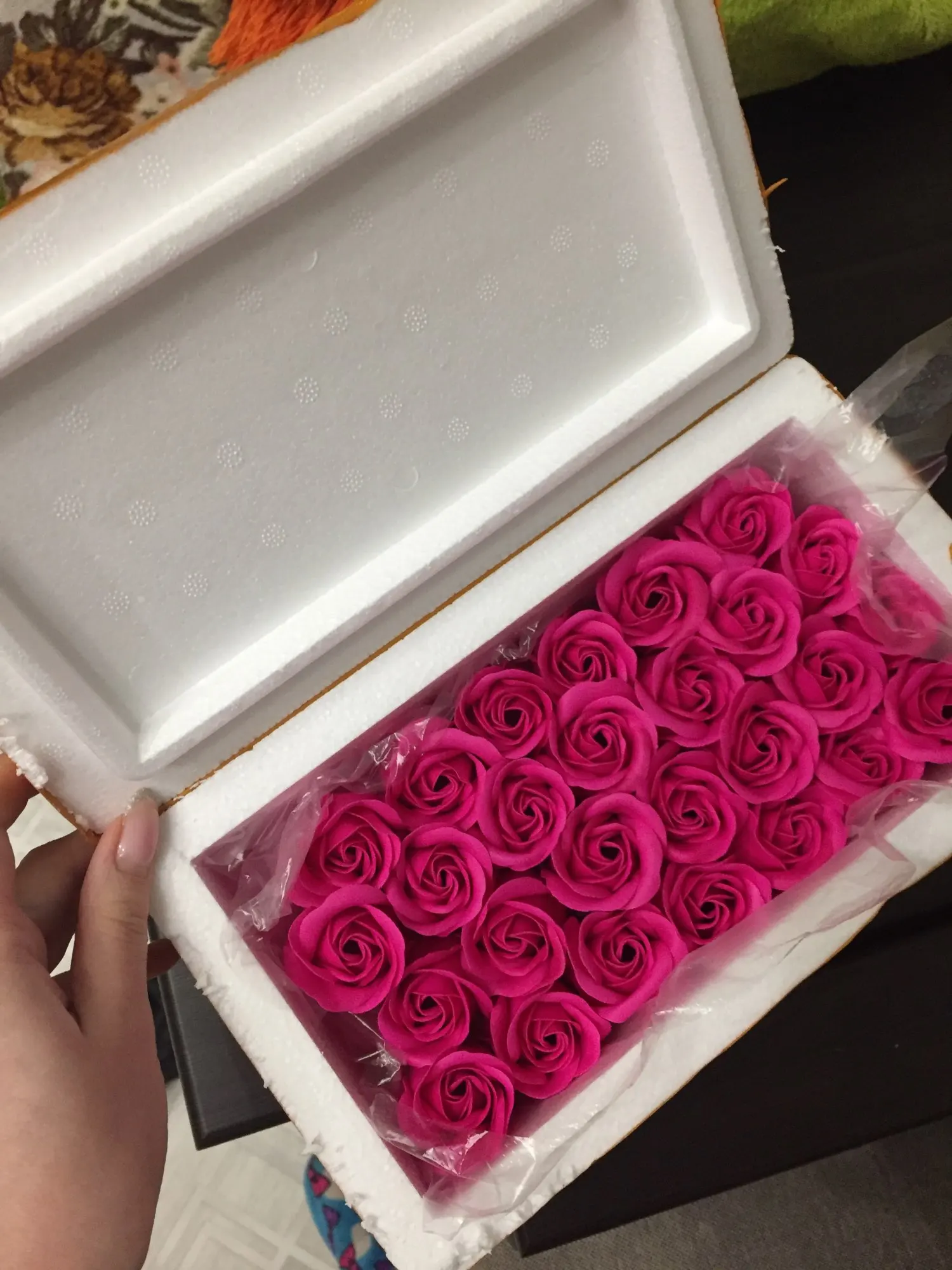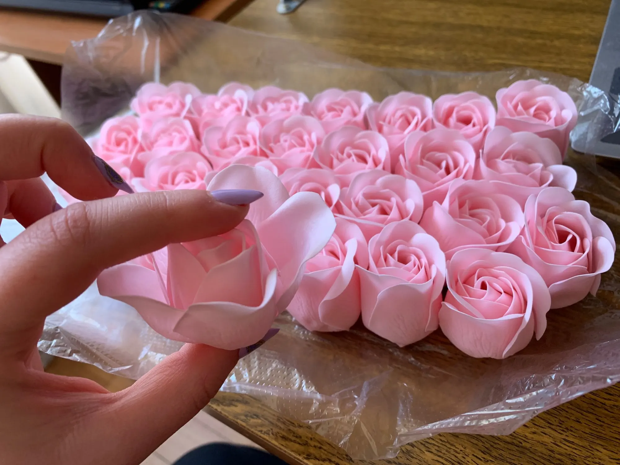Розочки очень милые, все красивые, аккуратно упакованы, приятно пахнут розой. Похожи на настоящие, соответствуют картинке. Очень советую! Это розы из мыла - только головки.