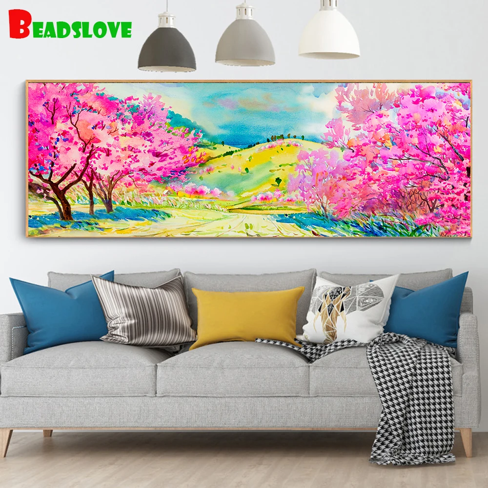 Большая 5D квадратная круглая алмазная живопись сделай сам, розовые цветы, дорога, бриллиант, вышивка крестиком