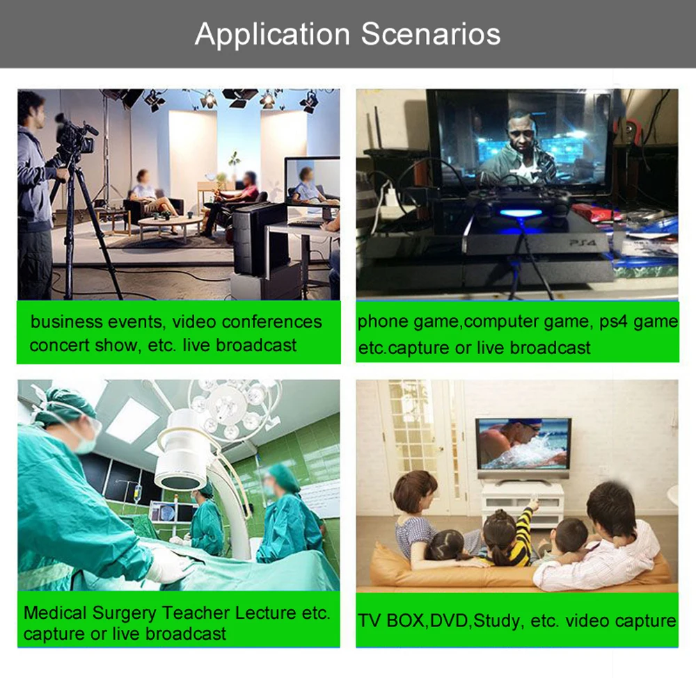 Описание: Видеозахвата может захватывать как HDMI видео и HDMI аудио, отправка аудио и видео сигналов на компьютеры и смартфоны для предварительного просмотра и хранения. Подходит для получения высокой четкости, обучения записи, медицинской визуализации и т. Д.