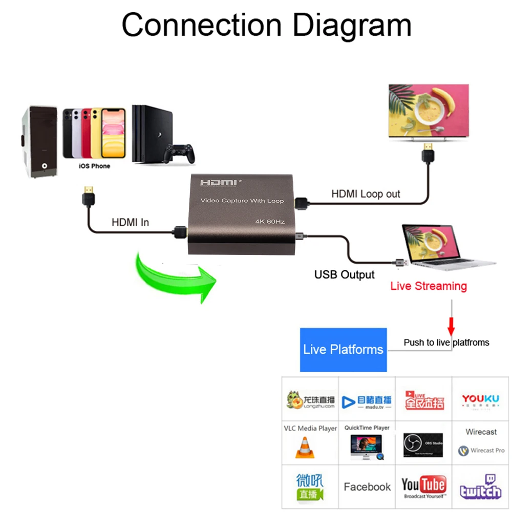Особенности:* Поддержка HDMI loop out;* Поддержка входного сигнала с максимальным разрешением 4K/60 Гц;* Поддержка вывода с максимальным разрешением 4K/60 Гц;* Поддержка видеозахвата USB с максимальным разрешением 1080P/60 Гц;* Поддержка стандартного кабеля AWG26 HDMI: вход до 5 метров, выход до 5 метров;* Поддержка большинства программ для приобретения, таких как VLC, OBS, Amcap и т. д.;* Поддержка Windows, Android и MacOS;* Соответствует стандарту USB Video и UVC;* Соответствует стандарту USB Audio UAC;* Компактный и портативный.