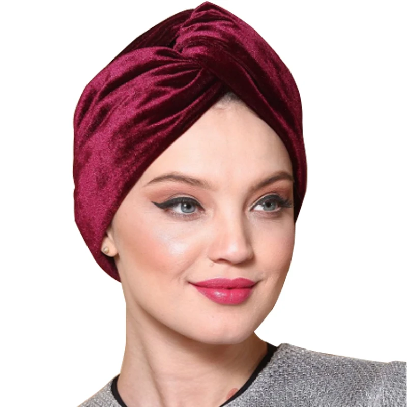 Новый бархатный Эластичный Тюрбан капот мусульманская зимняя теплая шапка лоб Крест шапочки под хиджаб женский шарф шапка индийская шапка тюрбант