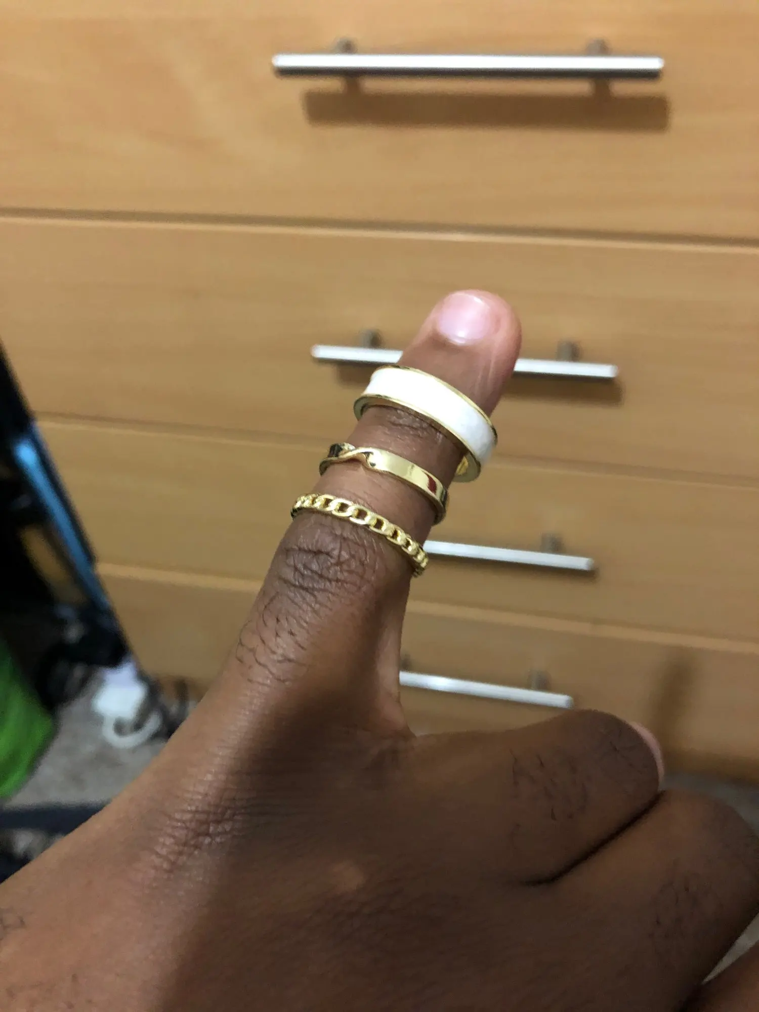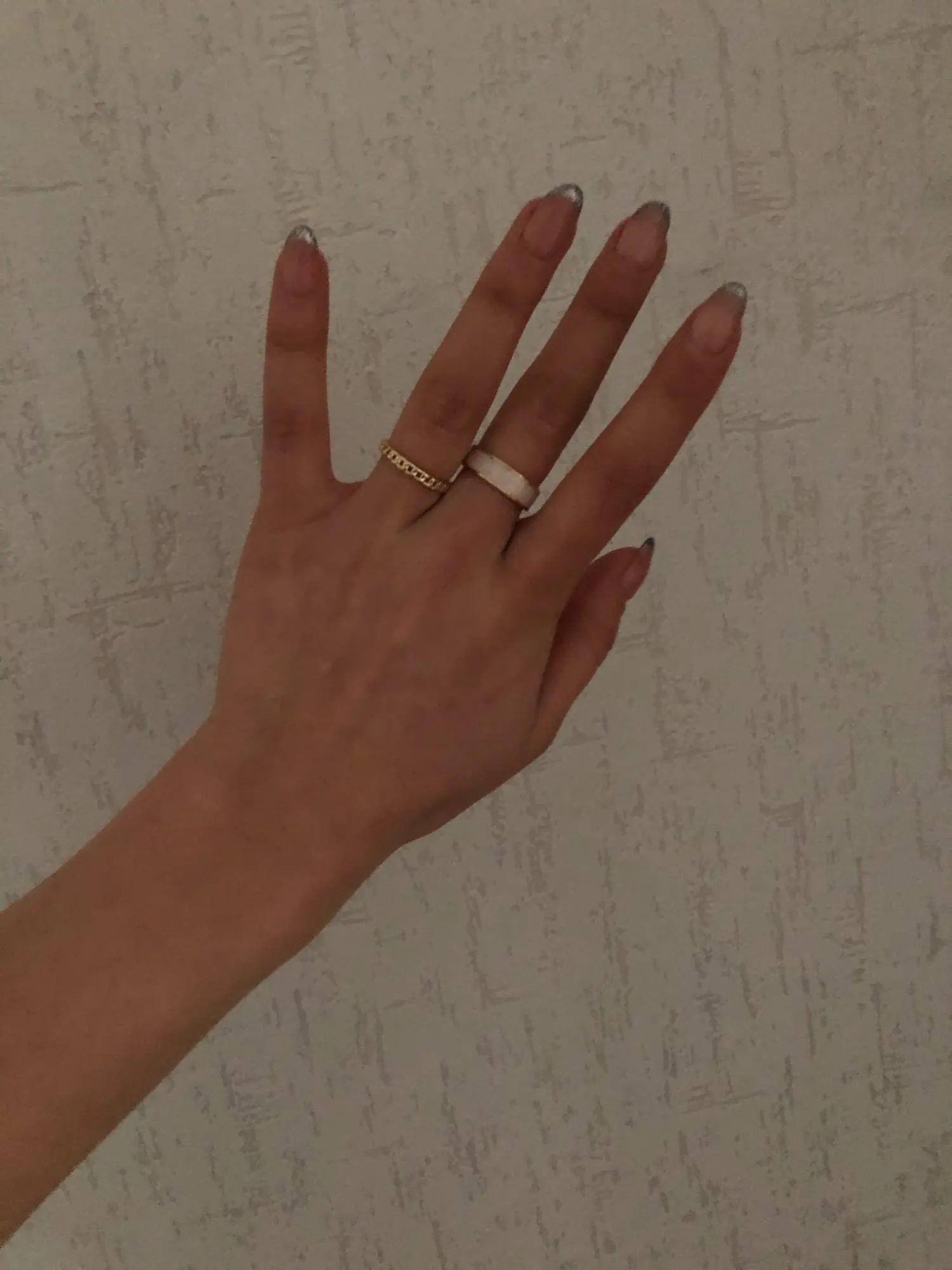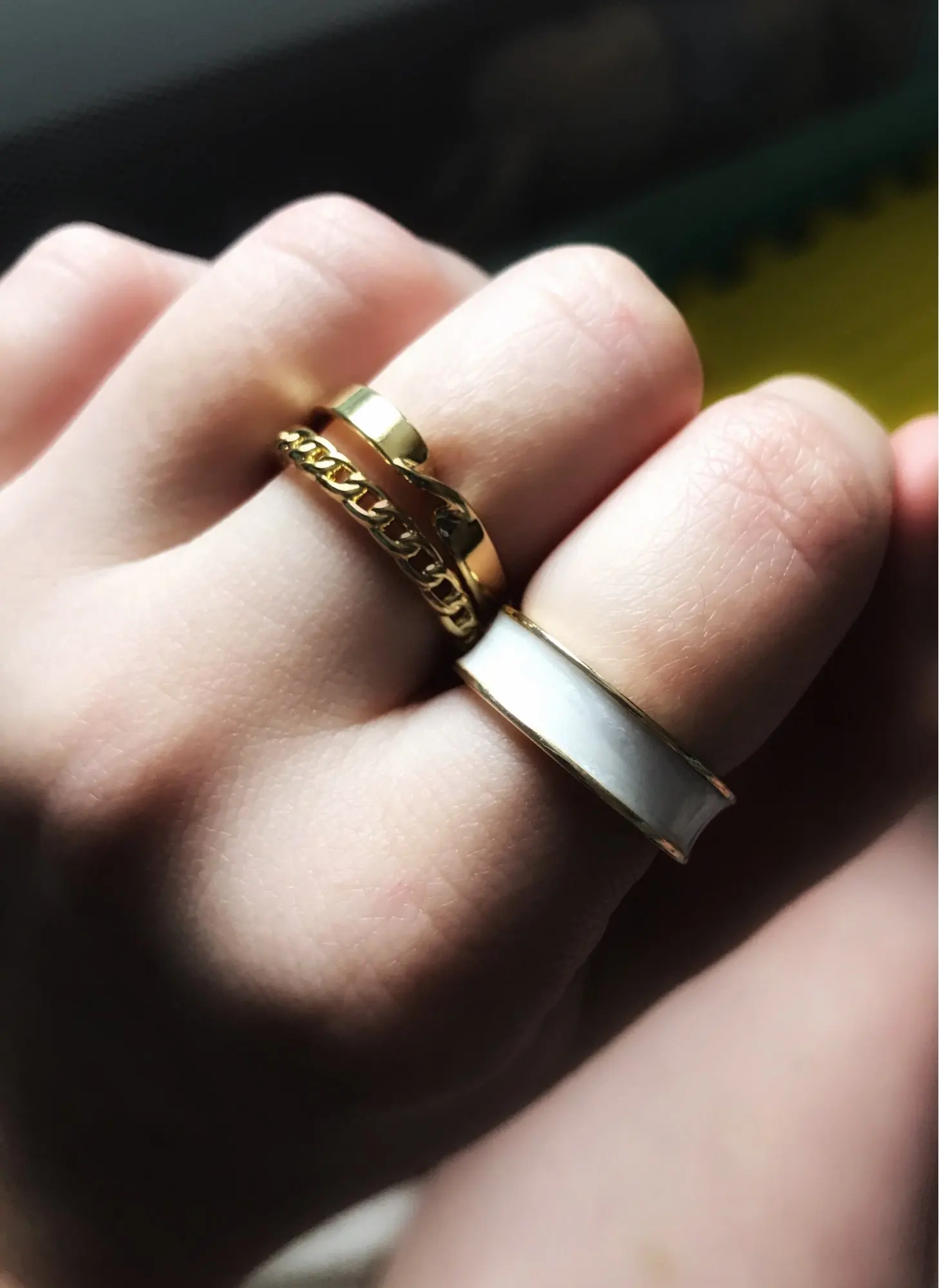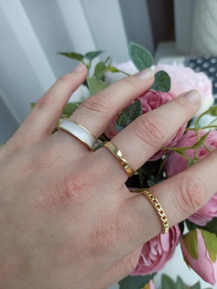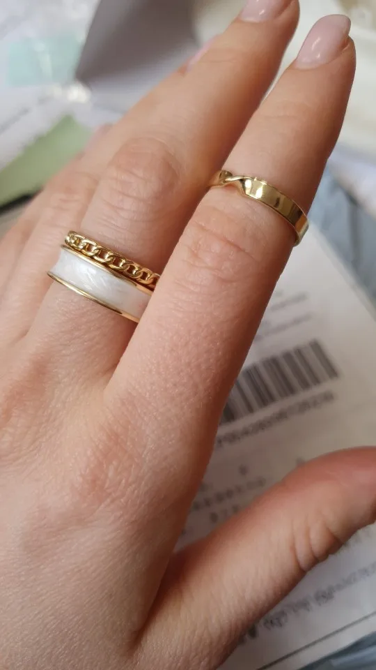Отличные кольца! За такую цену просто сказка, даже налезли на мои сосиски :) широкое кольцо очень трудно разгибается, поэтому носить можно только на том пальце на который налезло. На кольце в виде цепи есть небольшие косячки, не до конца пробиты дырки(на последнем фото), но едва заметные. Скрученное кольцо оказалось самым маленьким, так как переживаю за качество металла не стала его насиловать и раздвигать, ношу на мизинце или средней фаланге. За два дня носки без соприкосновения с водой не потемнели.