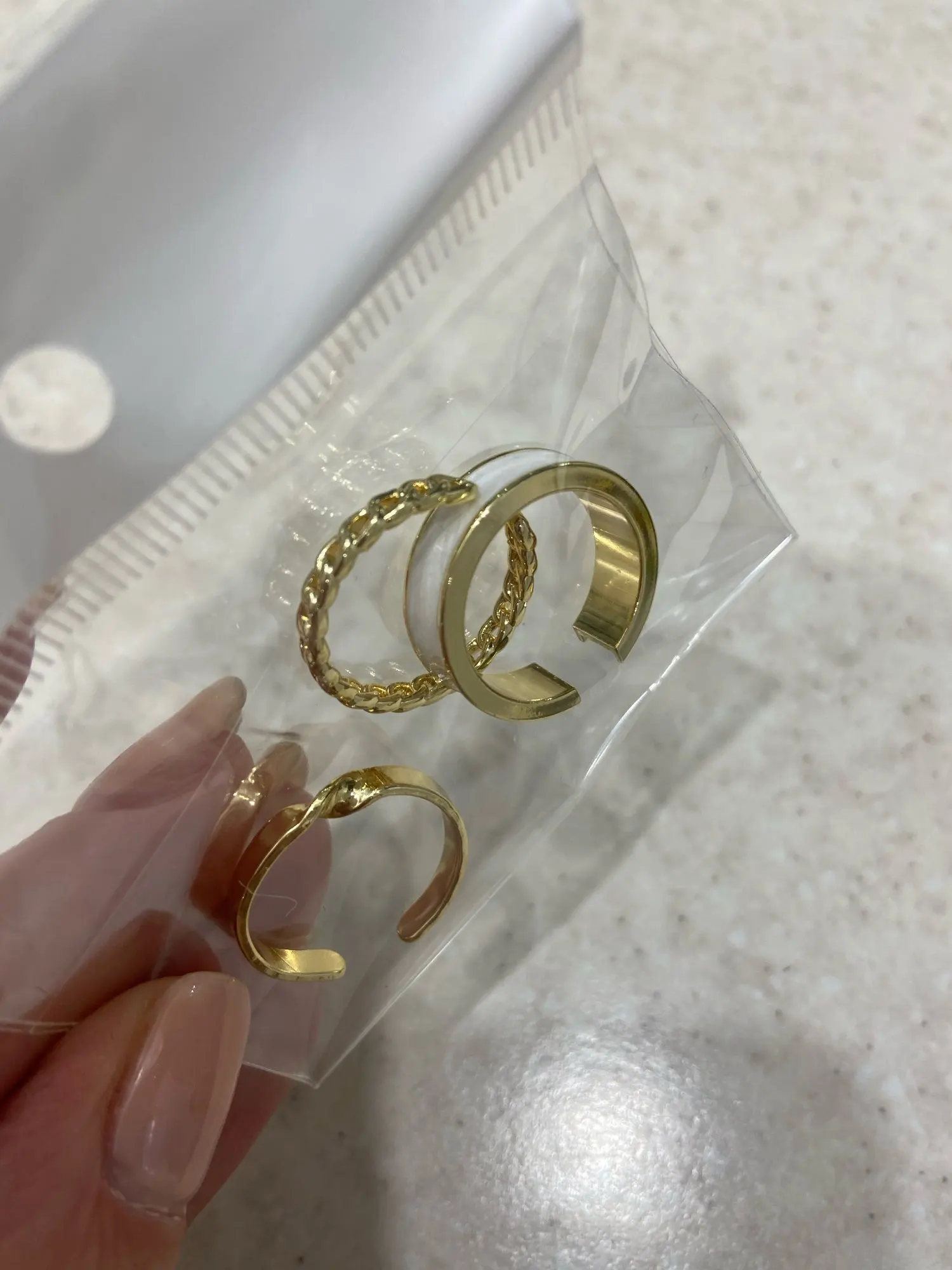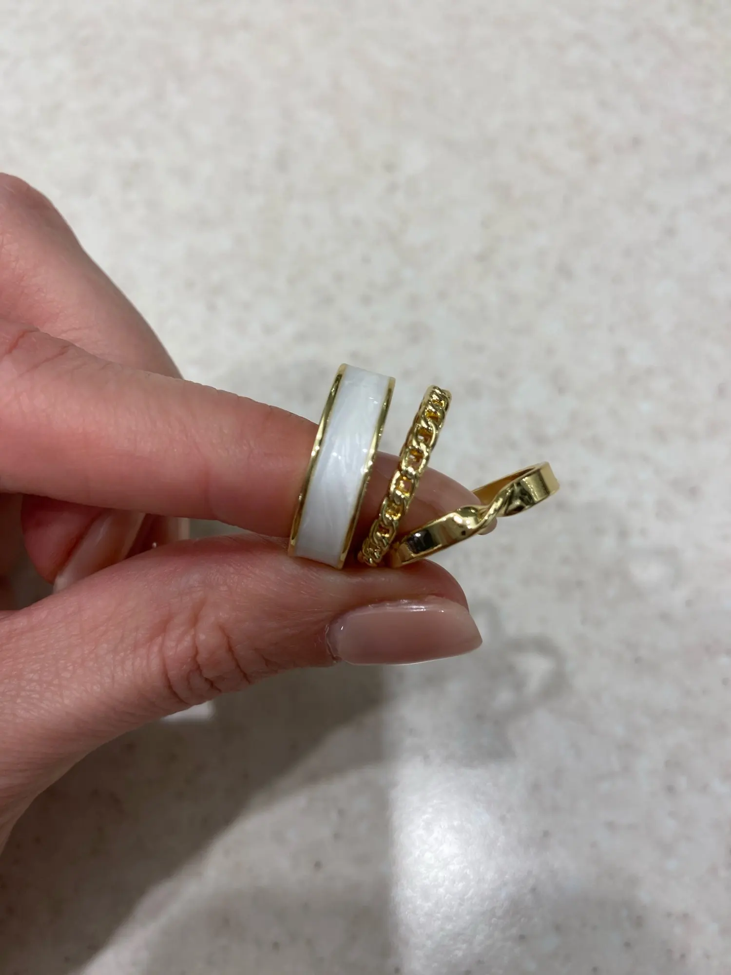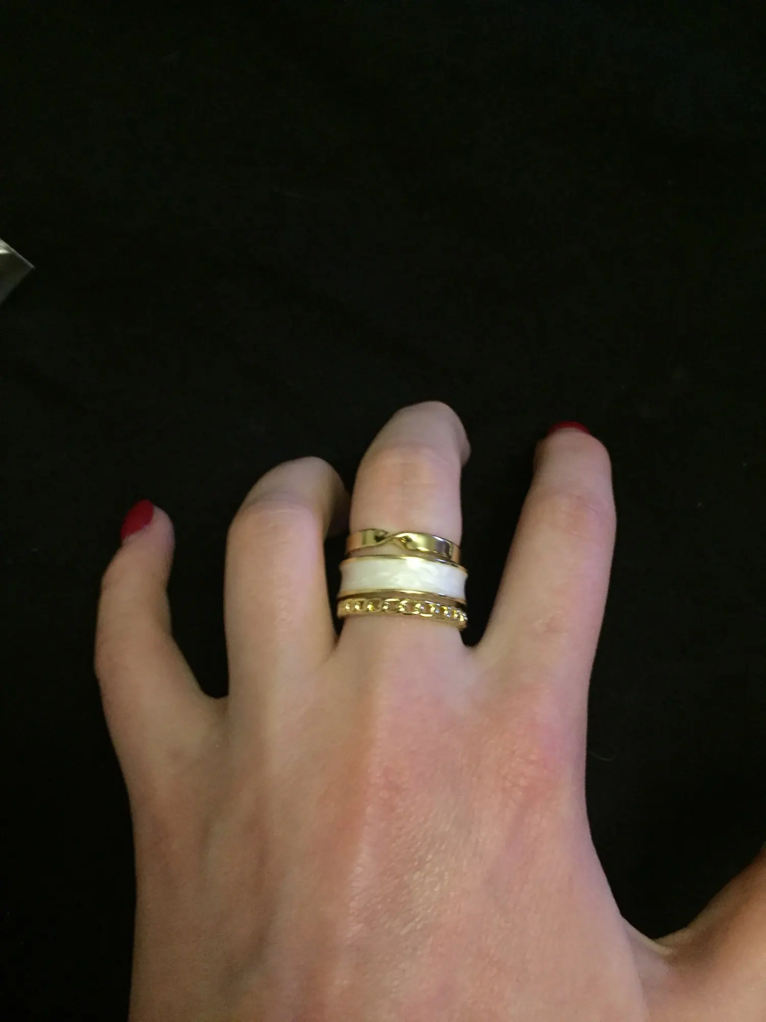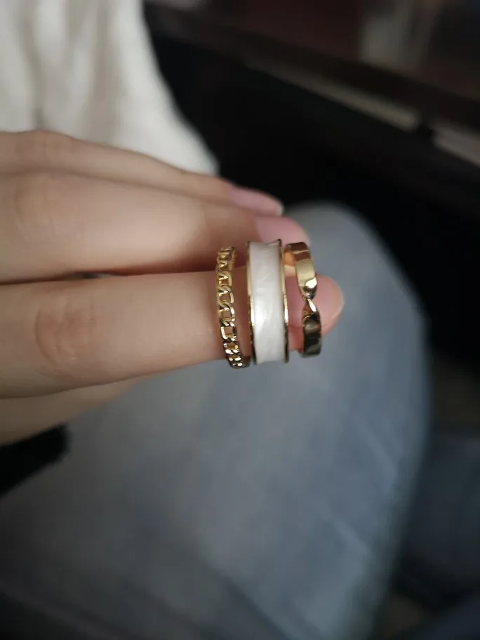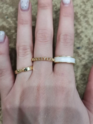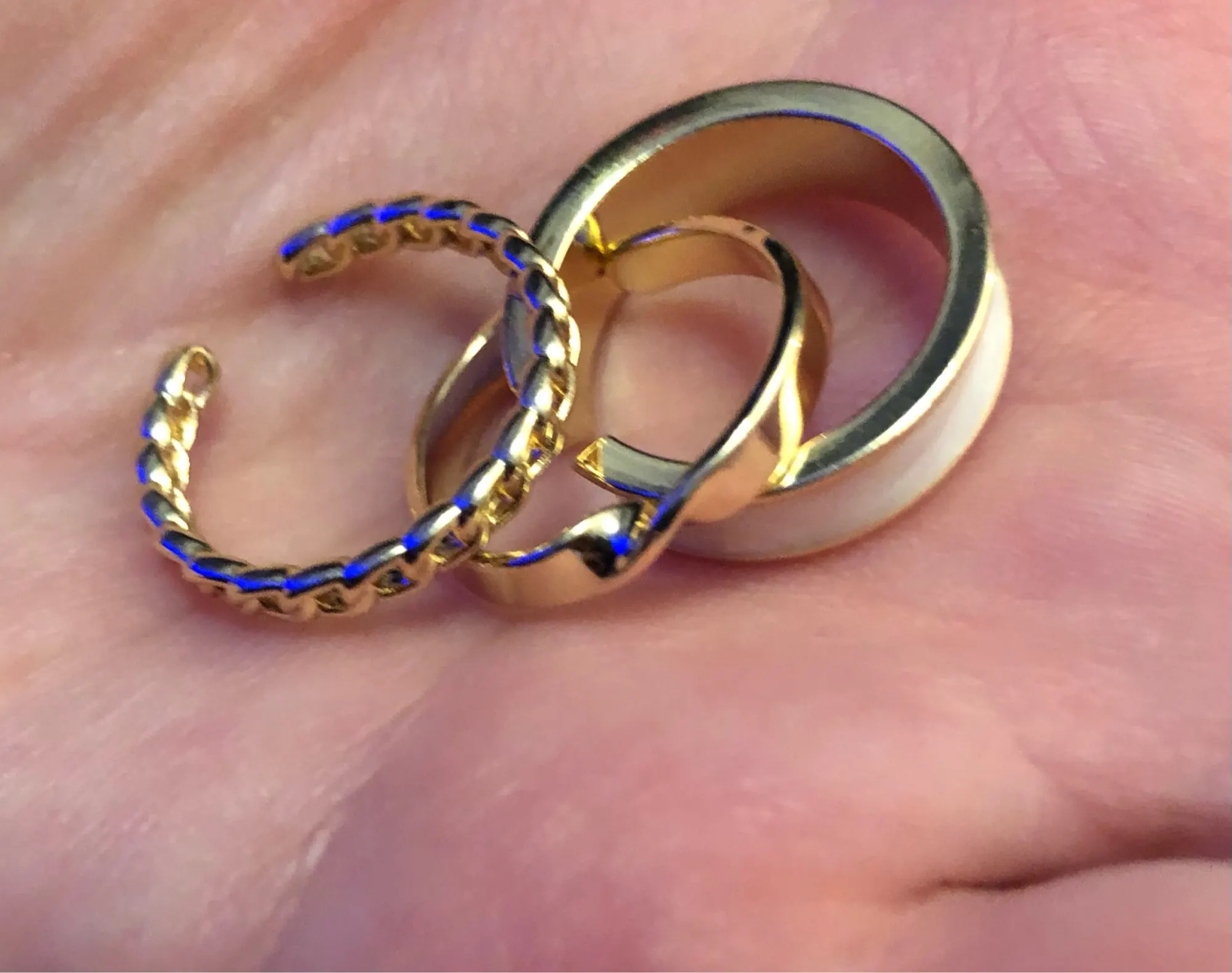 Красивые кольца. Набор из 3 штук. Все разные. Цвет под золото. Довольна. Спасибо продавцу. Рекомендую.