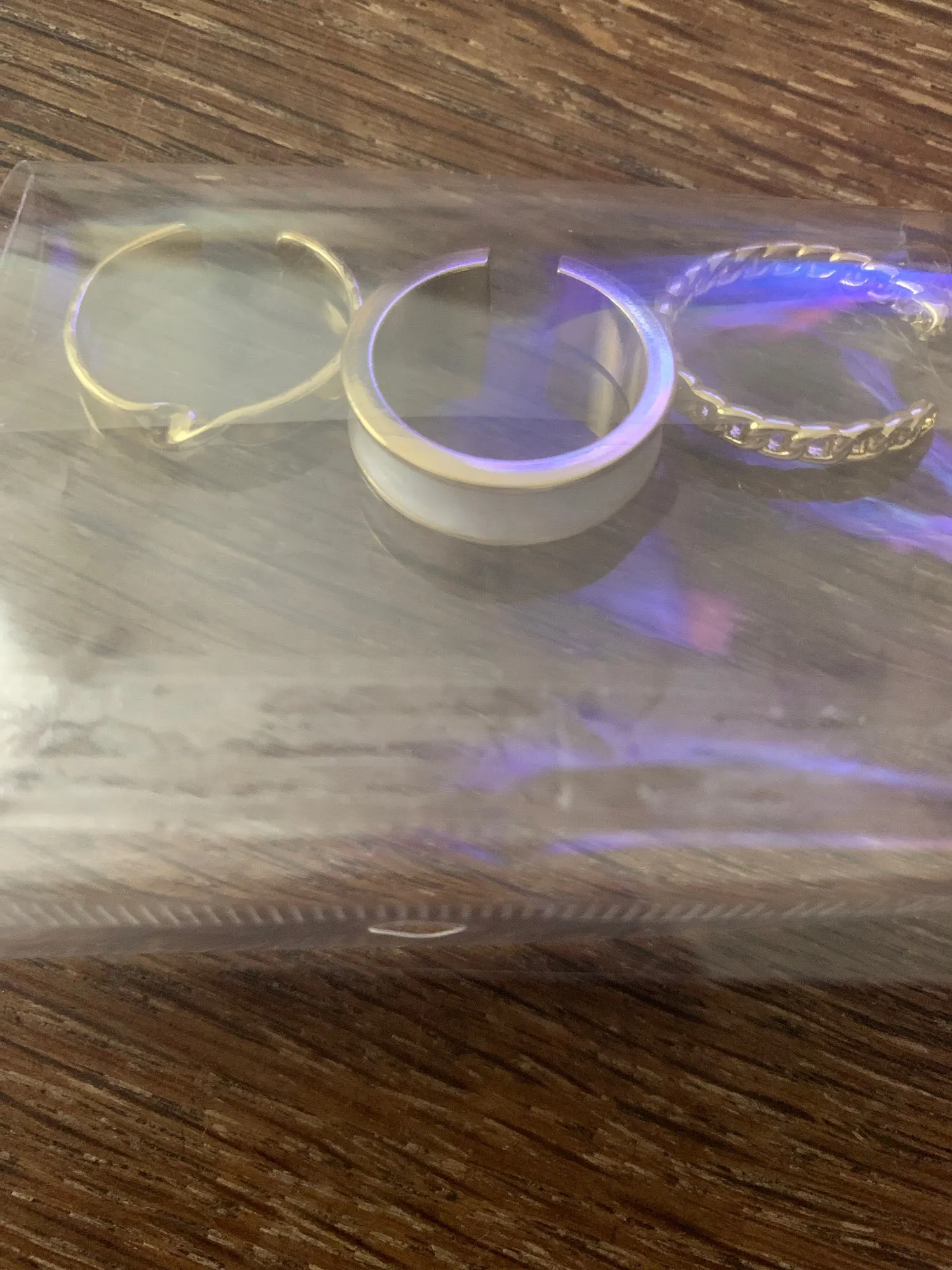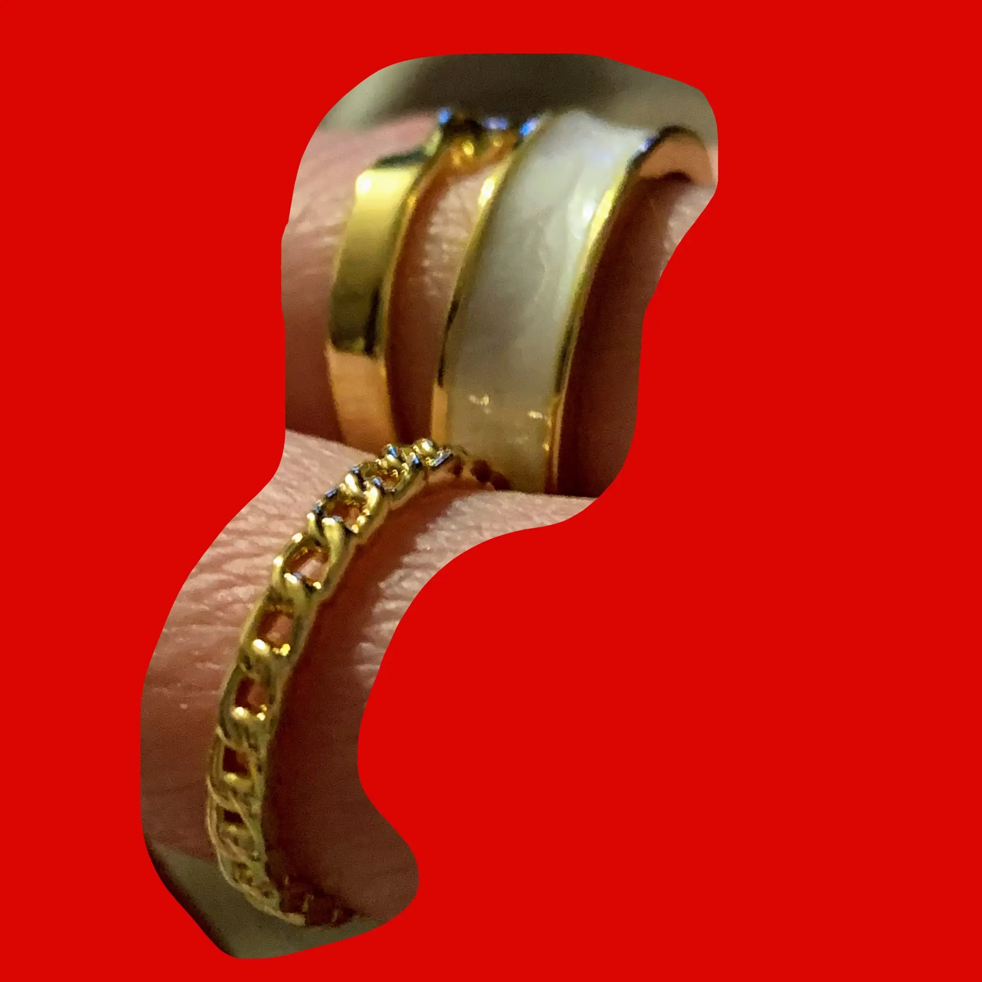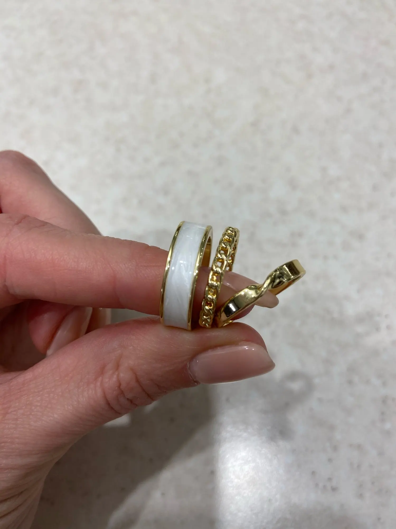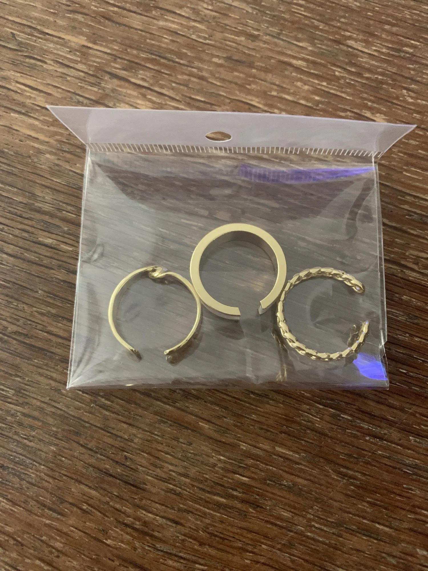 Красивые кольца. Набор из 3 штук. Все разные. Цвет под золото. Довольна. Спасибо продавцу. Рекомендую.