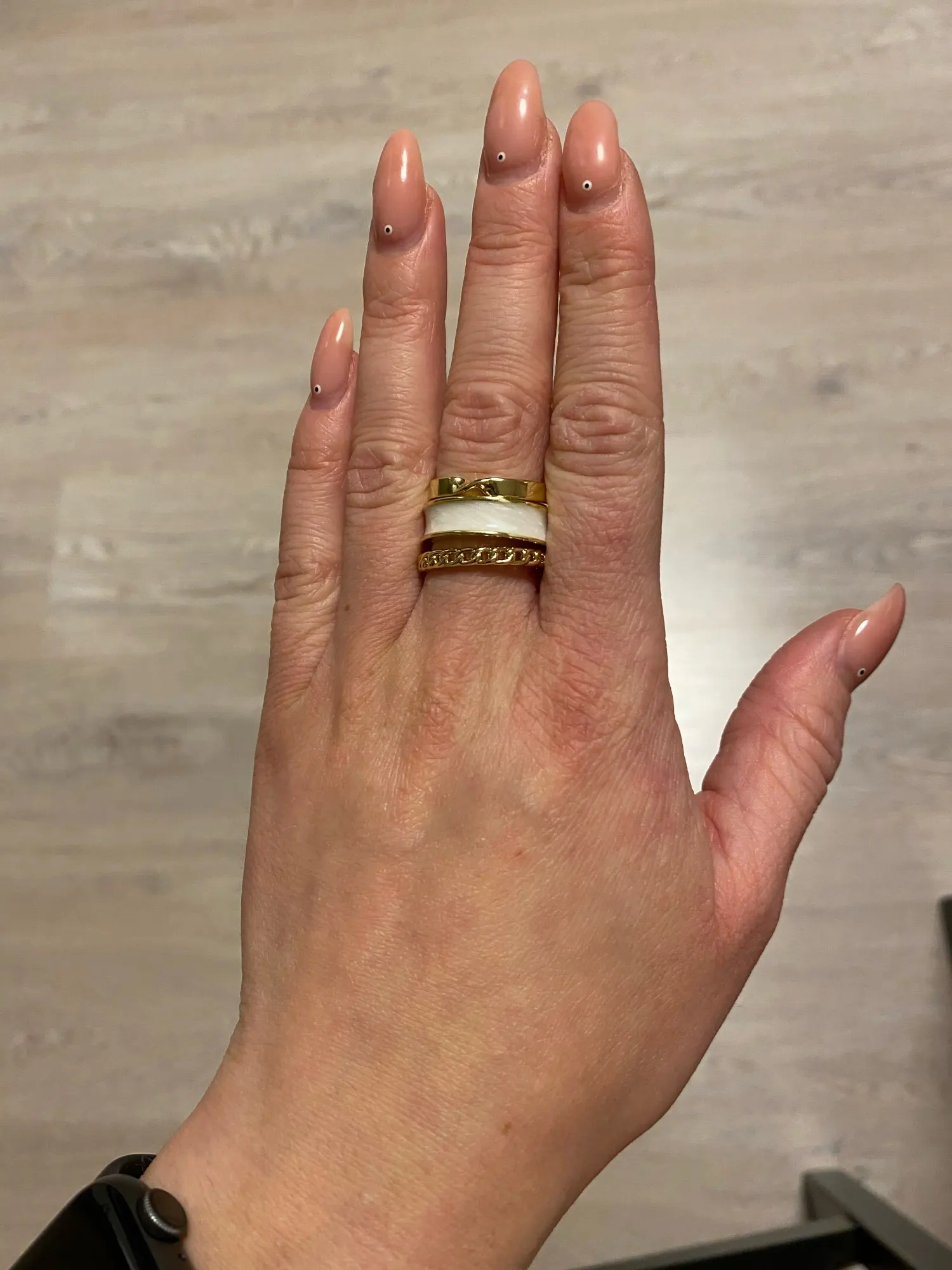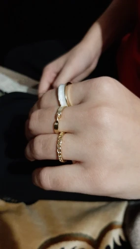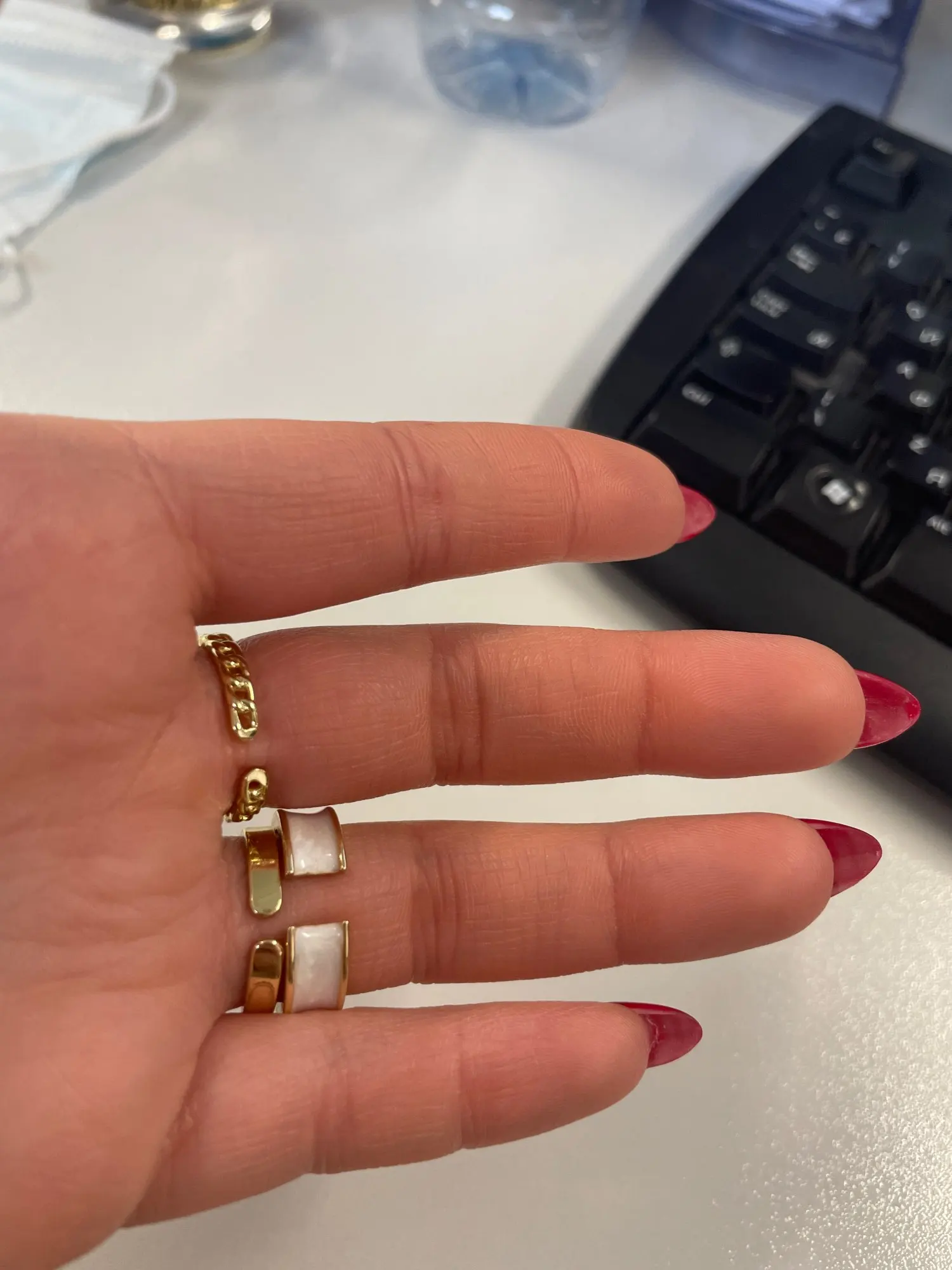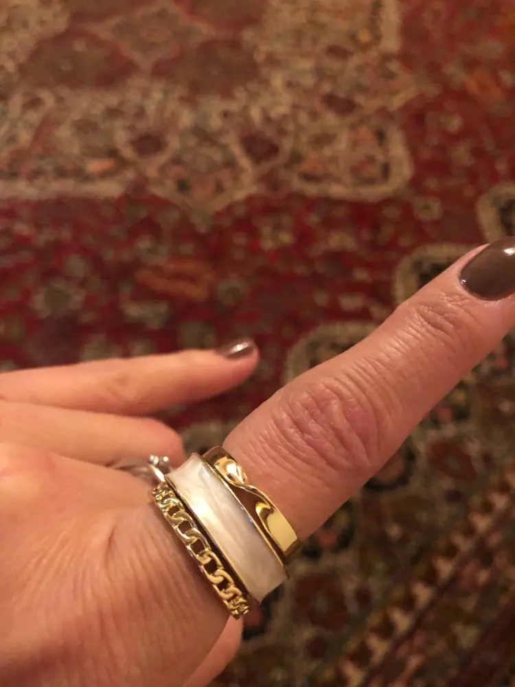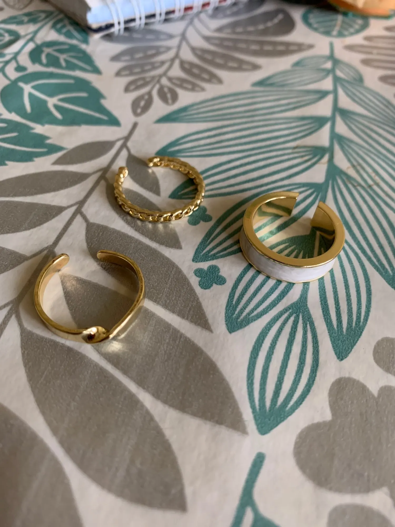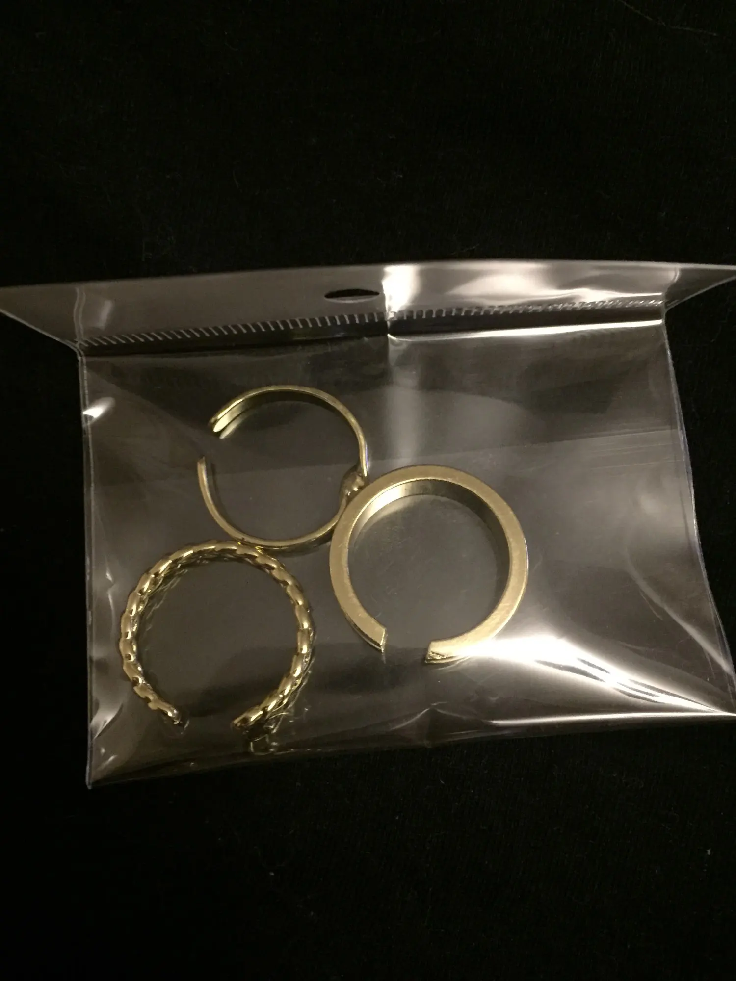 Красивые кольца. Набор из 3 штук. Все разные. Цвет под золото. Довольна. Спасибо продавцу. Рекомендую.