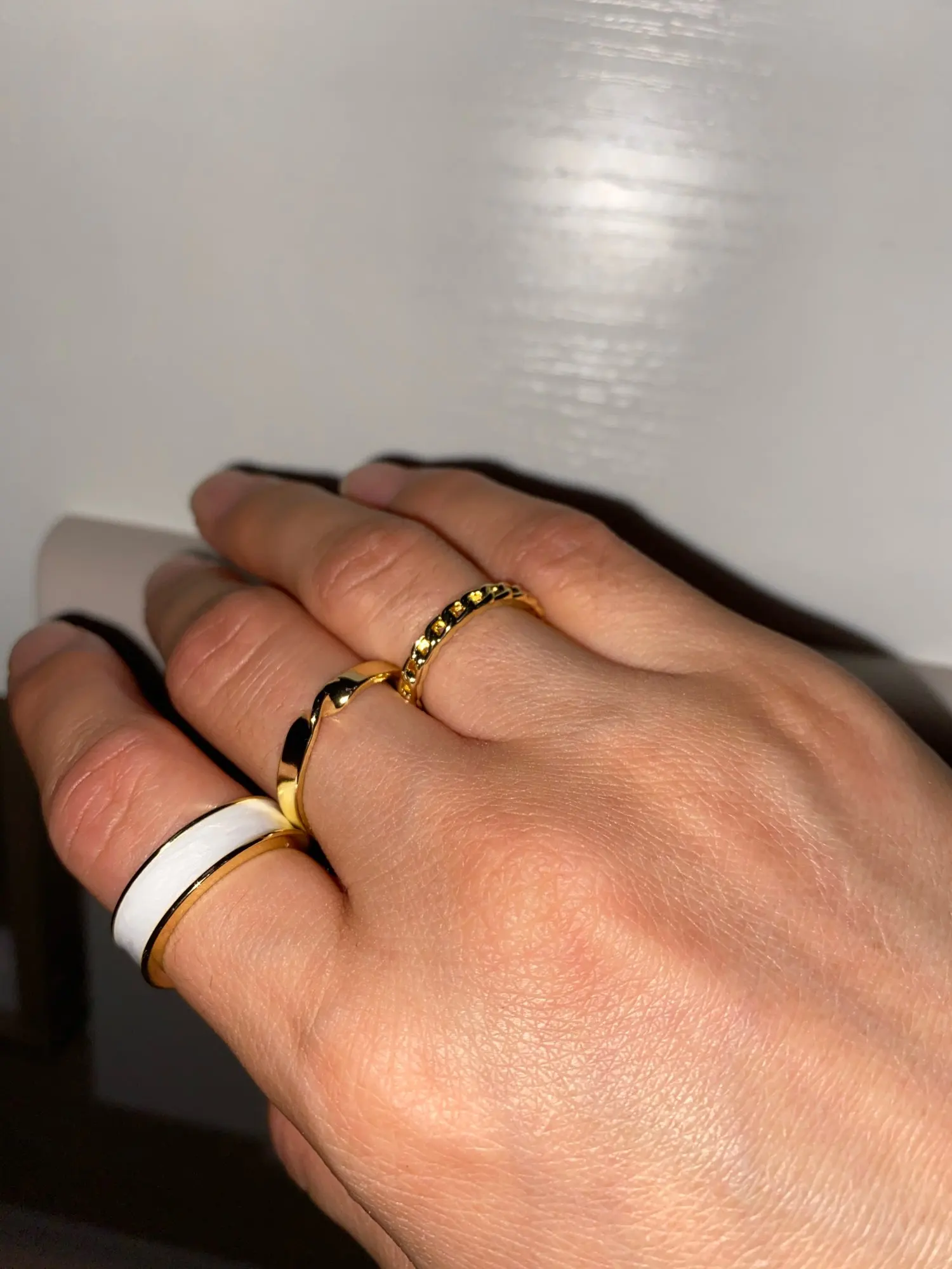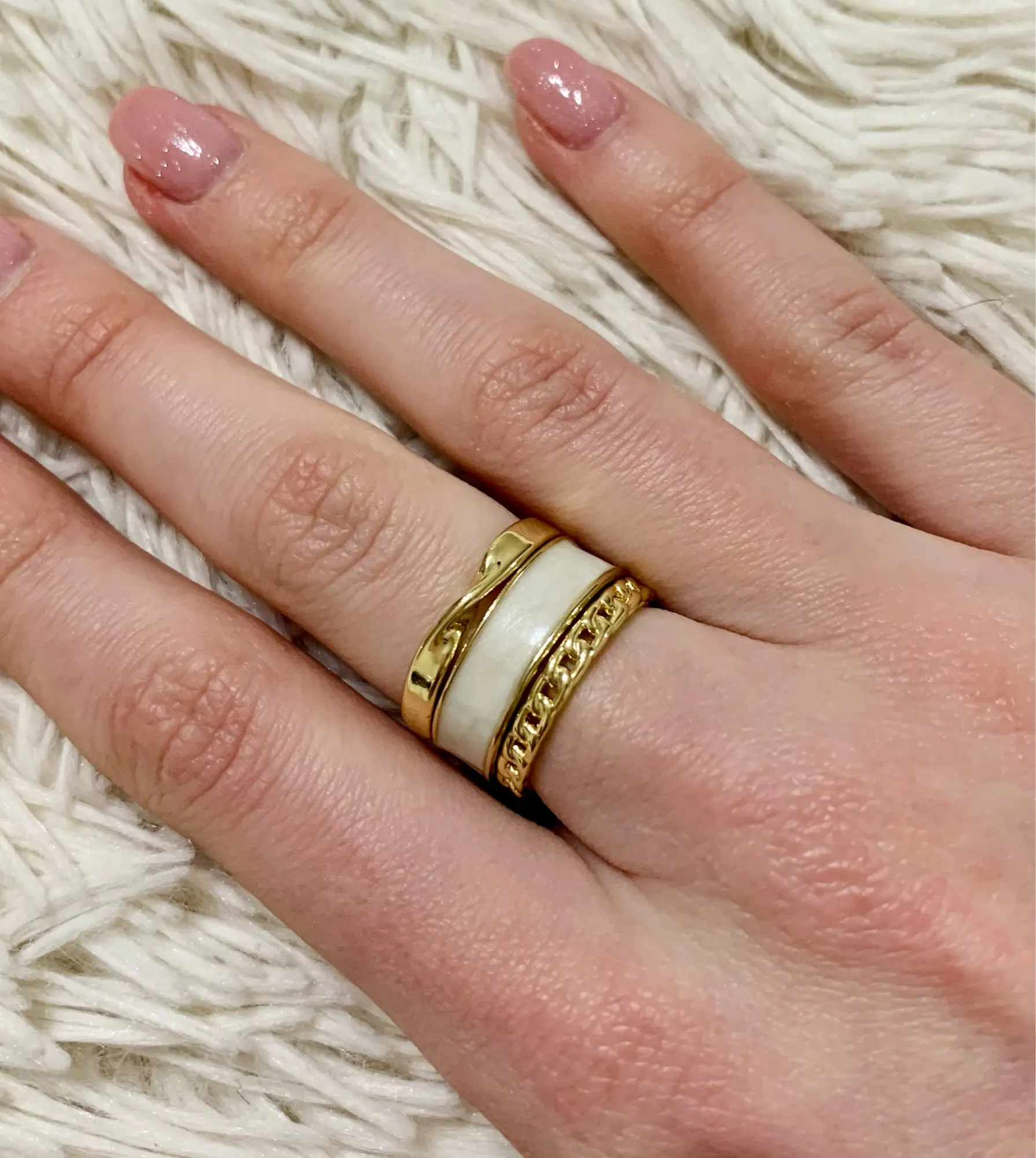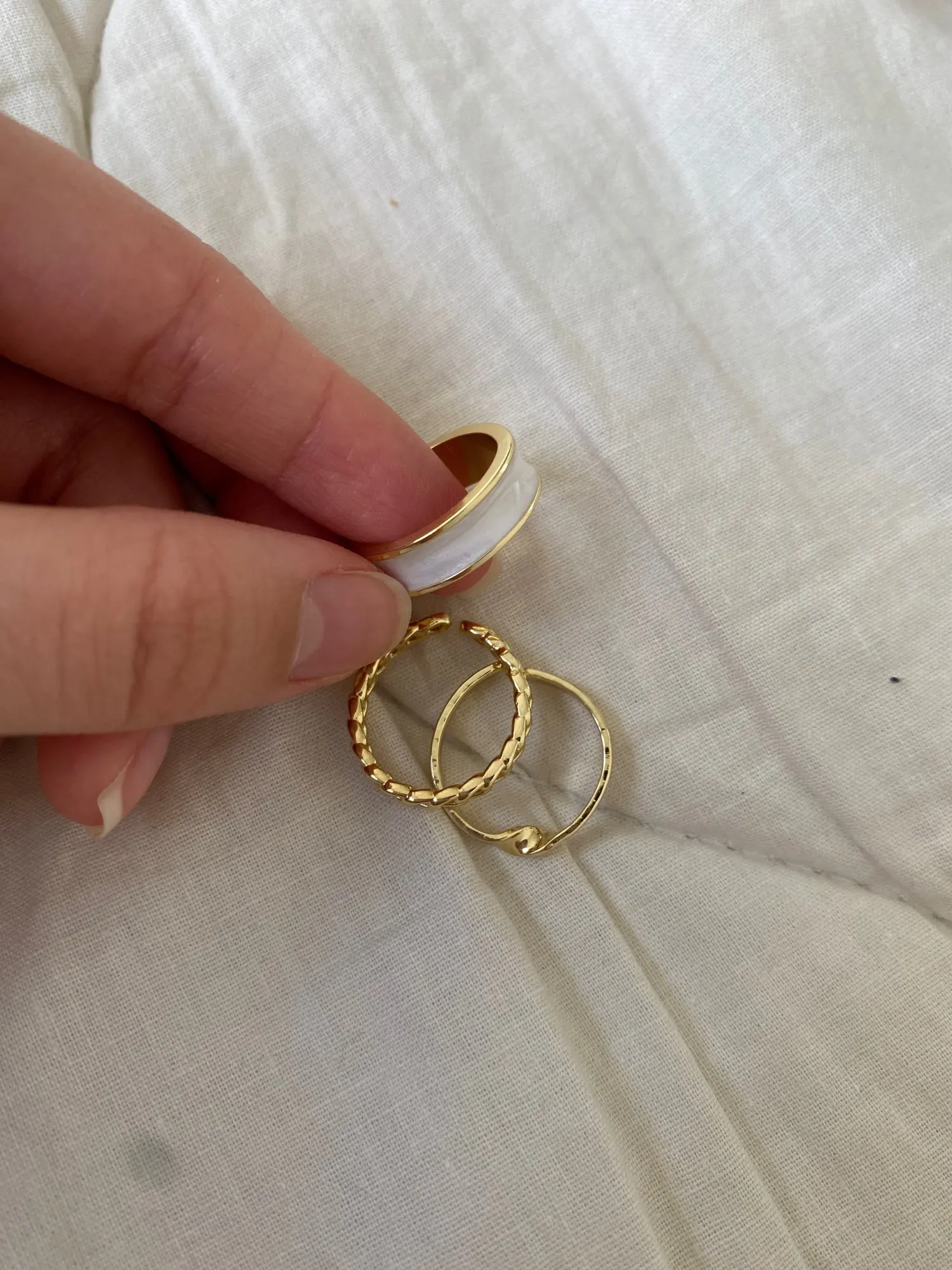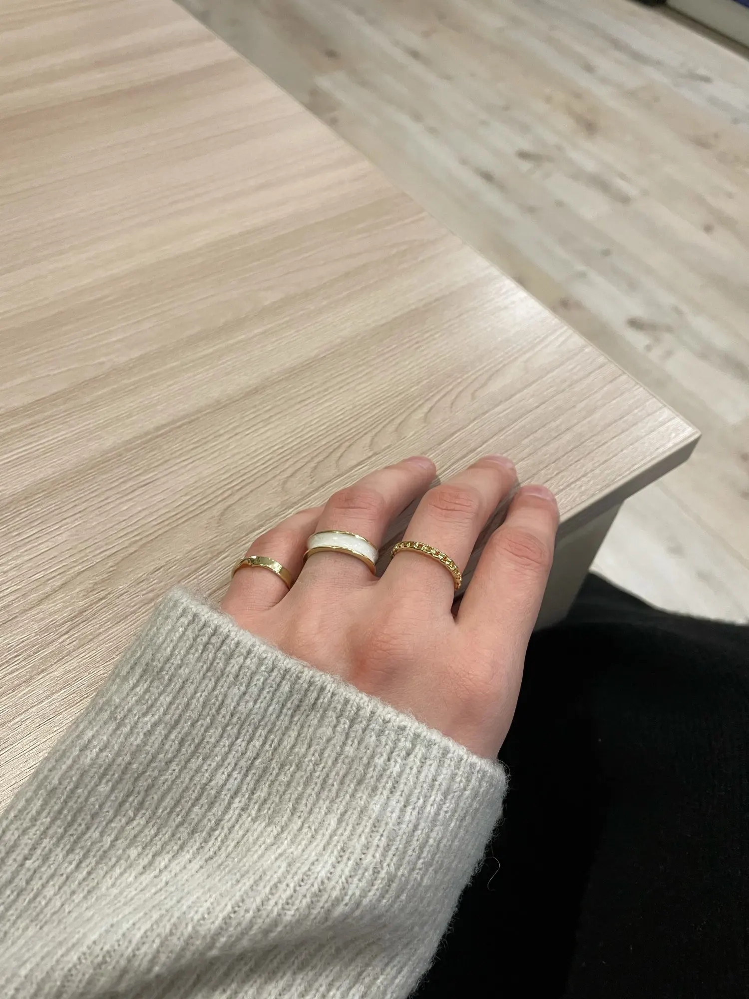 Красивые кольца. Набор из 3 штук. Все разные. Цвет под золото. Довольна. Спасибо продавцу. Рекомендую.