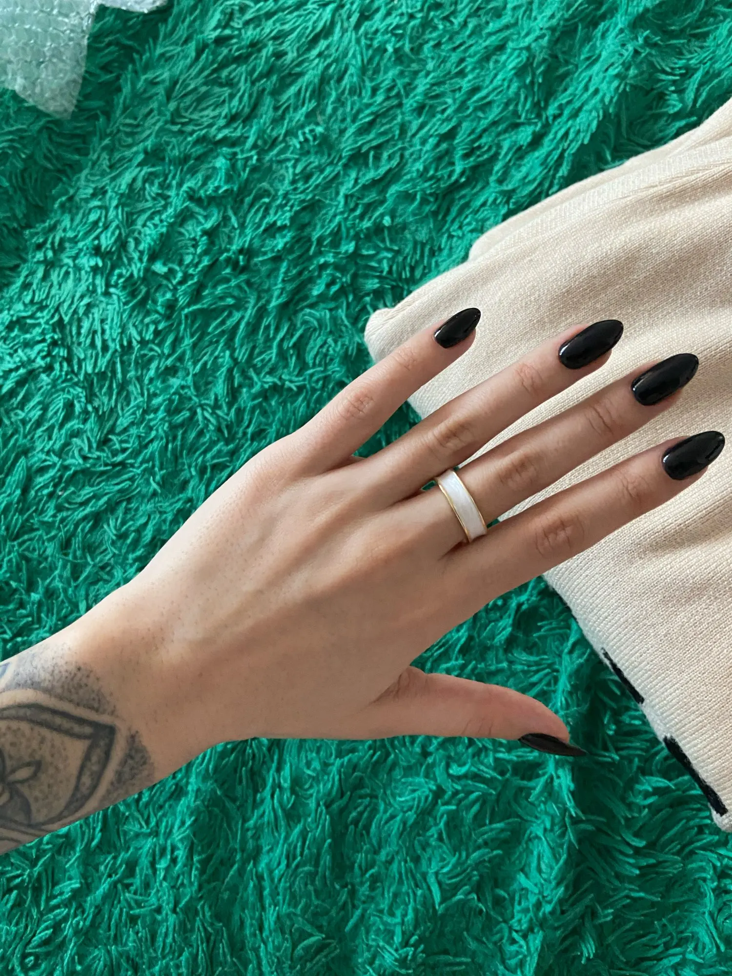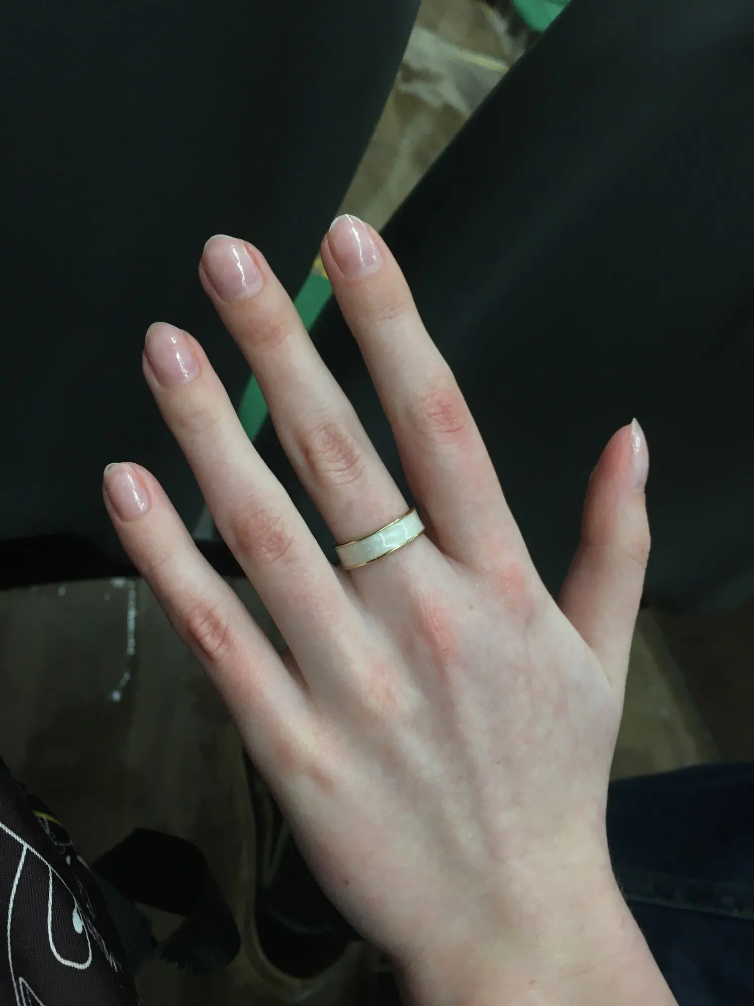Идеальные кольца, размер регулируется. Белое заполнение на одном из колец поблескивает как перламутр, очень красиво) Выглядят дорого