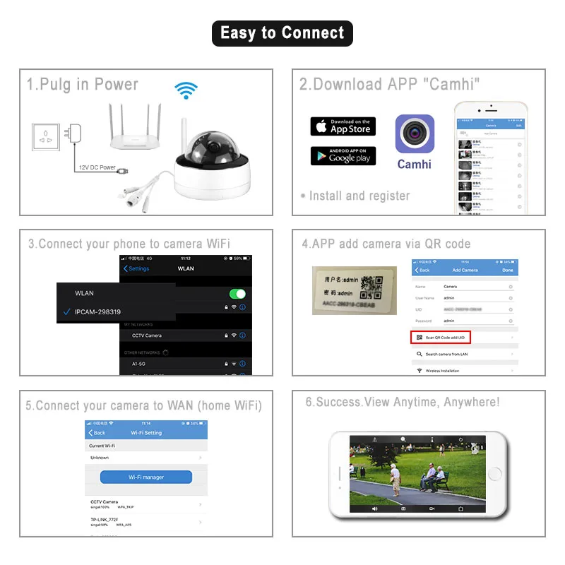 1. Подключите питание.2. Загрузите приложение "Camhi".3. Подключите телефон к камере WIFI.4. Приложение добавляет камеру через qr-код5. Подключите камеру к WAN (домашний WIFI)6. Успех. Просматривайте в любое время и в любом месте!