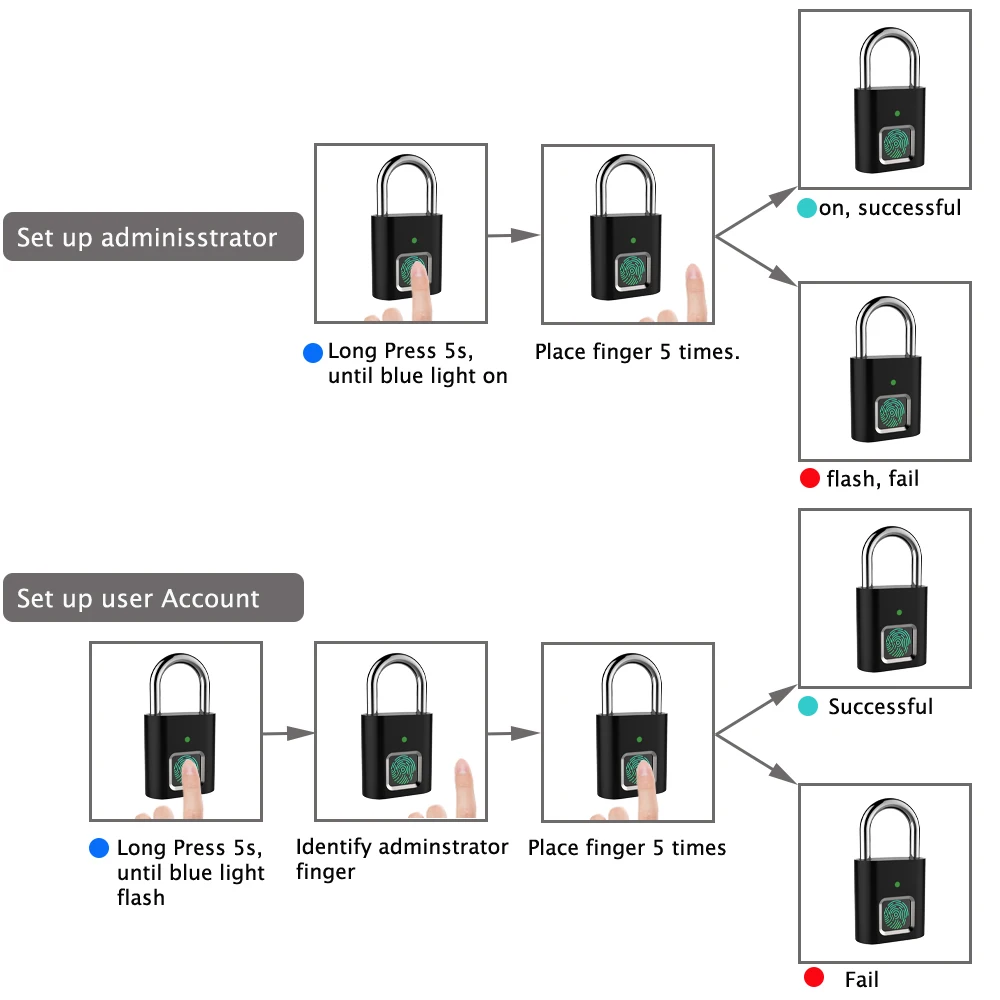 ** Ваш отпечаток пальца-это ваш ключ, всего 1 секундаРазблокируйте и Сэкономьте до 10 отпечатков пальцевВсего (включая 2 администратора).** 2 администратора: Введите первый отпечаток пальца,Должен быть разрешен второй АдминистраторОт первого администратора.