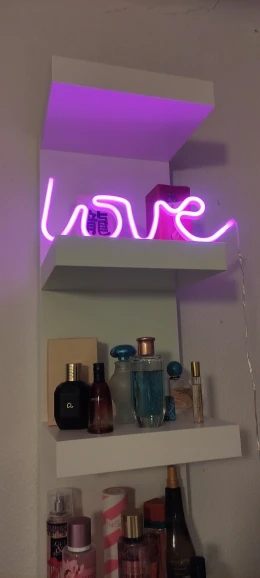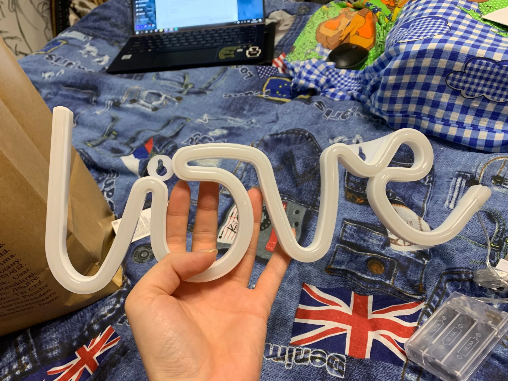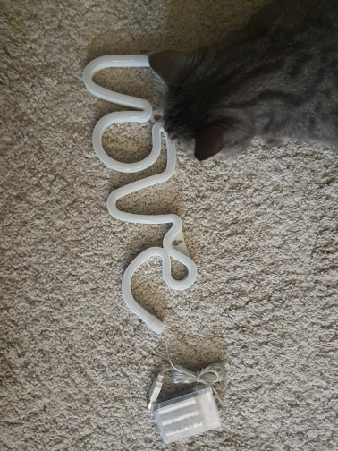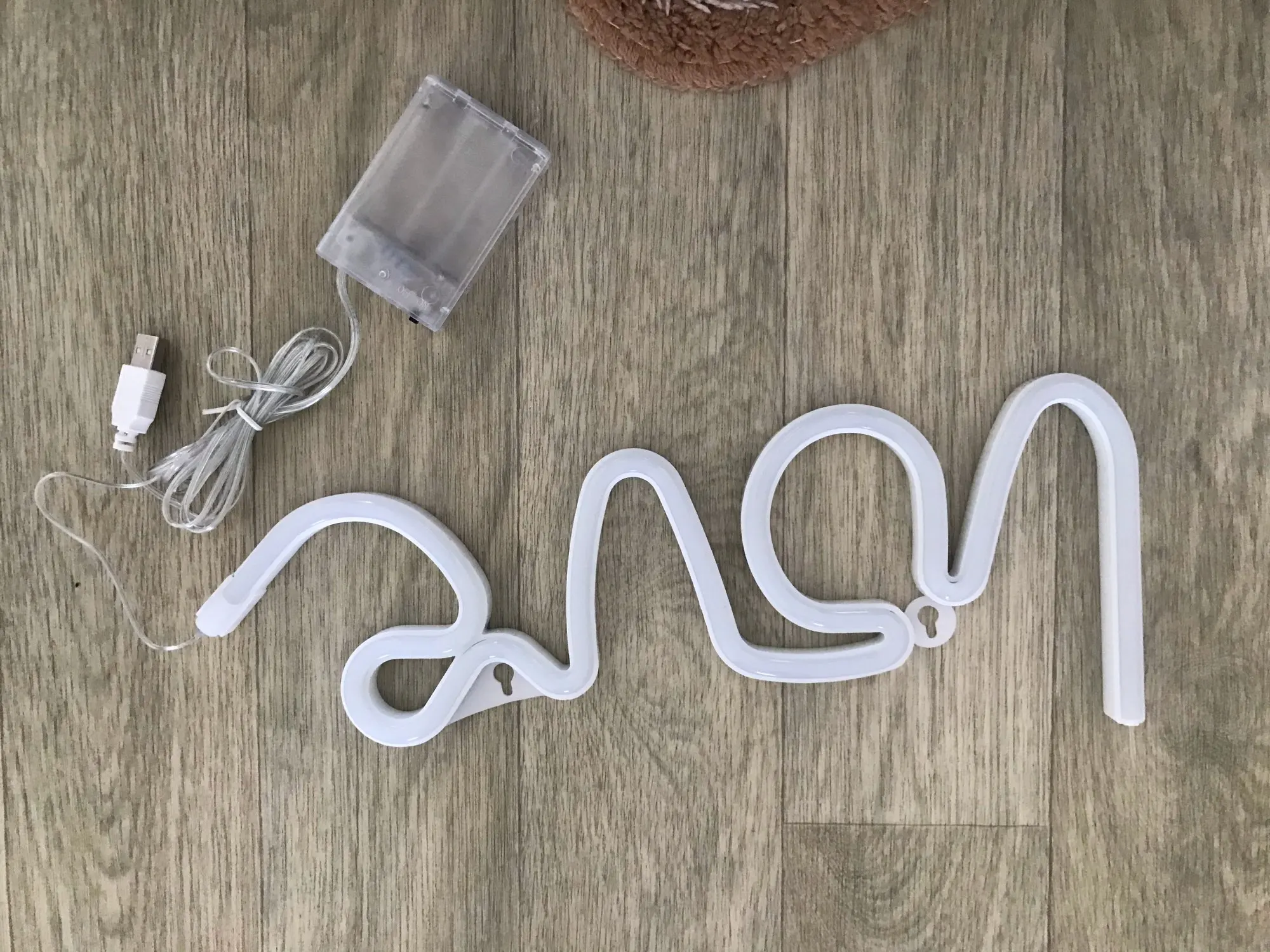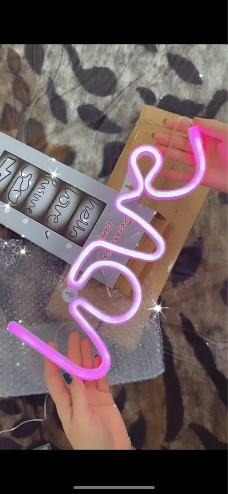 Невероятно потрясающая и красивая неоновая надпись, всю комнату освещает розовый свет. Пока что просто лежит и светиться, позже прикреплю на стену, работает либо от трёх батареек, либо от розетки с Блоком питания, что удобно, если нет батареек. Посылка шла около трёх-четырёх недель, так что пришлось подождать. Спасибо огромное за такую красивую, эстетическую вещь, неоновая подсветка - один из самых атмосферных элементов декора)