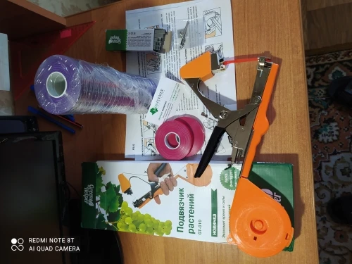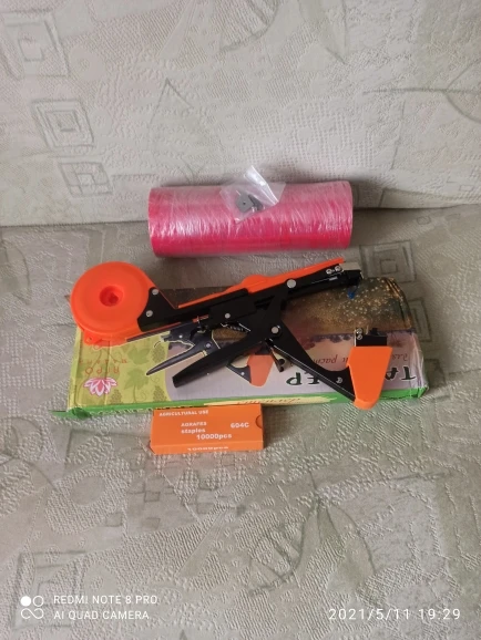 Пришл быстро. Весь в хроме. Заряжен красной лентой. Не сразу разобрался как подцепить ленту в остальном все норм. В использовании надо приноровиться, но какой кайф! Подвязали весь дикий виноград(около12метров) с обоих сторон. У нас полуторометровая сетка завитая виноградом. Он, сука, расползся по сторонам, начал забивать соседние растения, но с помощью этого аппарата мы его компактно уложили и подвязали. С удовольствием и без матюков. Рекомендую. Единственное 2 раза зависал крючек захвата. Видимо надо смазать. В остальном норм.