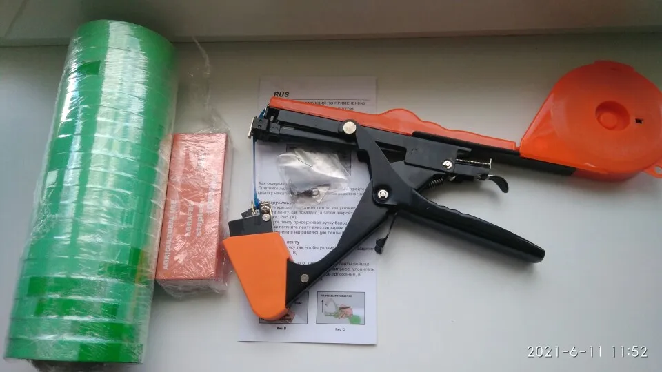 очень быстрая доставка, хороший инструмент. взял комплект с большим запасом ленты и скоб. инструмент работает как часы, подвязывать им гораздо быстрее и удобнее чем веревочками. долго собирался и наконец решился. рекомендую инструмент и продавца, конечно, всё упаковано, инструкция на русском.