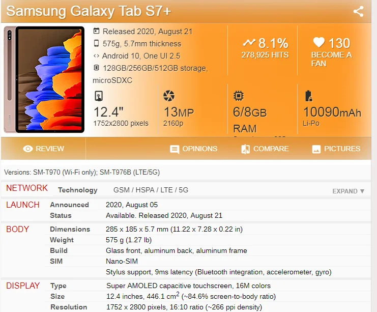 Model Numberfor Samsung Galaxy Tab S7+ (SM-T970/T976B)