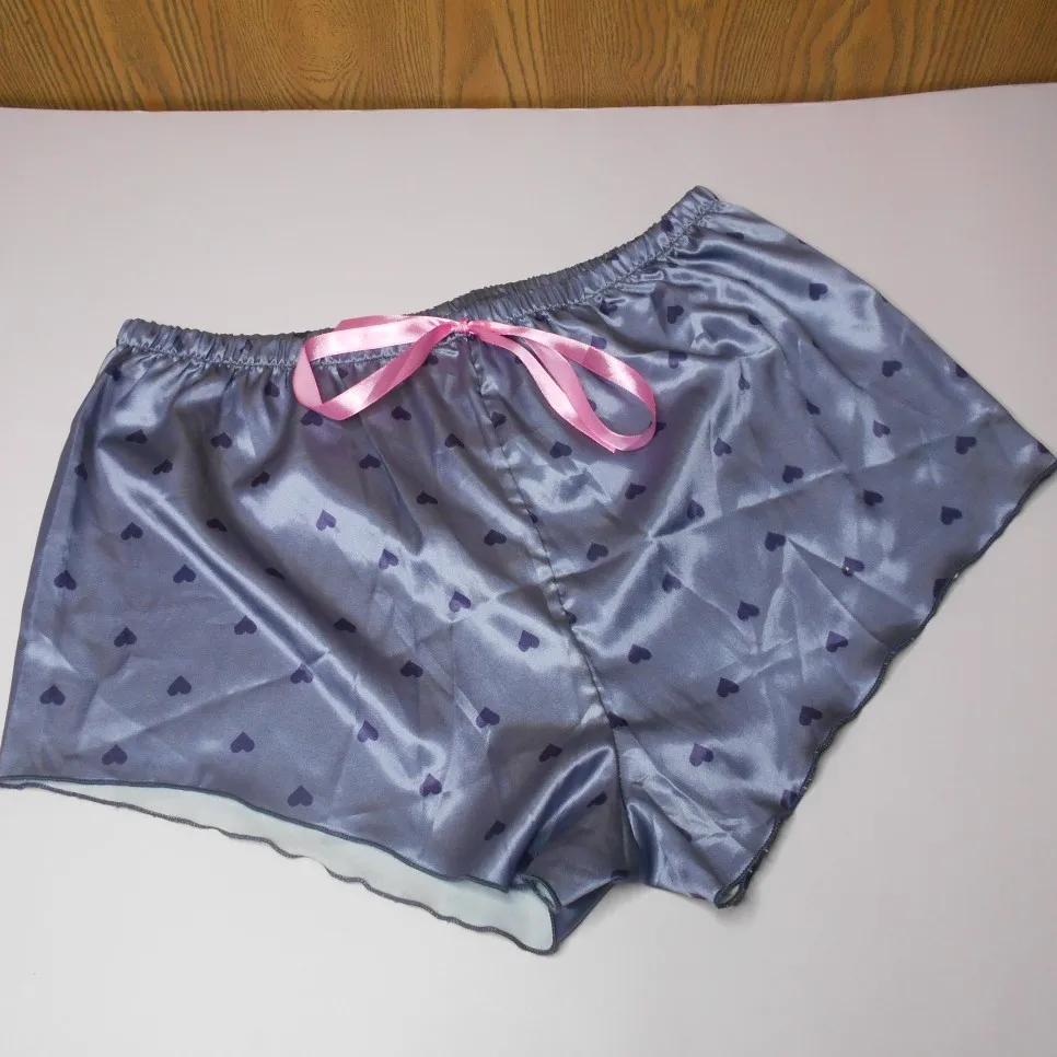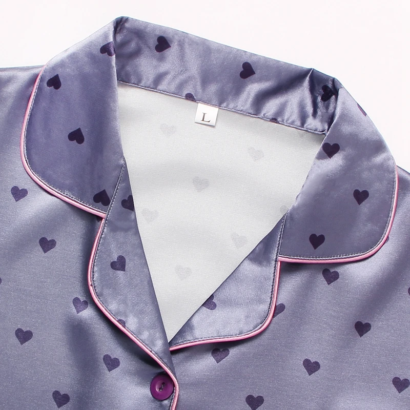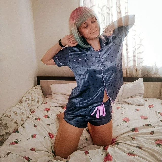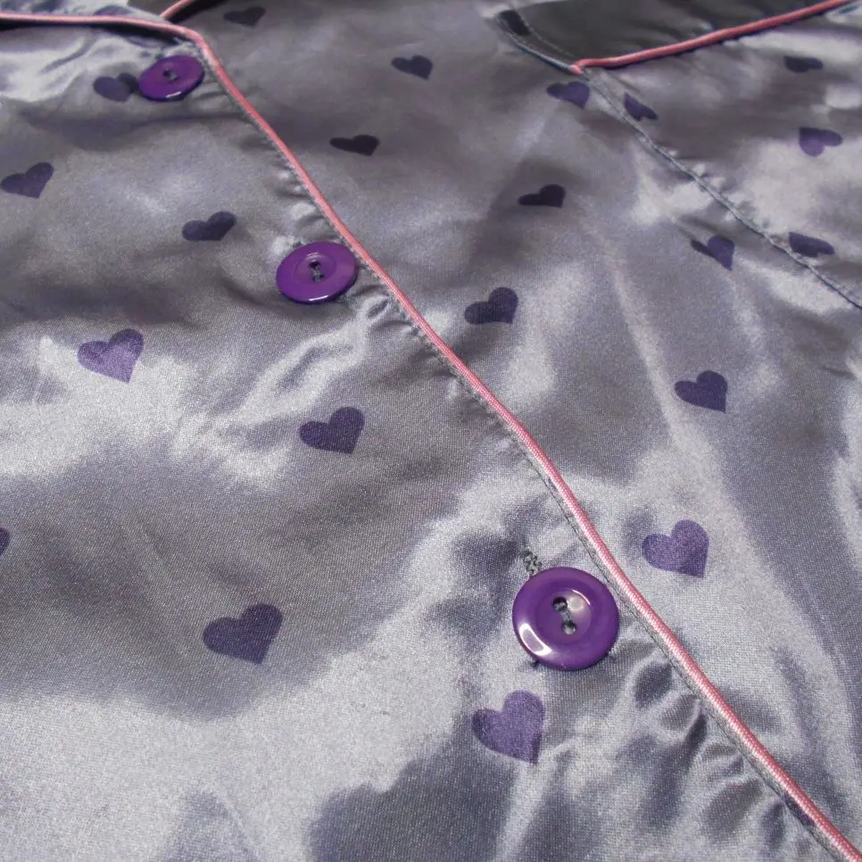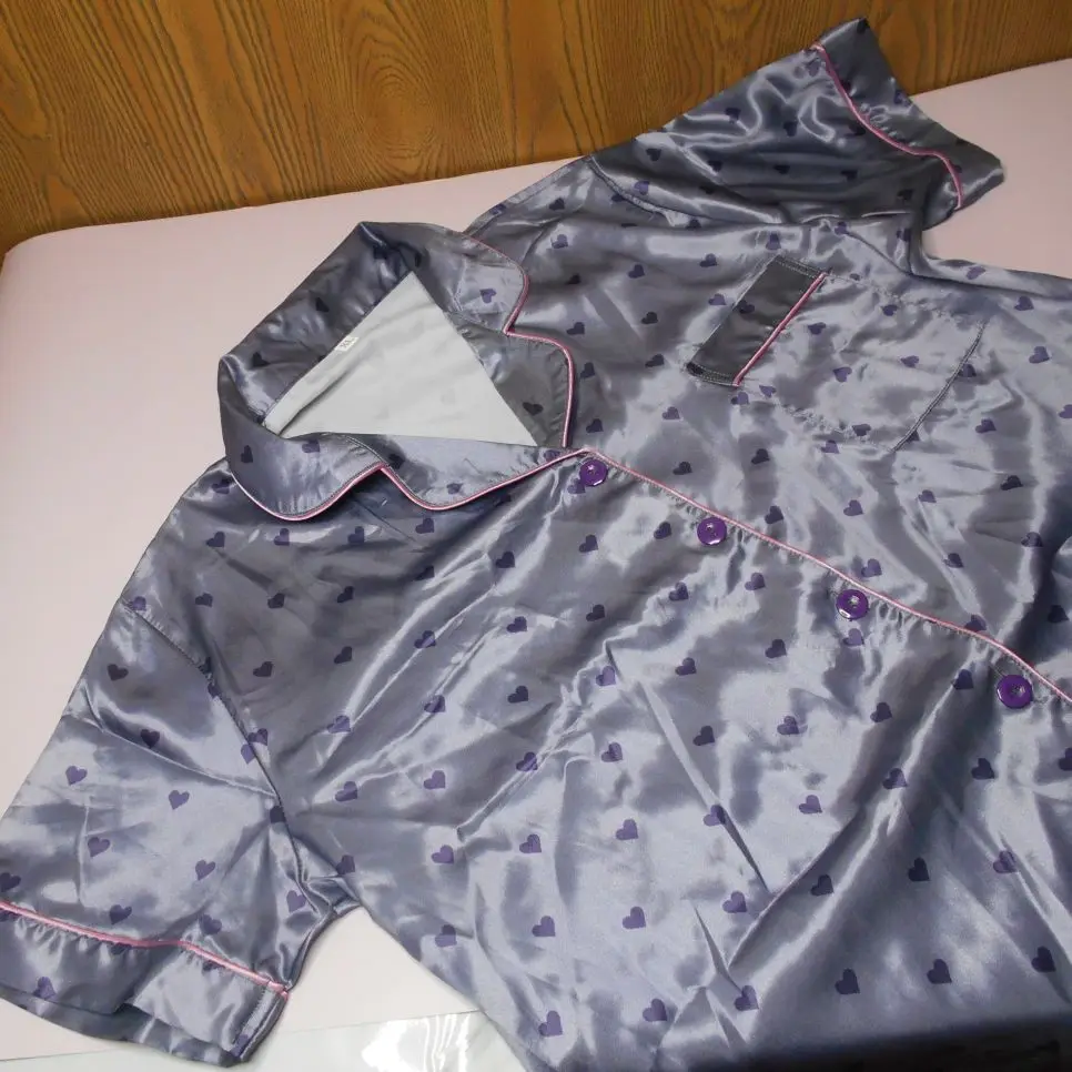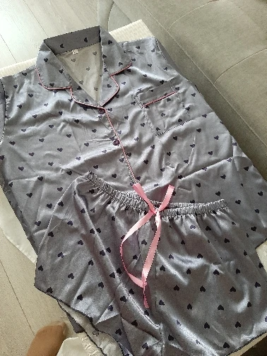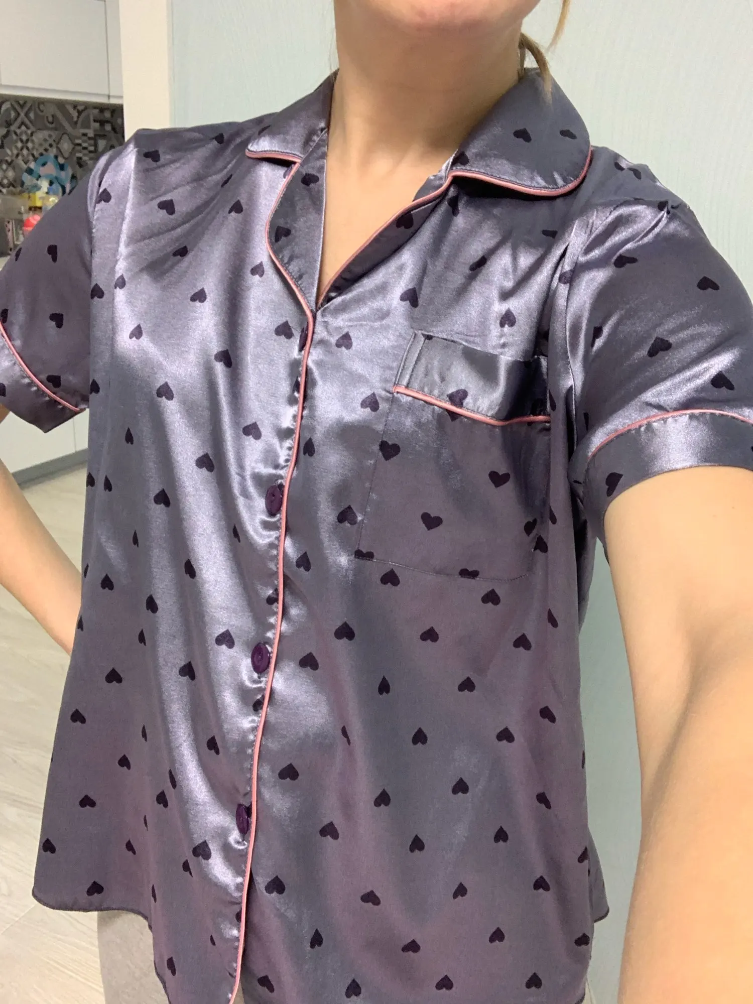 Пижамка двойка. Состоит из рубашки и шортиков. Ткань полиэстер и спандекс . Материал тонкий, но при этом не просвечивает. К телу приятен и совсем не ощутим. Рубашка на пуговичках, есть маленький кармашек с лева на груди. Рукава короткие. Шорты короткие, но удобные. Держатся на резинки, есть декоративная ленточка. Края рубашки и шорт не подшиты, а наметаны специальным швом на машинки. Цвет ткани фиолетово - серый. Есть мелкий рисунок, сердечки, темно фиолетового цвета и такого же цвета пуговицы. По краям рубашки розовые линии и на шортах такая же ленточка. В таком костюмчики можно не только спать, но и ходить по дому. Красиво и удобно. Заказ шел 3 недели. Отслеживался на всем пути. Буду ли я заказывать еще? Однозначно да.