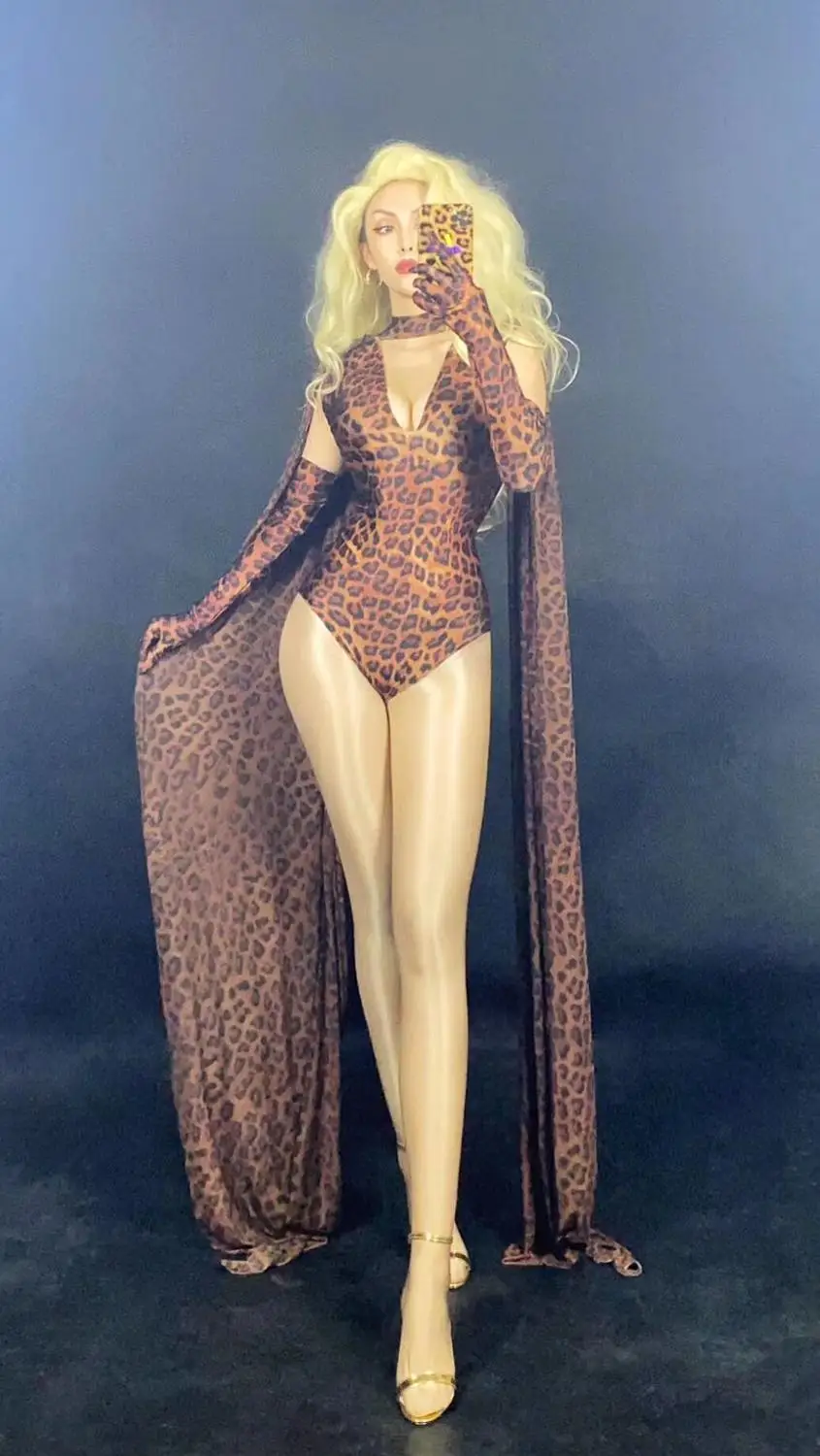 Боди с леопардовым принтом, перчатки, шаль, большой эластичный боди с принтом, Женский танцевальный комплект одежды для бара