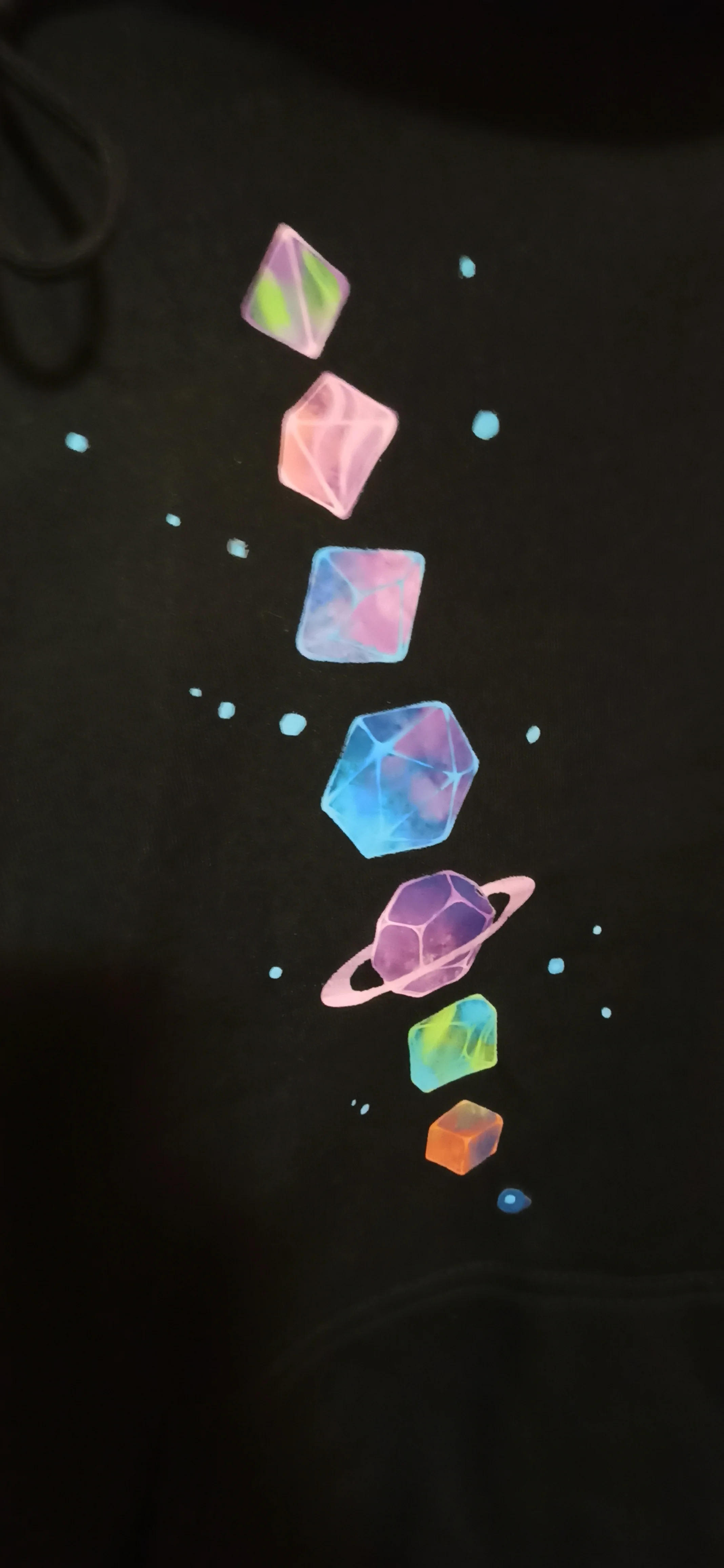Худи пришло быстро, раньше срока. Оно очень приятное к телу, внутренняя сторона обита мягким материалом. Кажется, оно не слишком тёплое, но точно и не совсем тонкое. Бирки с составом не нашлось... Главный минус – качество печати. Это плотные наклейки с очень шакальными краями, местами лишних "пикселов" больше чем нужно, а где-то, как на Сатурне, есть просто непрокрашенная область, имейте это в виду. Дай бог это всё не слетит после первой стирки. По-хорошему тут бы 3 балла поставить, но мне так нравится концепция рисунка, что рука не поднимается Что касается размера – мои параметры: 100/84/73/101, рост 166. Село комфортнейшим оверсайзом, хотя были опасения, что в L размере мужской модели утону, но все отлично. Надеюсь, этот отзыв кому-то поможет с выбором :)