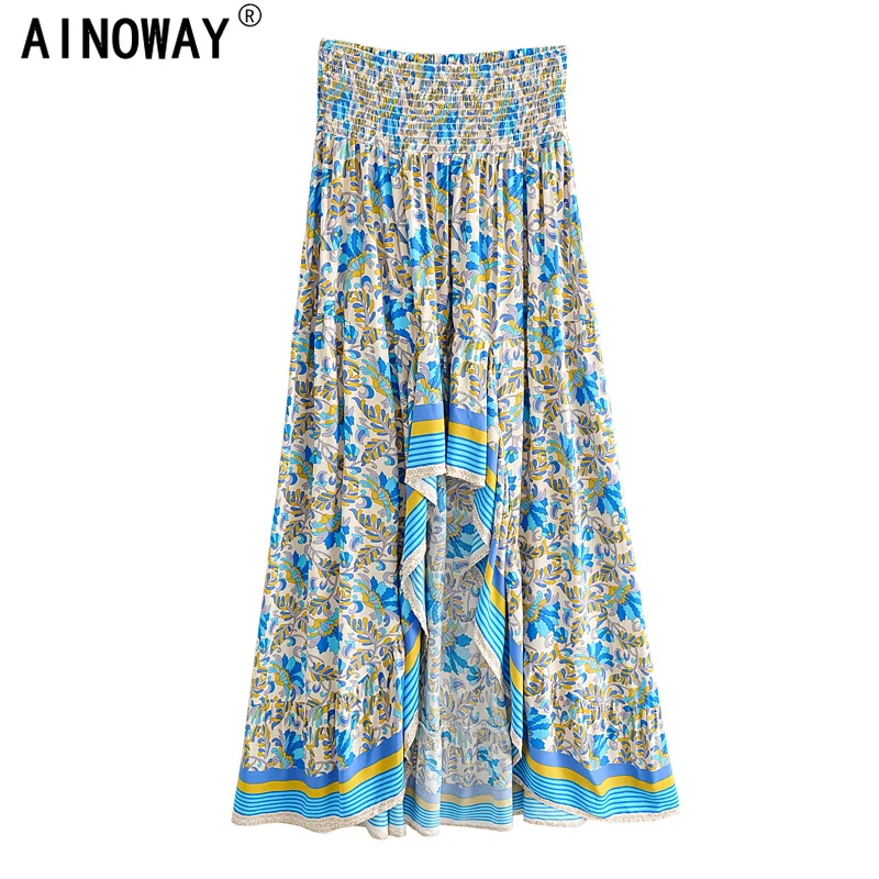 Винтажная шикарная модная женская юбка в этническом стиле с цветочным принтом, Пляжная богемная юбка с высокой эластичной талией, асимметричные макси юбки в стиле бохо для женщин