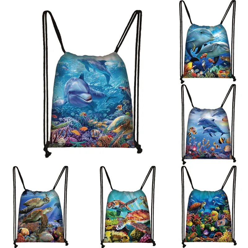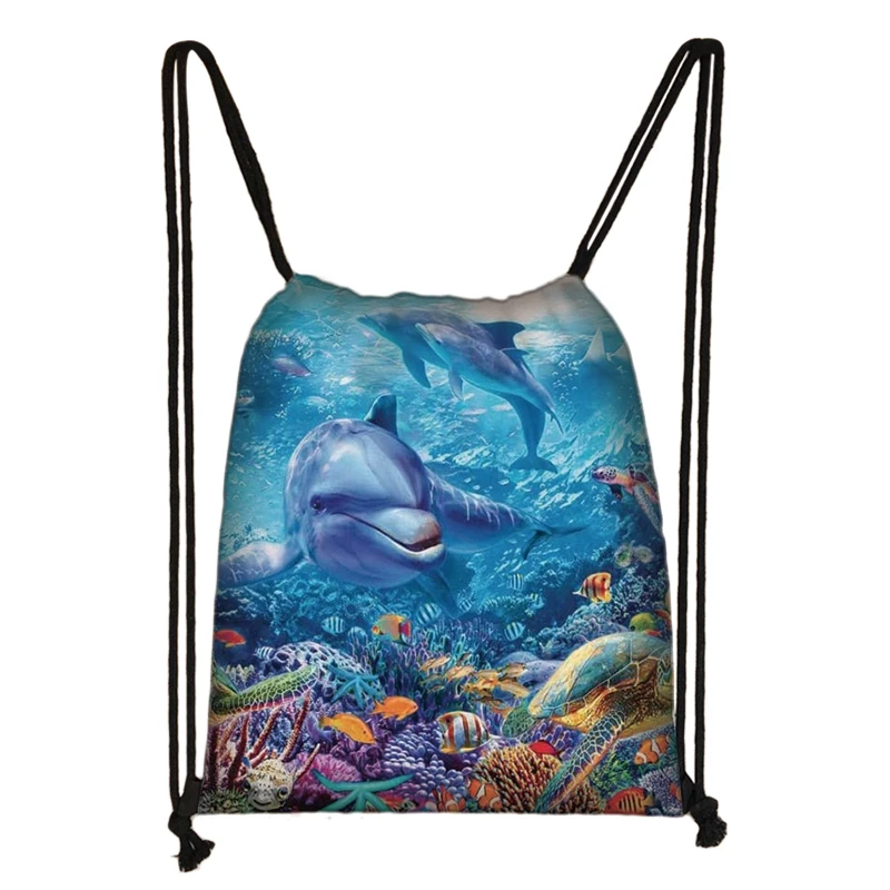 Морская черепаха дельфин дизайн сумка на шнурке женские холщовые мешки для хранения девушек Повседневный Рюкзак книжный мешок обувь держатель женская пляжная сумка