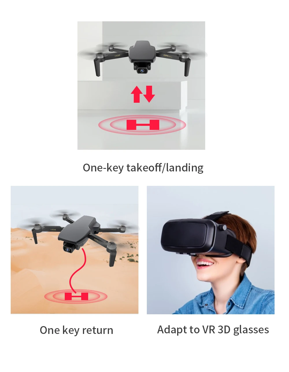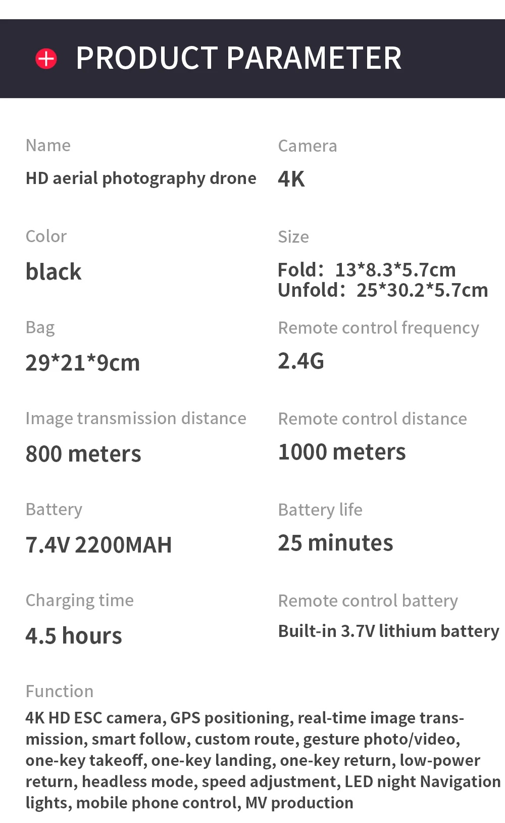 Описание:Размер квадрокоптера23x19x5 см (в разложенном виде) / 13x9x5 см (в разложенном виде)Вес около 201 гМотор 1406 бесщеточный моторМаксимальное расстояние дистанционного управления 1000 мМаксимальное время полета 25 минутМаксимальная скорость полета 7 м/сМаксимальная высота полета 120 мМаксимальная скорость подъема 5 м/сGPS дальность слежения 5-20 мРасстояние съемки жестов около 2 мРабочая частота 5GПозиционирование GPS + ГЛОНАСС + барометрПоддержка мобильных устройств, необходимых вашему Wi-Fi Мобильный телефон для поддержки IEEE 802,11 a/b/g/n/ac, то есть 5G диапазона WLANРекомендуемая конфигурация iOS 8,0 и выше; Android 5,0 и вышеОптимальная конфигурация (поддержка 2k) iOS 9,0 и выше; Android 8,0 и вышеКамера 4K электронная Регулировочная камераУгол обзора 150 °Диапазон вращения шага-90 ° --- 0 °Фокусное расстояние 50X ZOOMРазрешение 4K: 4096*3072PЧастота кадров 25 fpsПередача изображения 1080PРасстояние 600-800 мРазрешение фото/видеоРазрешение фото: 4096*3072Разрешение видео: 2048*1080Изображение на расстоянии 1-5 мЕмкость аккумулятора 7,4 В 2200 мАчВес 80,5 гВремя зарядки 300 минутРабочая частота пульта дистанционного управления 2,4 ГГцМаксимальное расстояние R/C 1000 мБатарея 1,5 В AAA батареяРежим 1 и режим 2 (Переключаемый)Зарядка USBОсобенности:-Двойной режим GPS/ГЛОНАСС-4K HD регулируемая камера-Передача изображения Wi-Fi на большие расстояния 5G-Режим позиционирования оптического потока-Передача изображения в реальном времени-Интеллектуальное следование-Объемный полет-Путевой полет-Траектория наведения полета-Складной портативный фюзеляж-Возврат одной кнопкой-Взлет/посадка одной кнопкой-Съемка жестов-Дистанционное управление фото-и видеозапись-Бесщеточный двигатель-Переключатель скорости-Электрический забор-Функция извлечения самолета-Функции мВ: фильтры, видеоэффекты, добавление фоновой музыки, обмен картинками/видео-Сверхлегкий вес около 229 г: регистрация не требуется, что соответствует требованиям безопасности микро-дронов в большинстве стран и регионов
