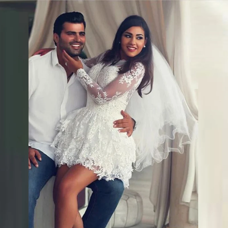 Новые винтажные короткие кружевные свадебные платья с длинным рукавом, иллюзия, вырез лодочкой, свадебные платья с аппликацией для невесты, длина мини