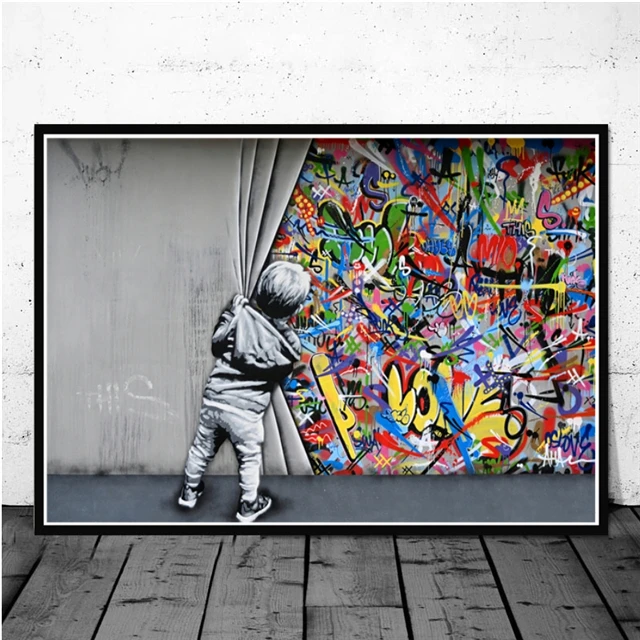 Холщовый постер Бэнкси стрит с изображением граффити за занавеской ...